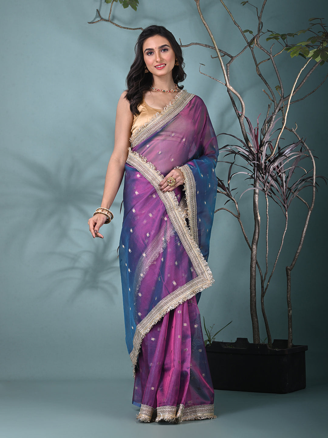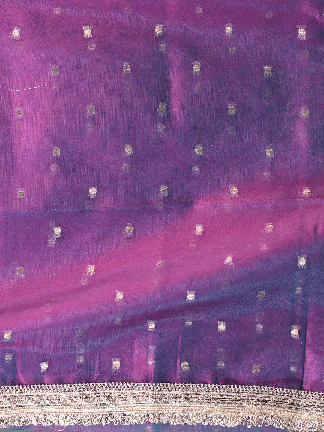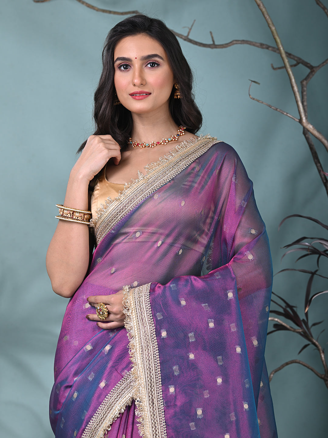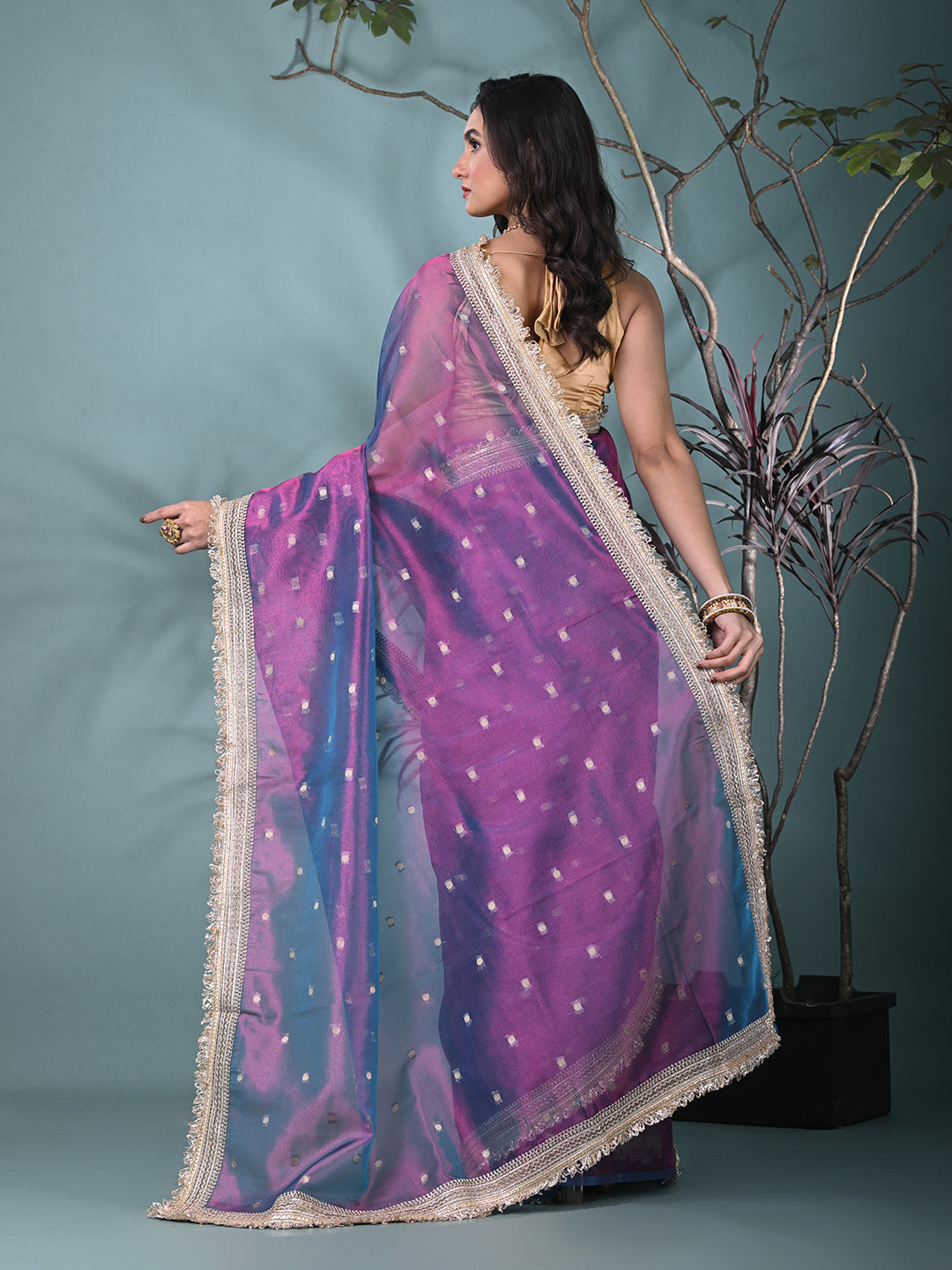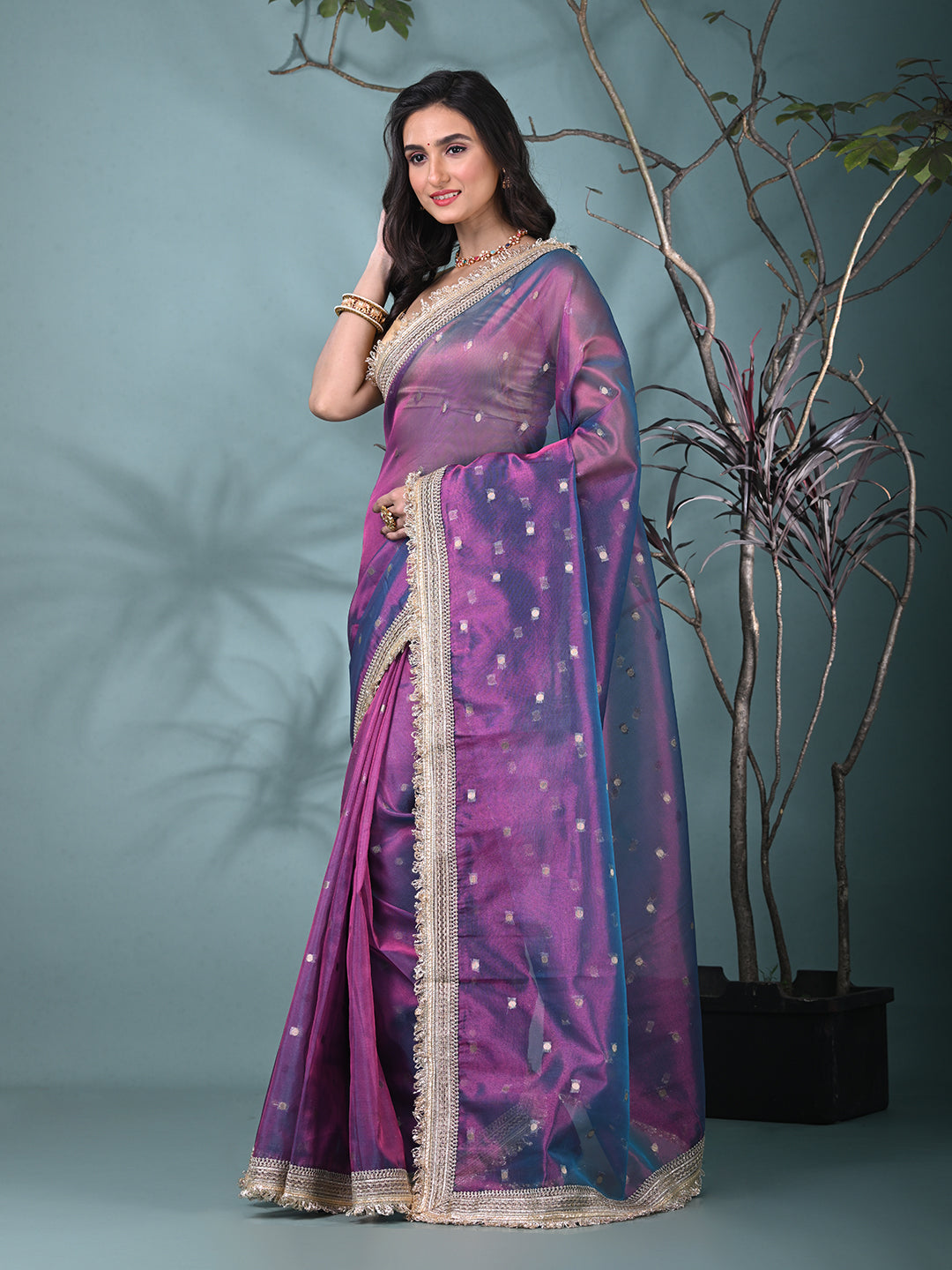 Elevate your festive wardrobe with this stunning purple tissue saree, designed to captivate attention at any special occasion. Crafted from premium tissue fabric, this saree offers a graceful sheen and lightweight feel, perfect for celebrations. The intricate Gotapatti work along the borders adds a touch of traditional elegance, making it a standout piece for weddings, parties, and cultural events. The saree is designed with timeless appeal, featuring delicate motifs throughout the fabric that enhance its charm. The contrasting golden-hued border with Gotapatti embroidery brings a sophisticated richness to the overall look. Pair it with a chic blouse and statement accessories for a complete ensemble that blends modern flair with classic artistry.
