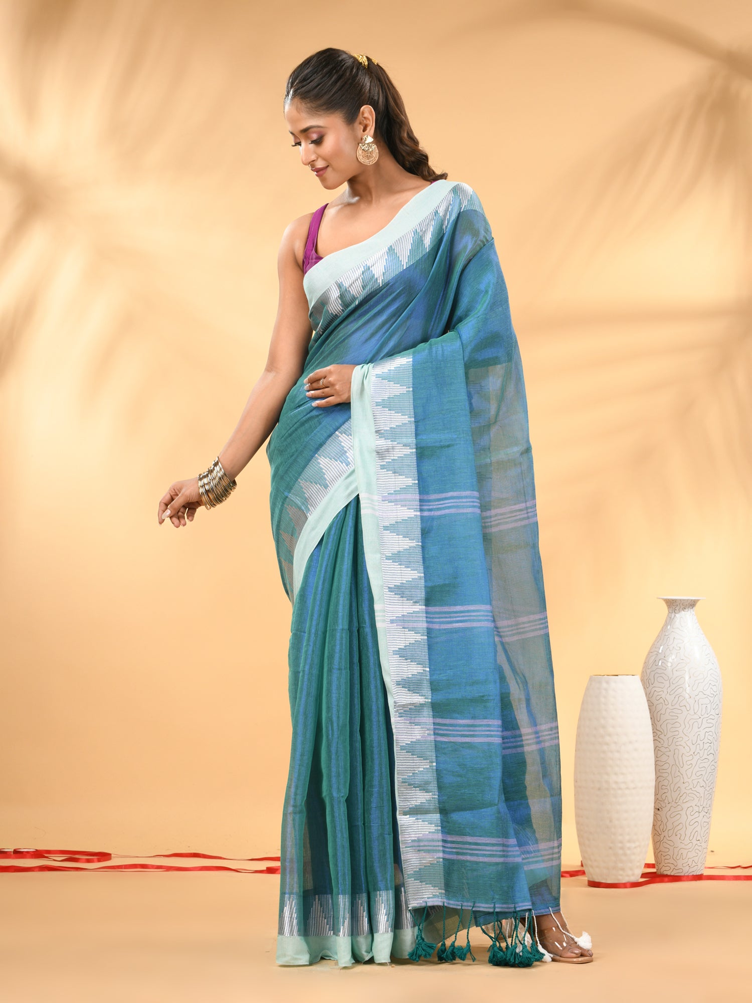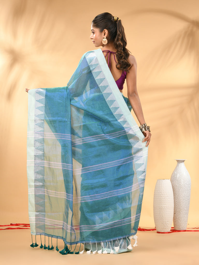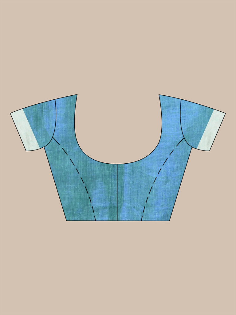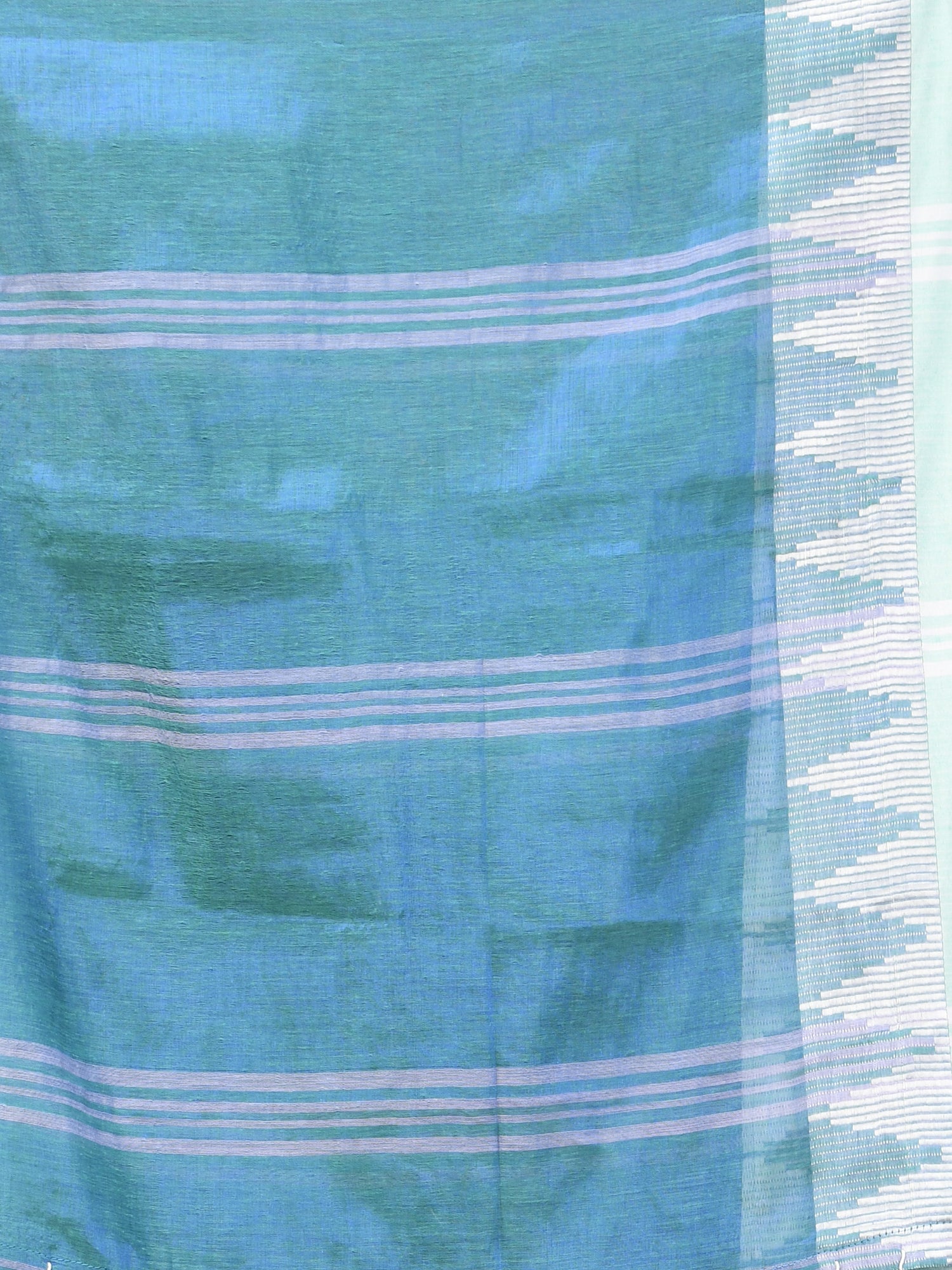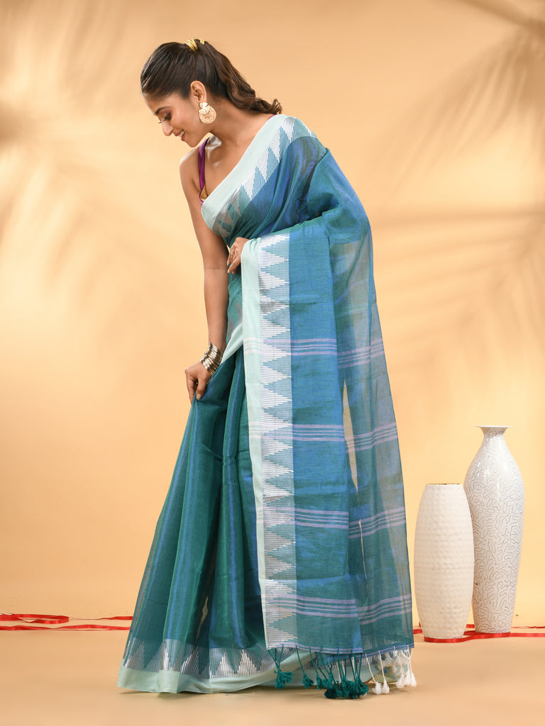 Drape yourself in sheer elegance with this sea green tissue saree highlighted with a stunning white woven border. The lightweight and slightly glossy tissue fabric gives the saree a rich texture and a graceful fall. The saree features contemporary geometric woven motifs on the border and pallu, adding a modern ethnic touch to its traditional look. The shimmering silver zari-like detailing on the pallu and border enhances the overall appeal, making it perfect for festive occasions, evening parties, or family celebrations.