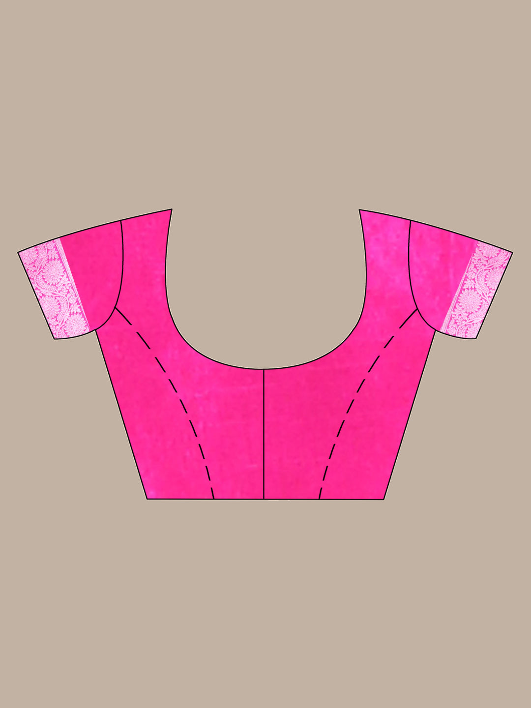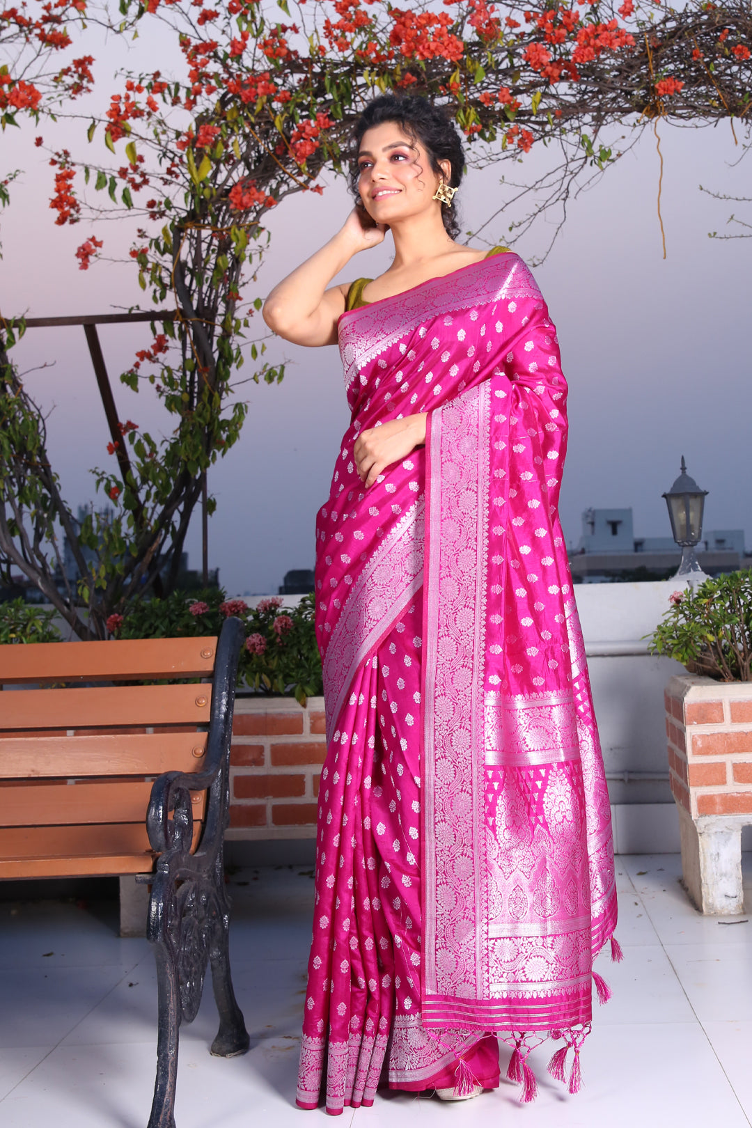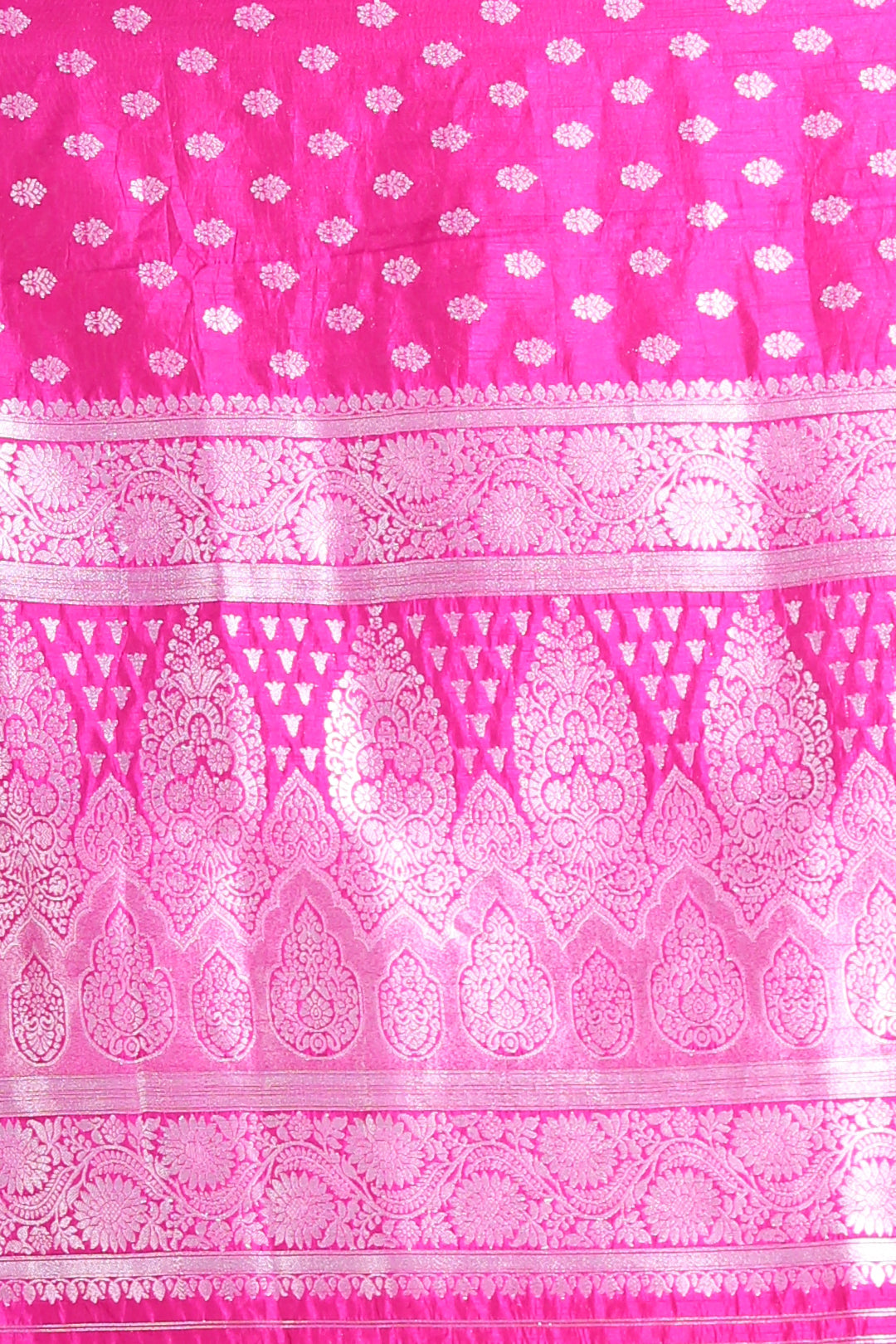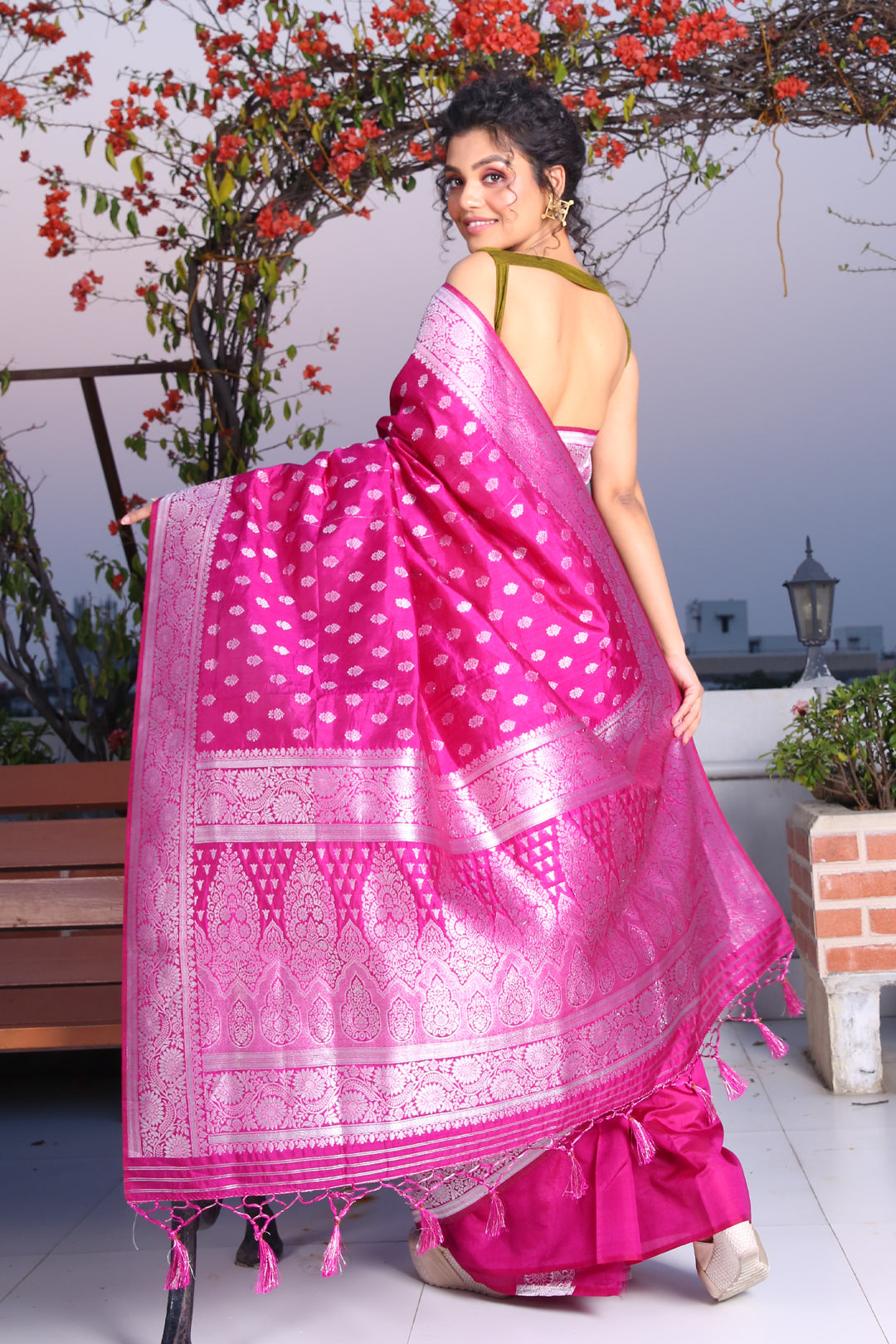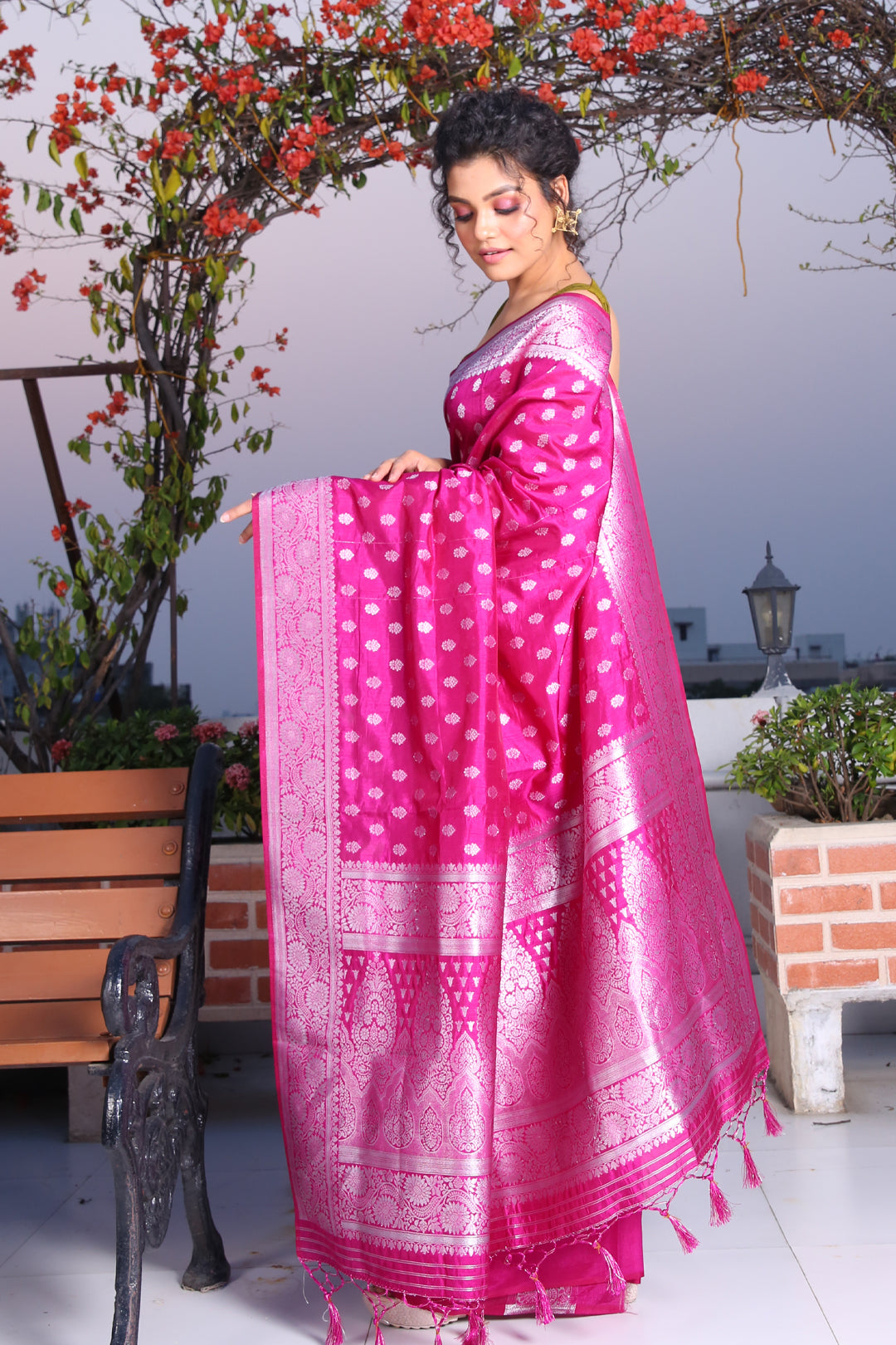 Get a youthful look in this fuchsia brocade silk saree. It has small woven buttas all over. The pallu has an intricate meshwork of designs an the borders have floral patterns for a lovely look.