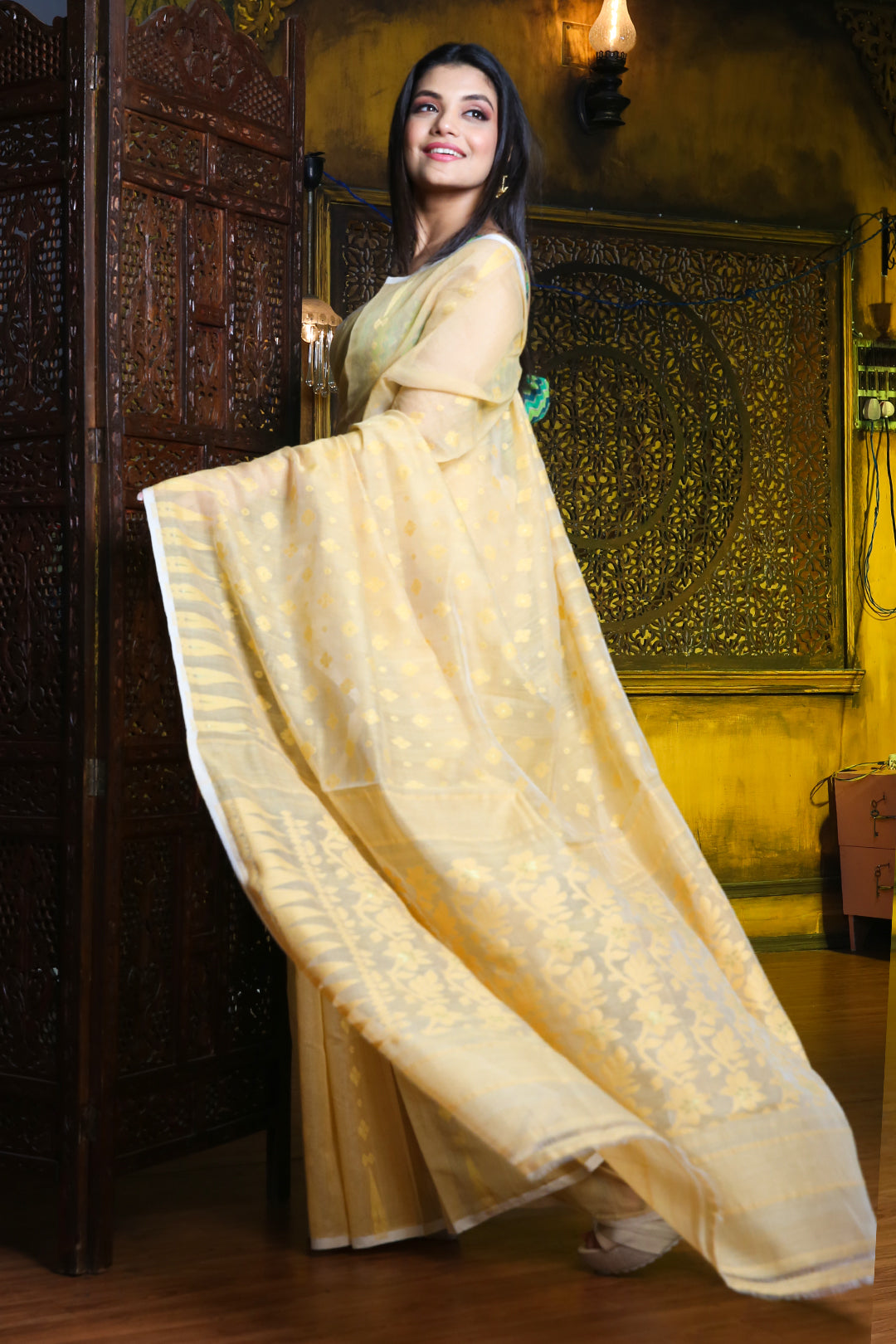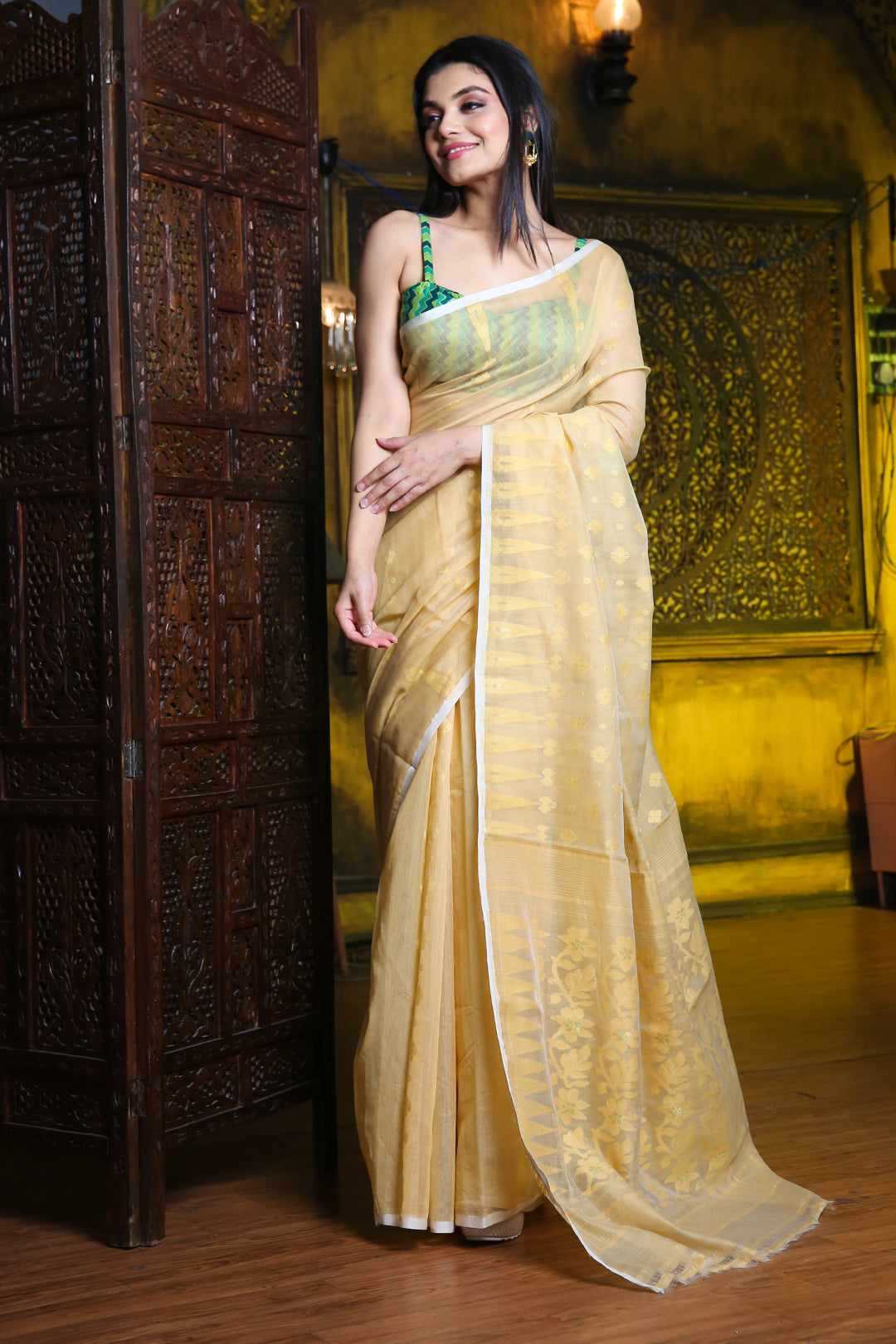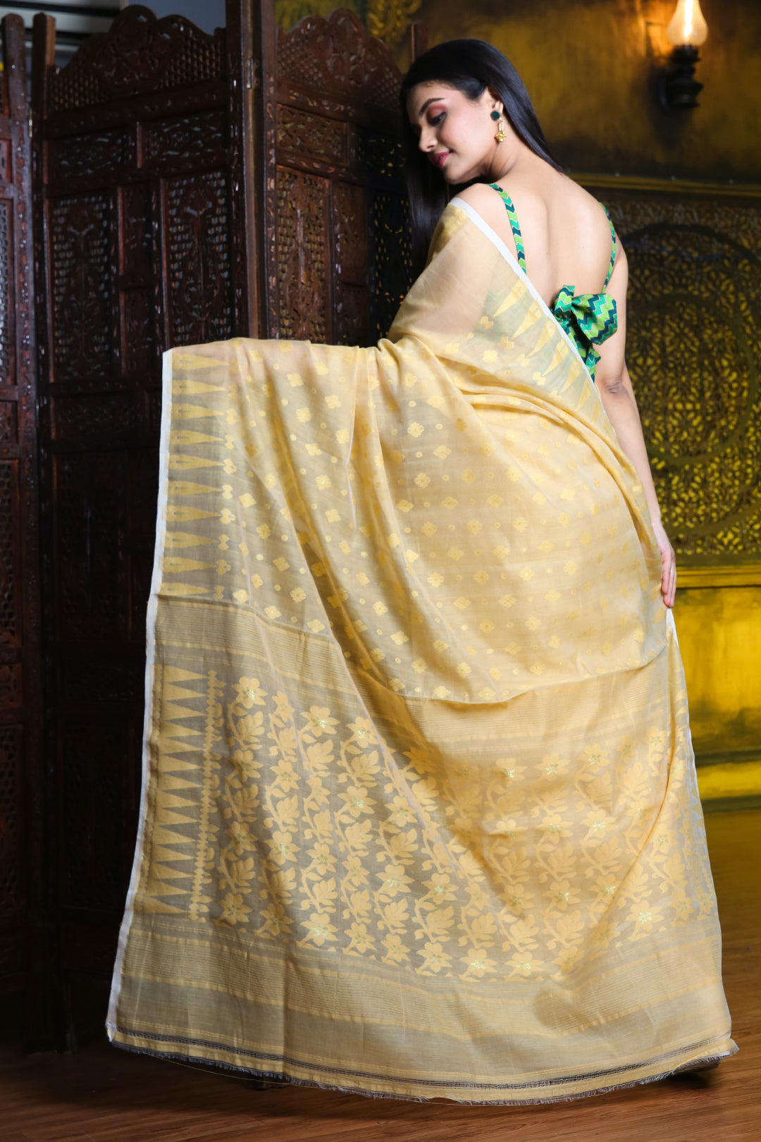 Look classy in this beige silk cotton jamdani saree. It has temple motifs woven along the borders. The whole body has woven motifs. The pallu has floral designs detailed with zari to complete the look.