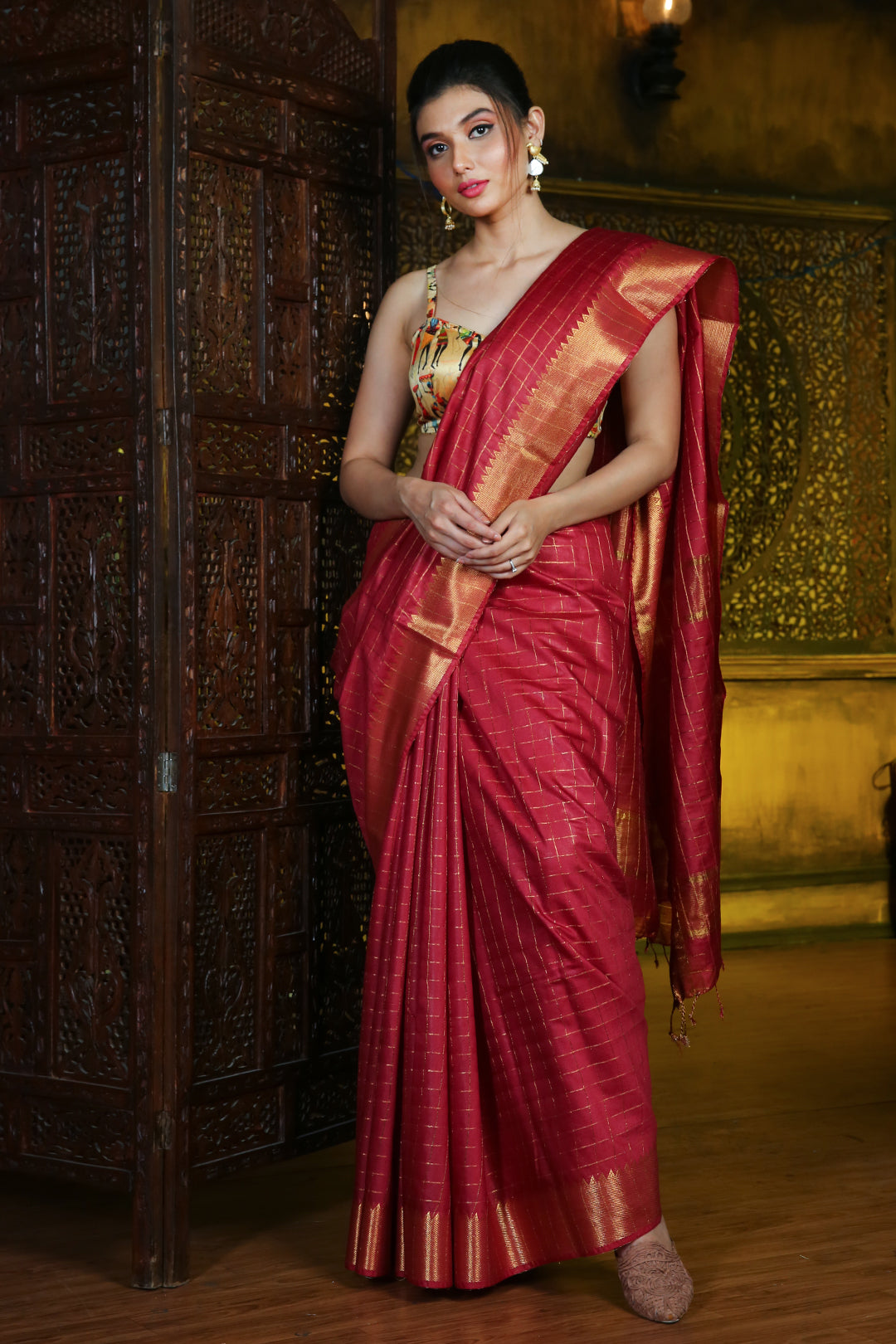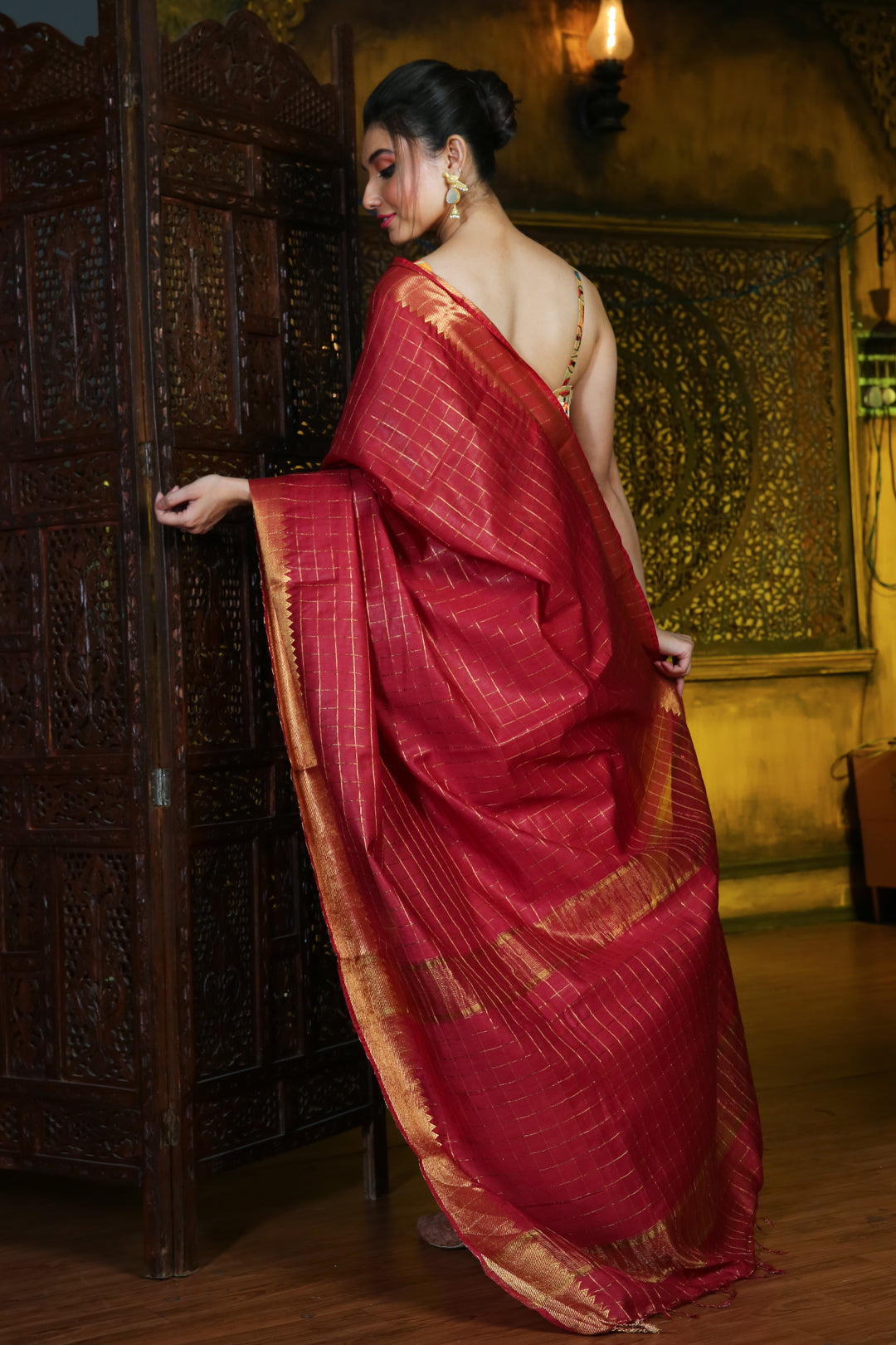 Look bold and loving in this dark red silk blend saree. It has zari borders with temple patterns. Checkered designs are woven all over the saree and pallu. The pallu has two bold stripes to complete the look.