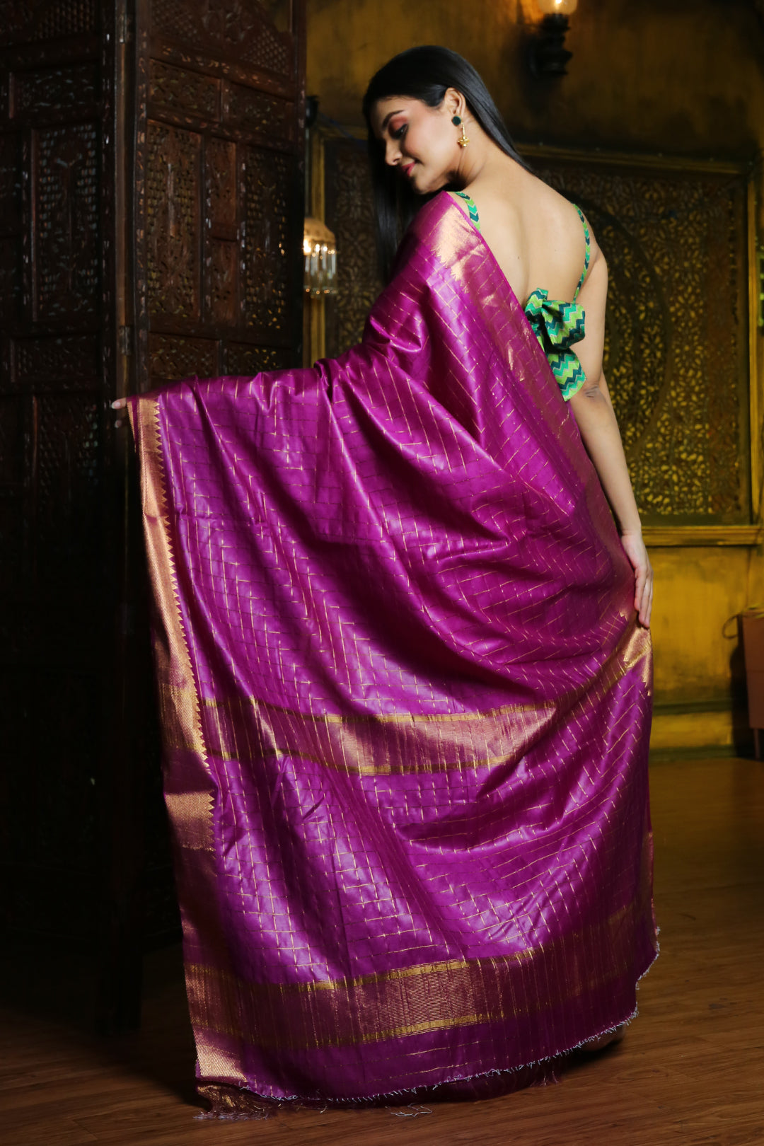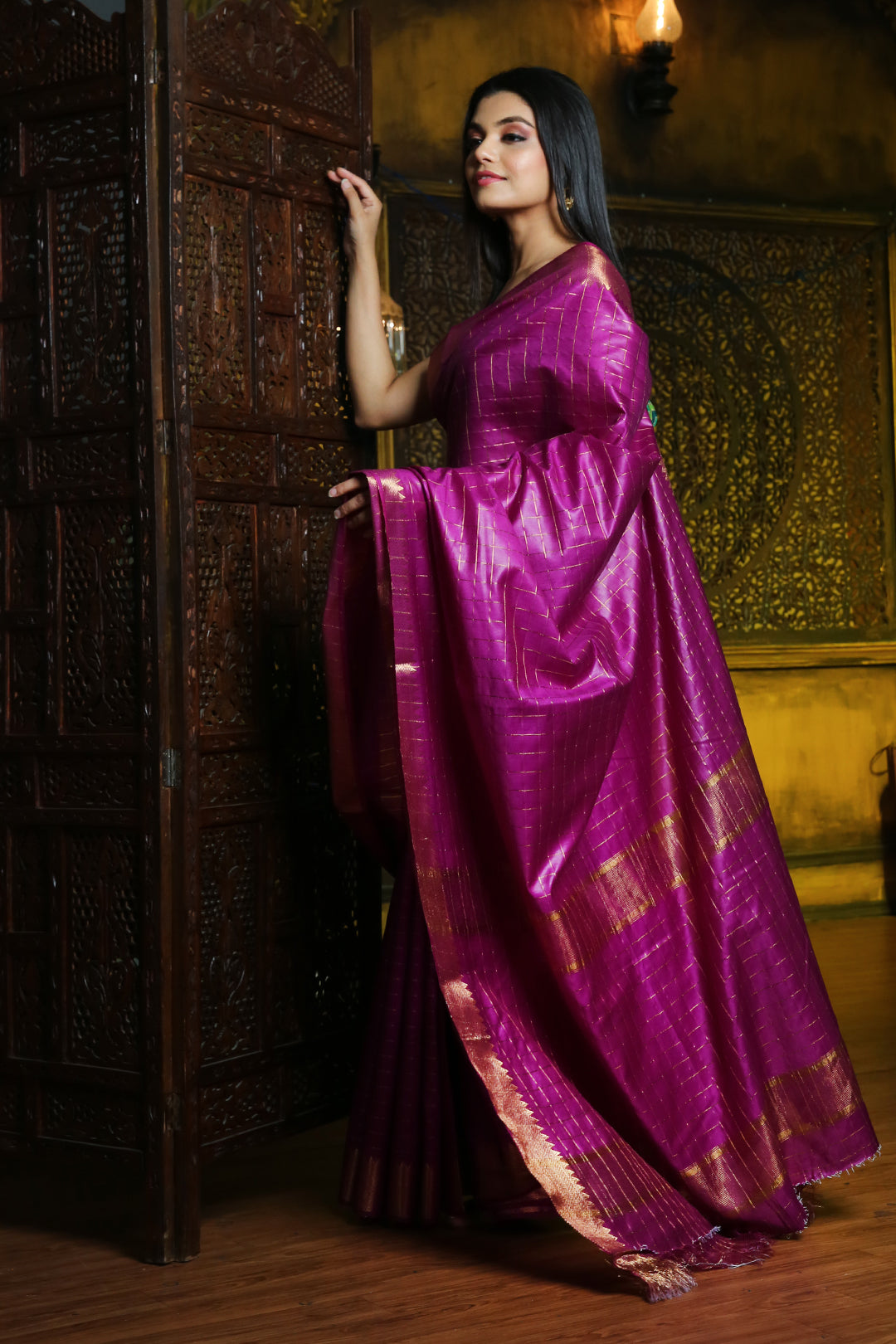 Youthfully loving is what you will look in this purple silk blend saree. It has zari borders with temple patterns. Checkered designs are woven all over the saree and pallu. The pallu has two bold stripes to complete the look.