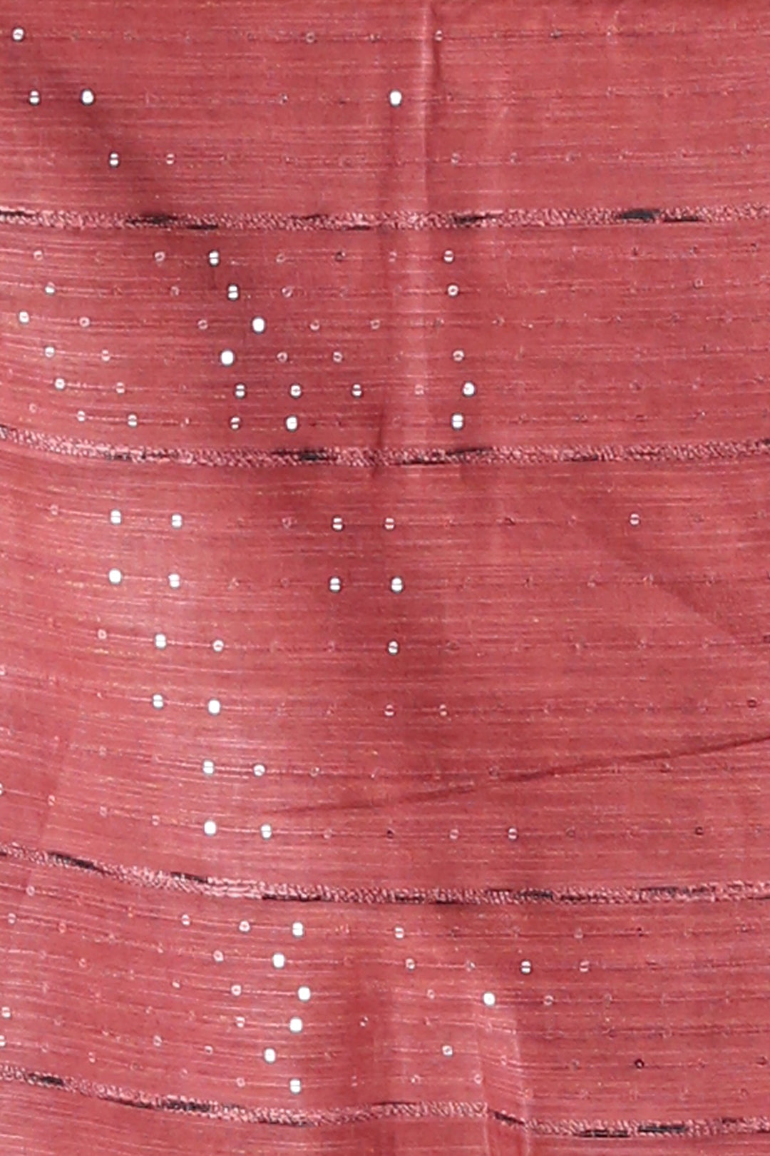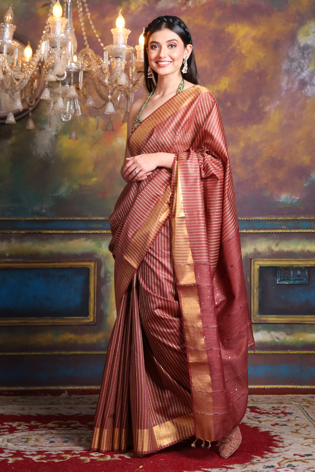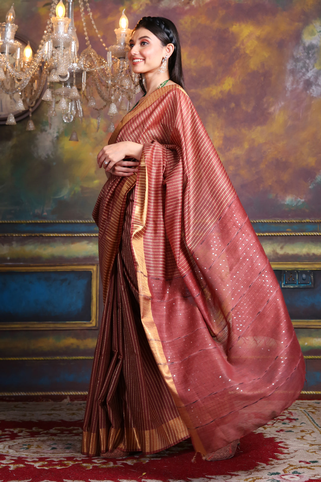 Stylish and posh is what you will look in this rust red silk blend saree. It accompanies zari borders with woven stripes all over the body. The pallu is decorated with small woven sequins to complete the look.