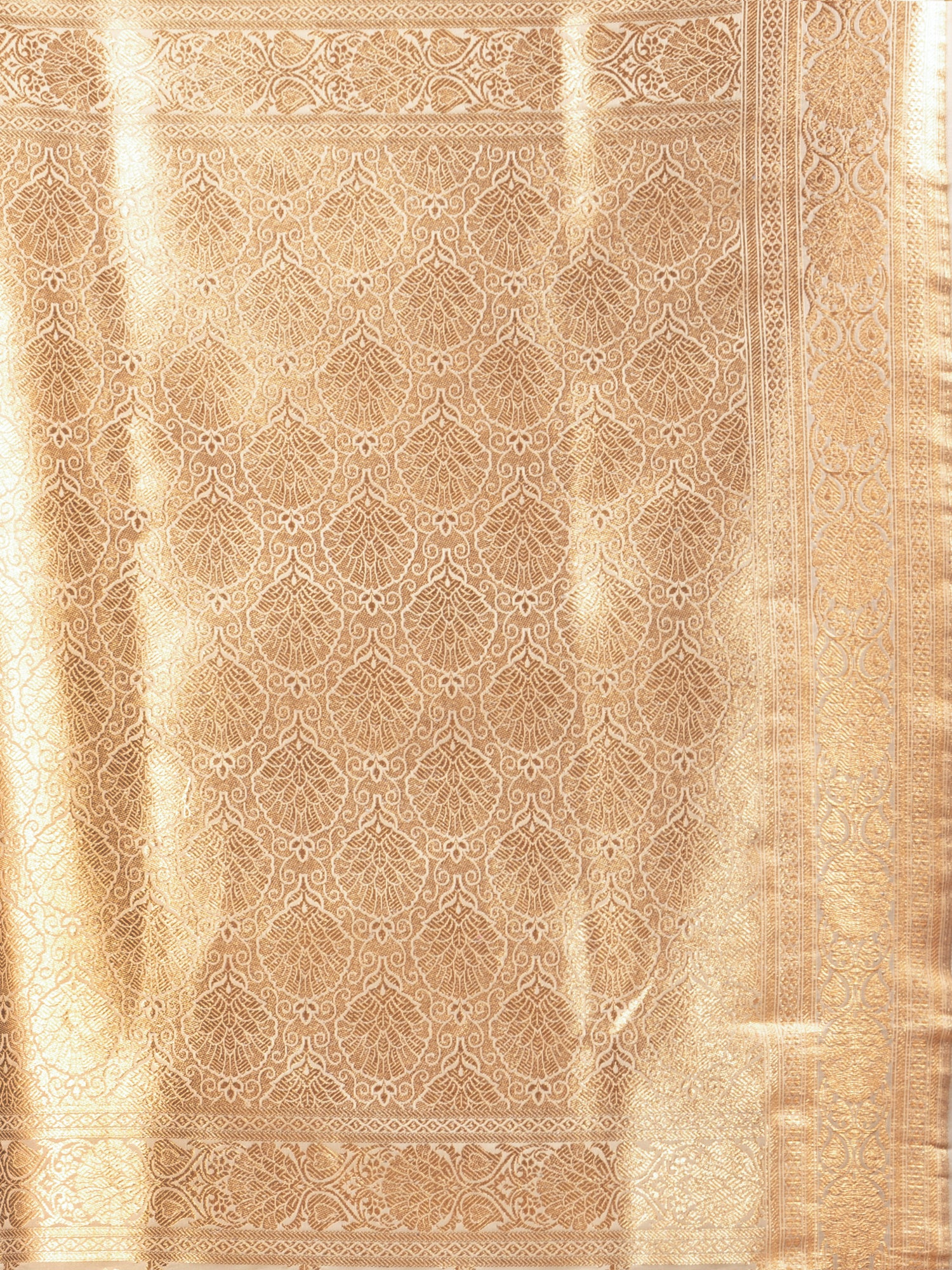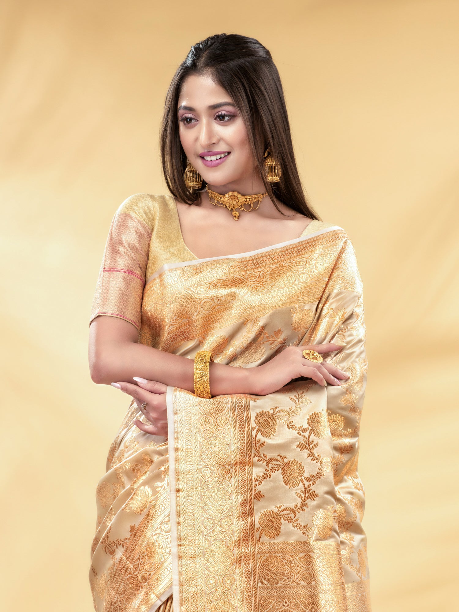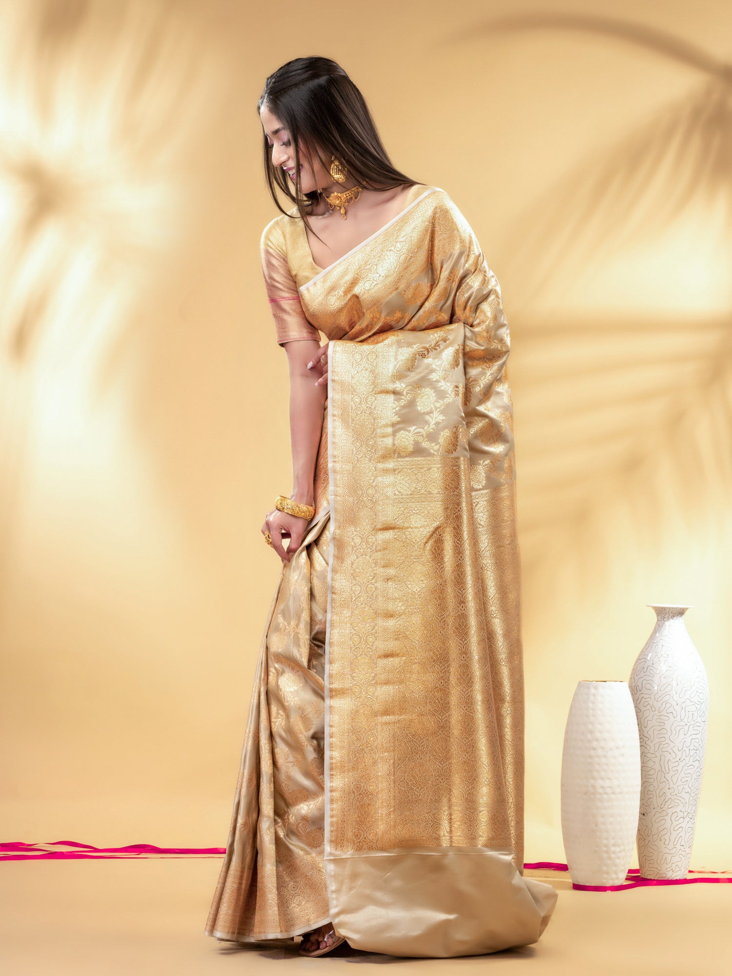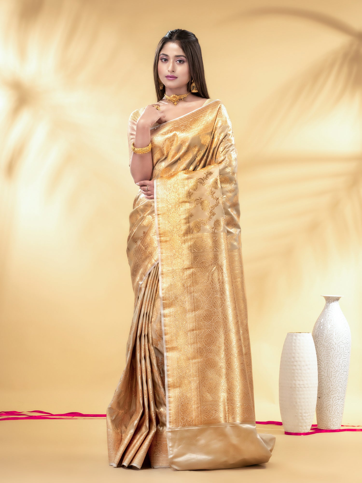 Beige Katan Banarasi Silk Saree with Rich Golden Zari Weaving & Traditional Floral Motifs
