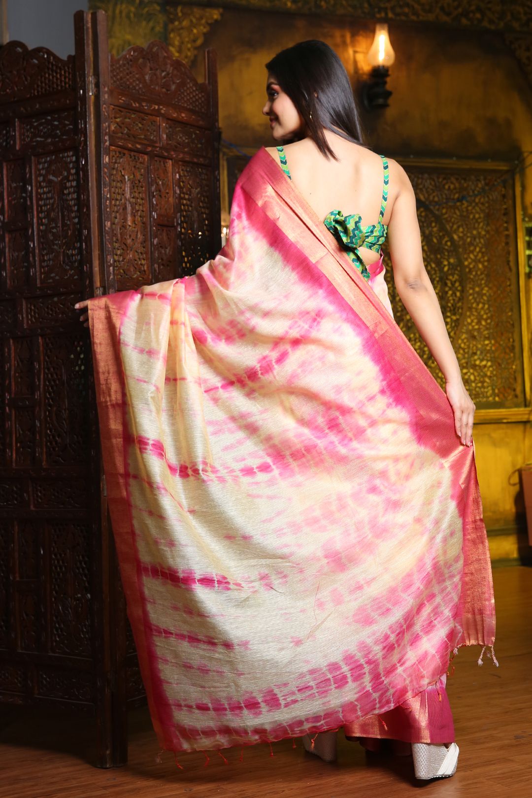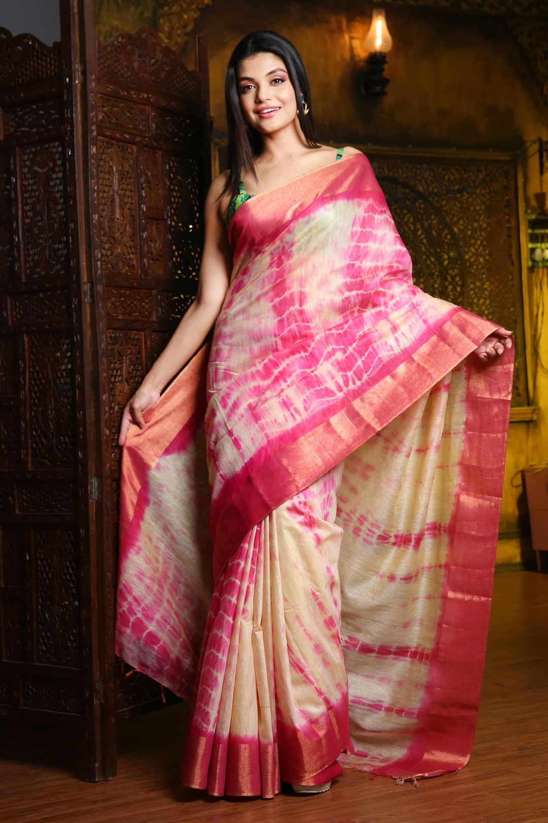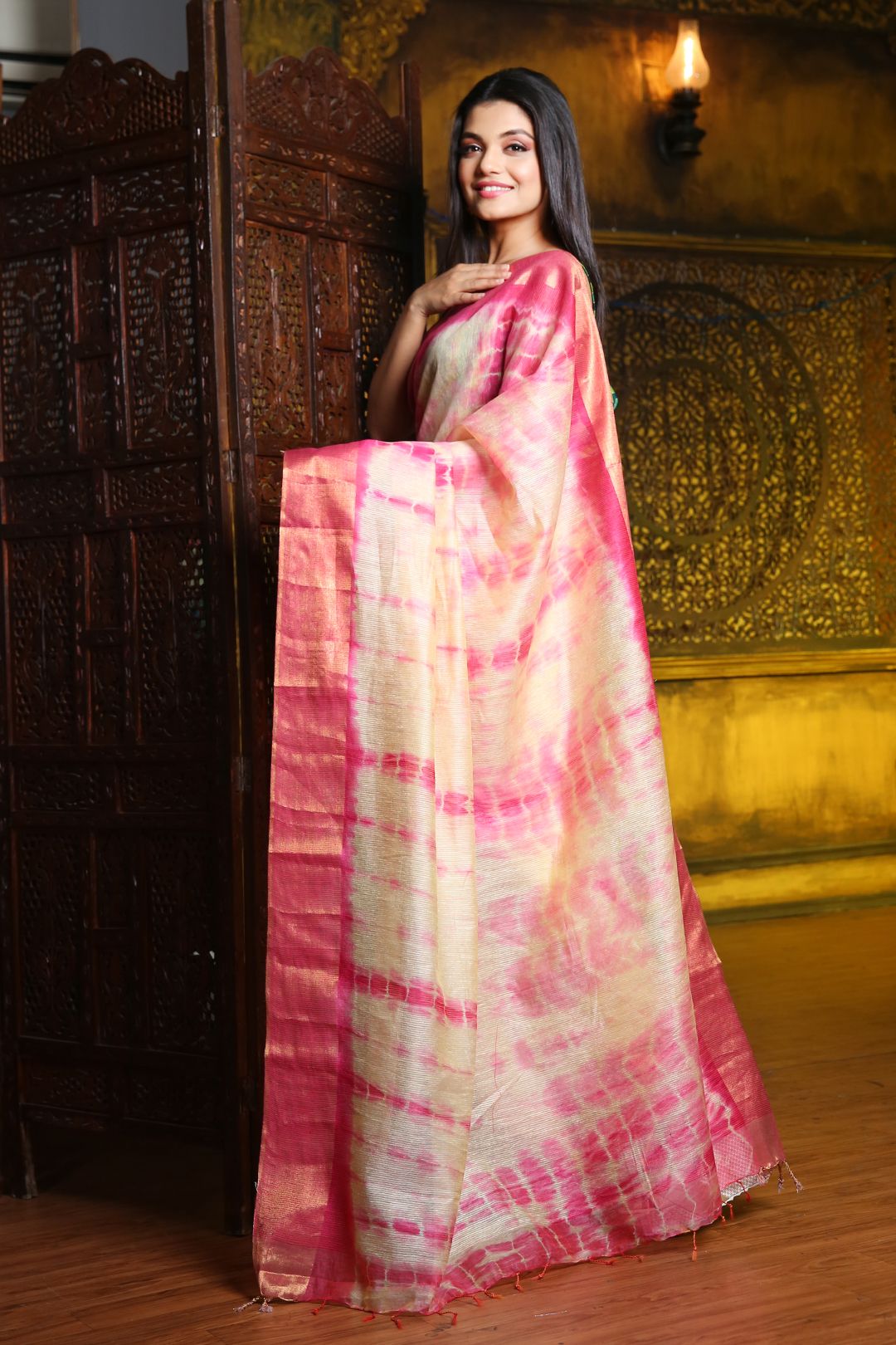 Beige & Pink Tie and Dye Zari Silk Blend Saree