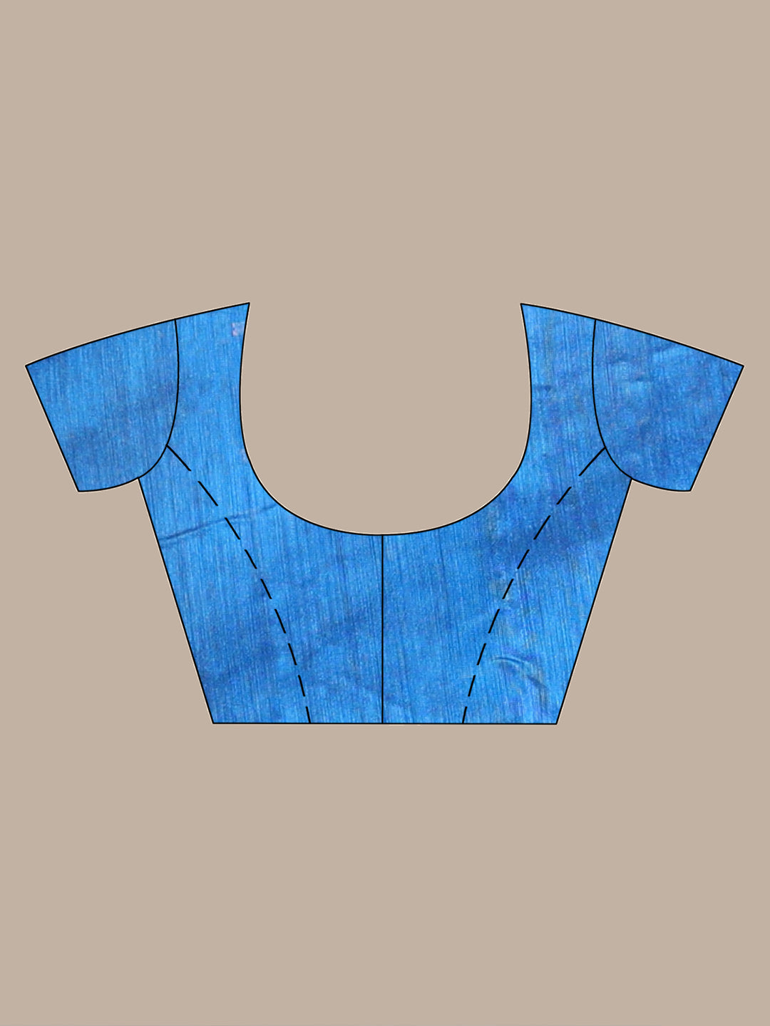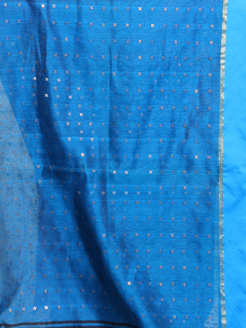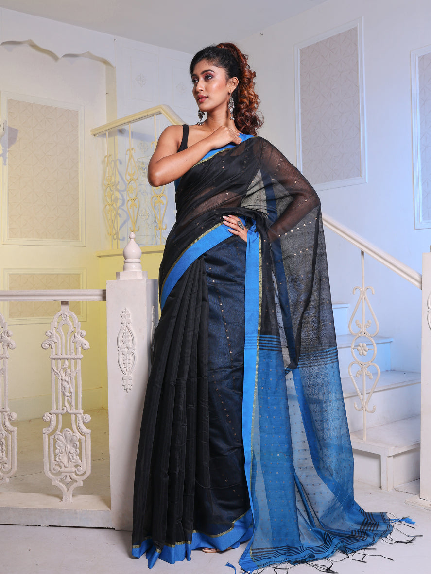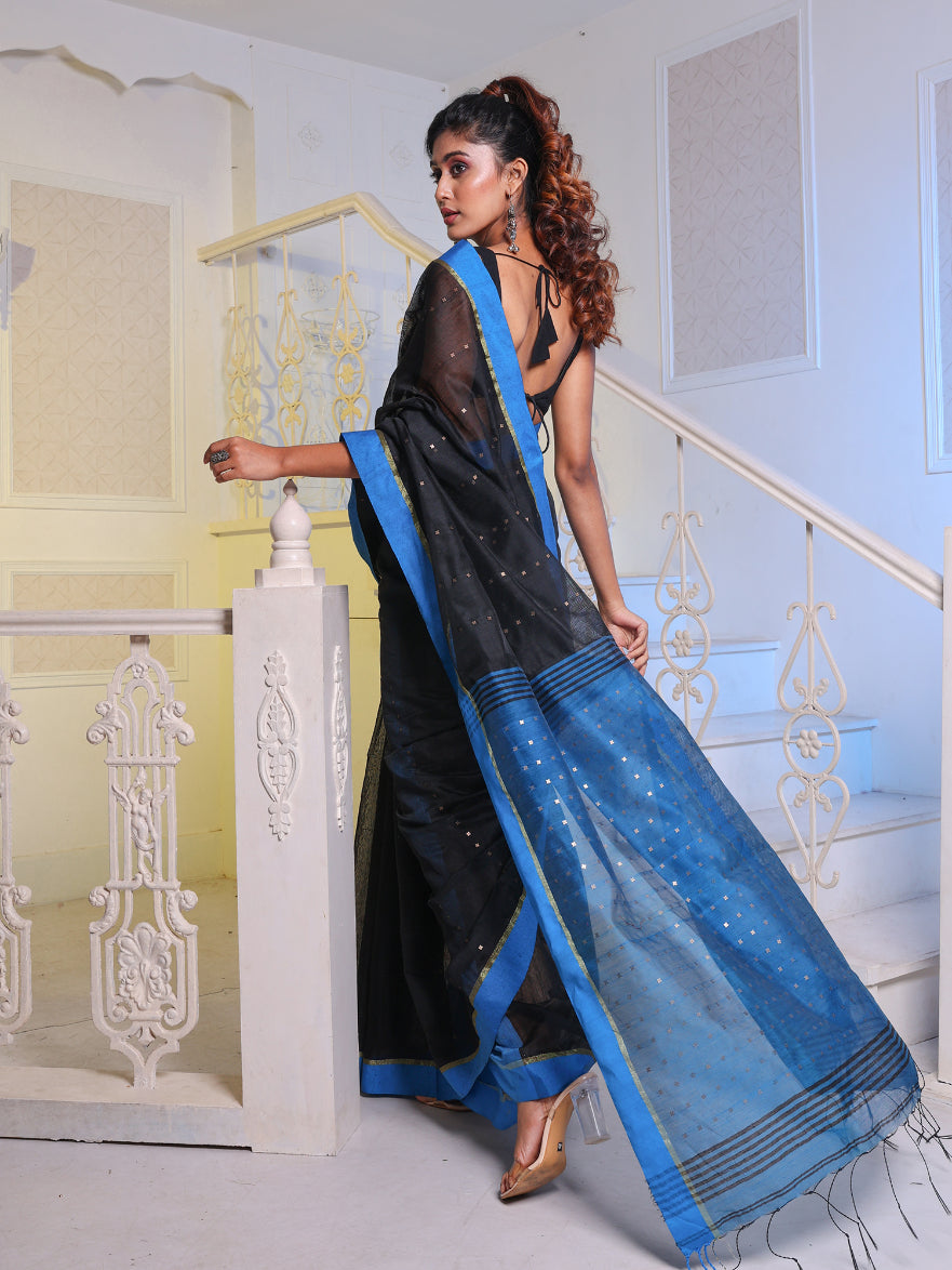 Urban and classy is what you will look in this black blended cotton handwoven saree. It has small sequin work all over the saree. The contrasting sky blue borders have solid pattern along with zari detailing. The pallu is highlighted in sky blue with stripes for a complete look.