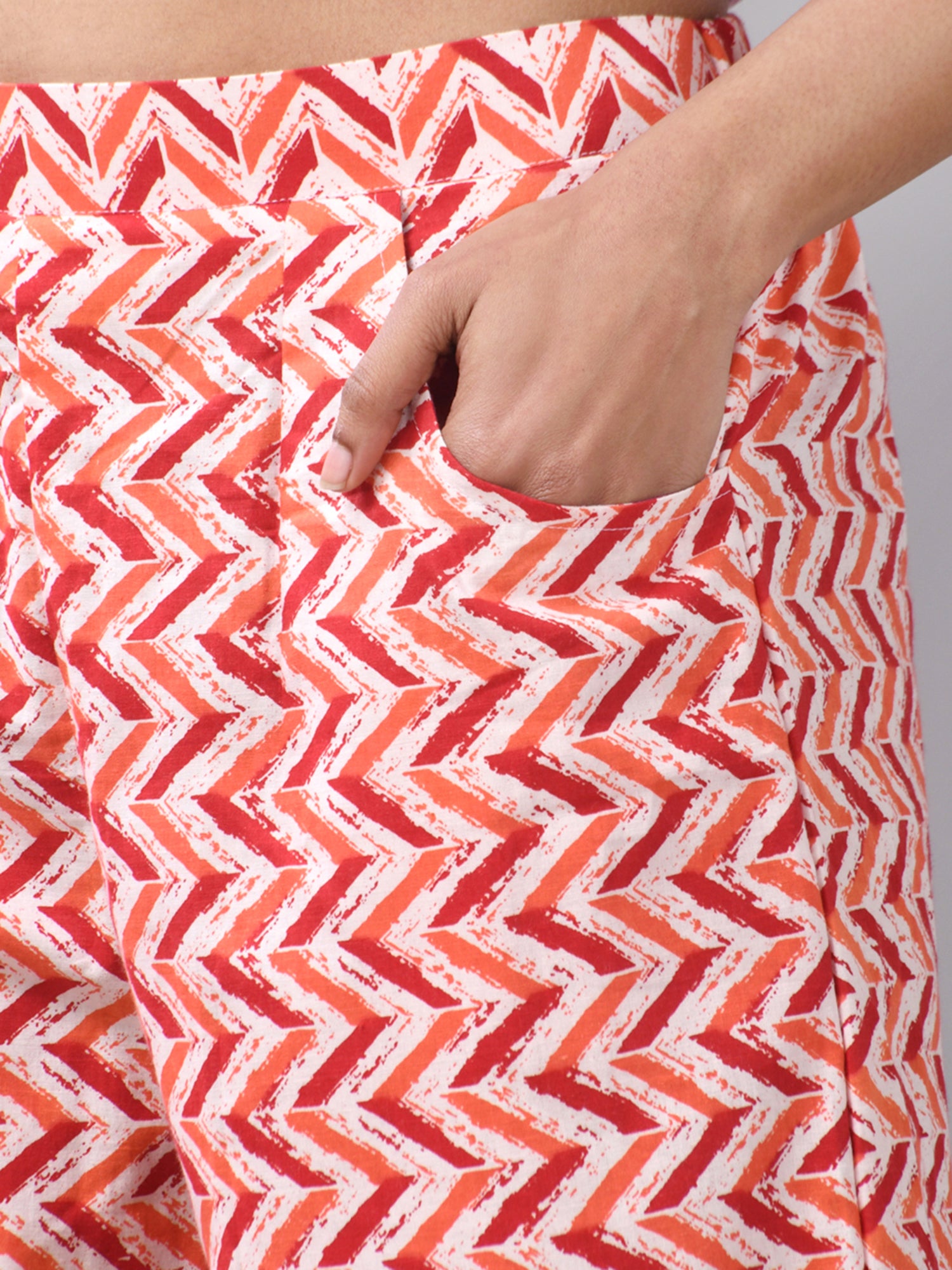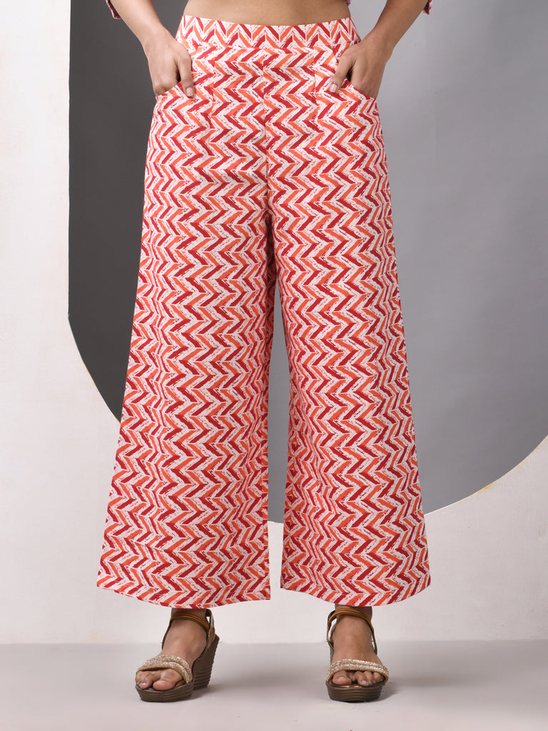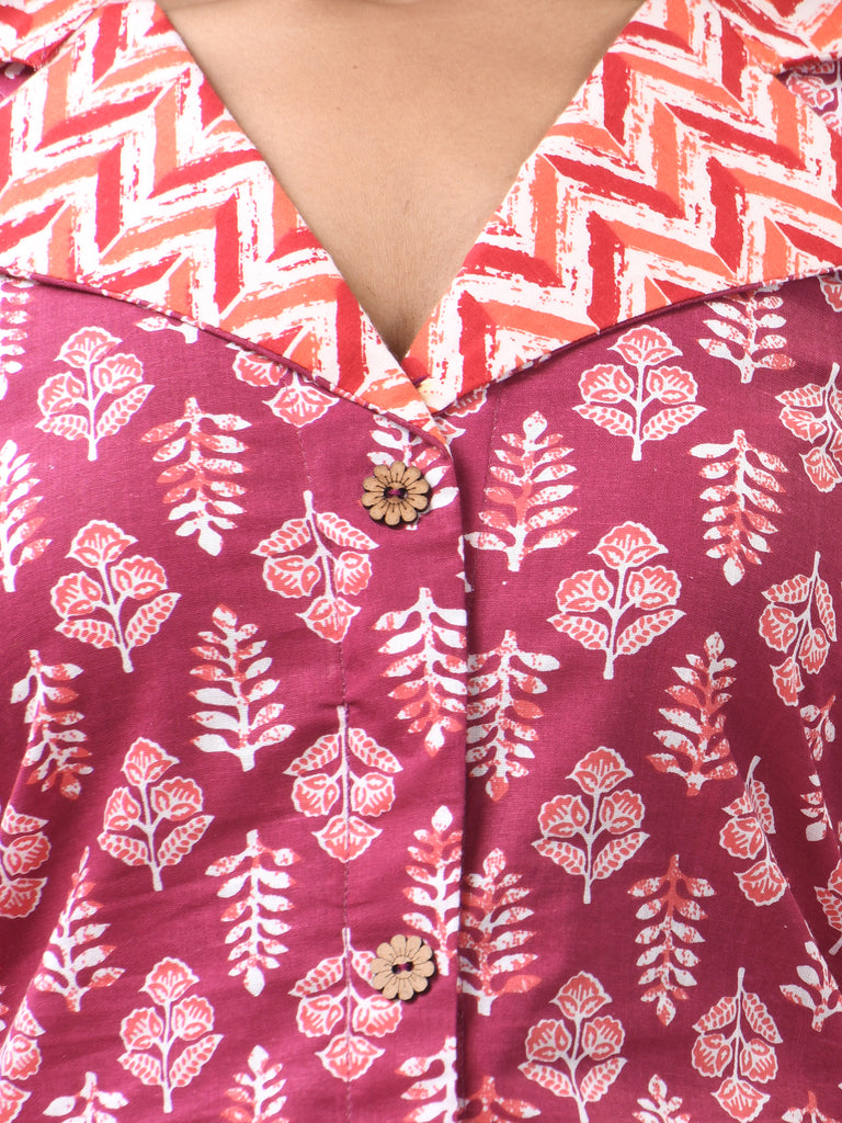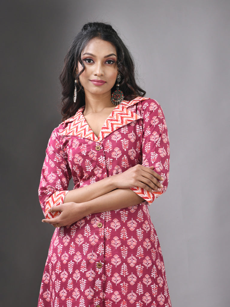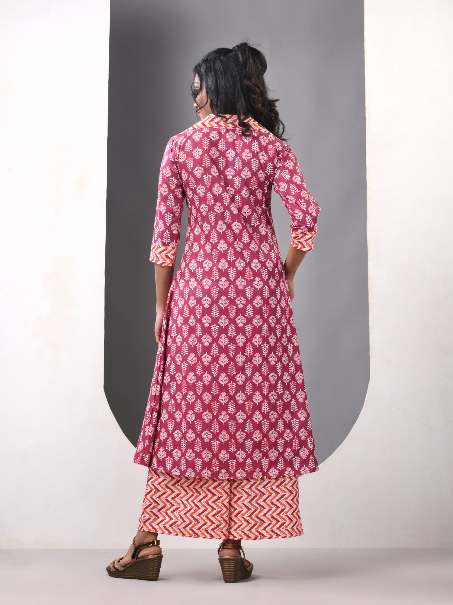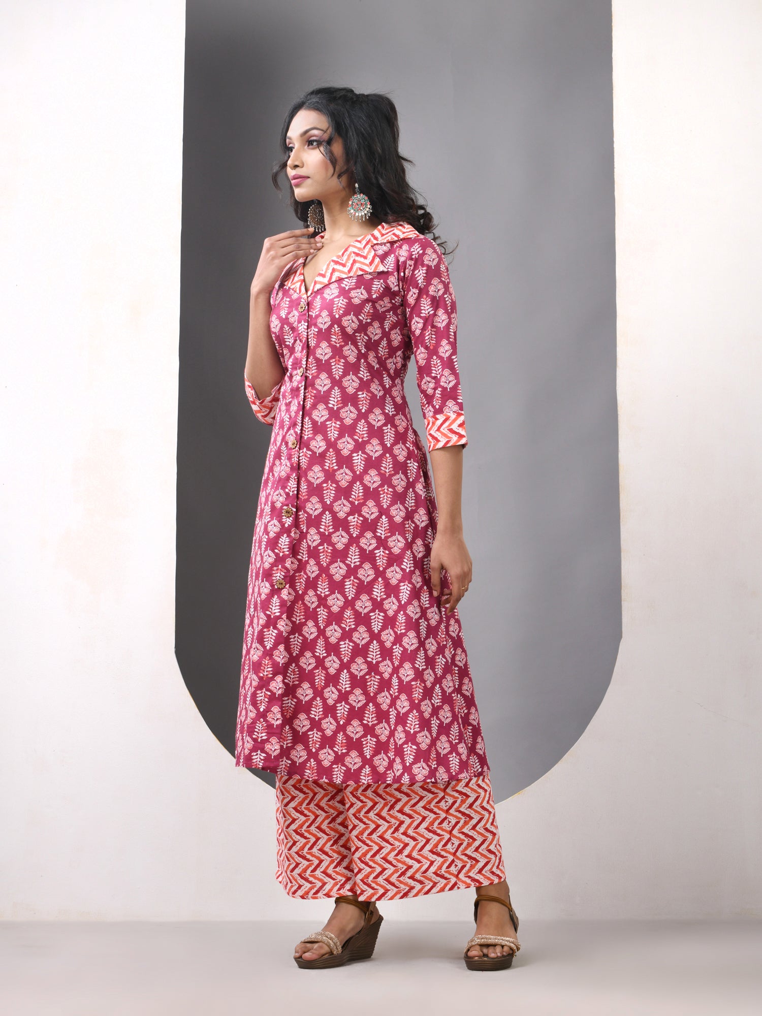 Introducing the sophisticated dark red A-line kurta set, a meticulously crafted set ideal for both formal and festive occasions. This set's kurta features a spread collar and three quarter sleeves for a polished look, with an A-line silhouette adding a touch of elegance. The button placket enhances the overall sleek design, while the palazzo pant ensures a comfortable and tailored fit. Designed from a luxurious cotton, this set featured a print hue that offers refinement and style.