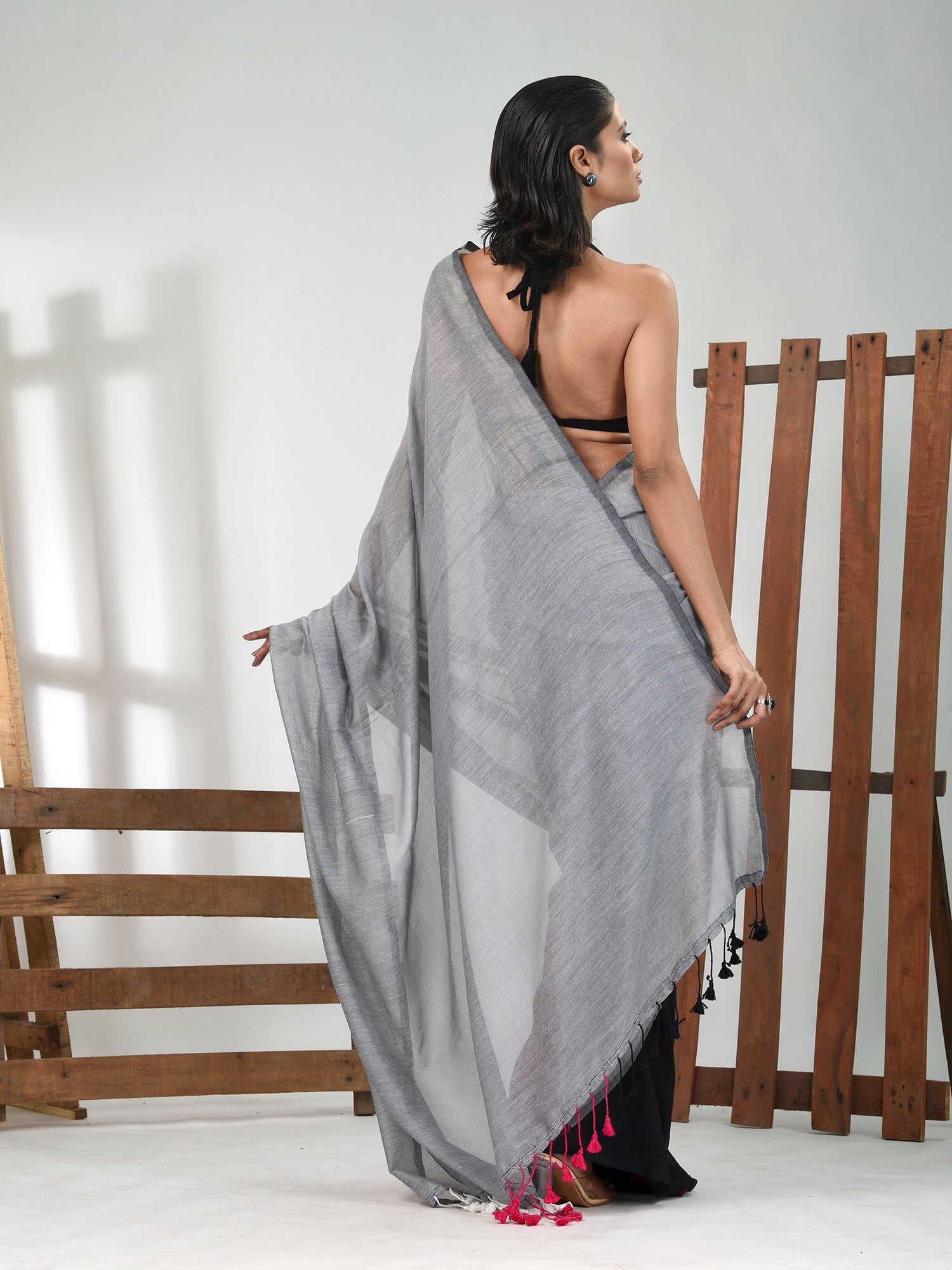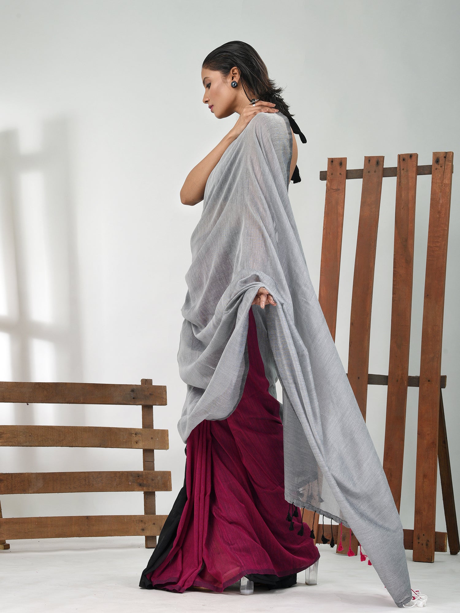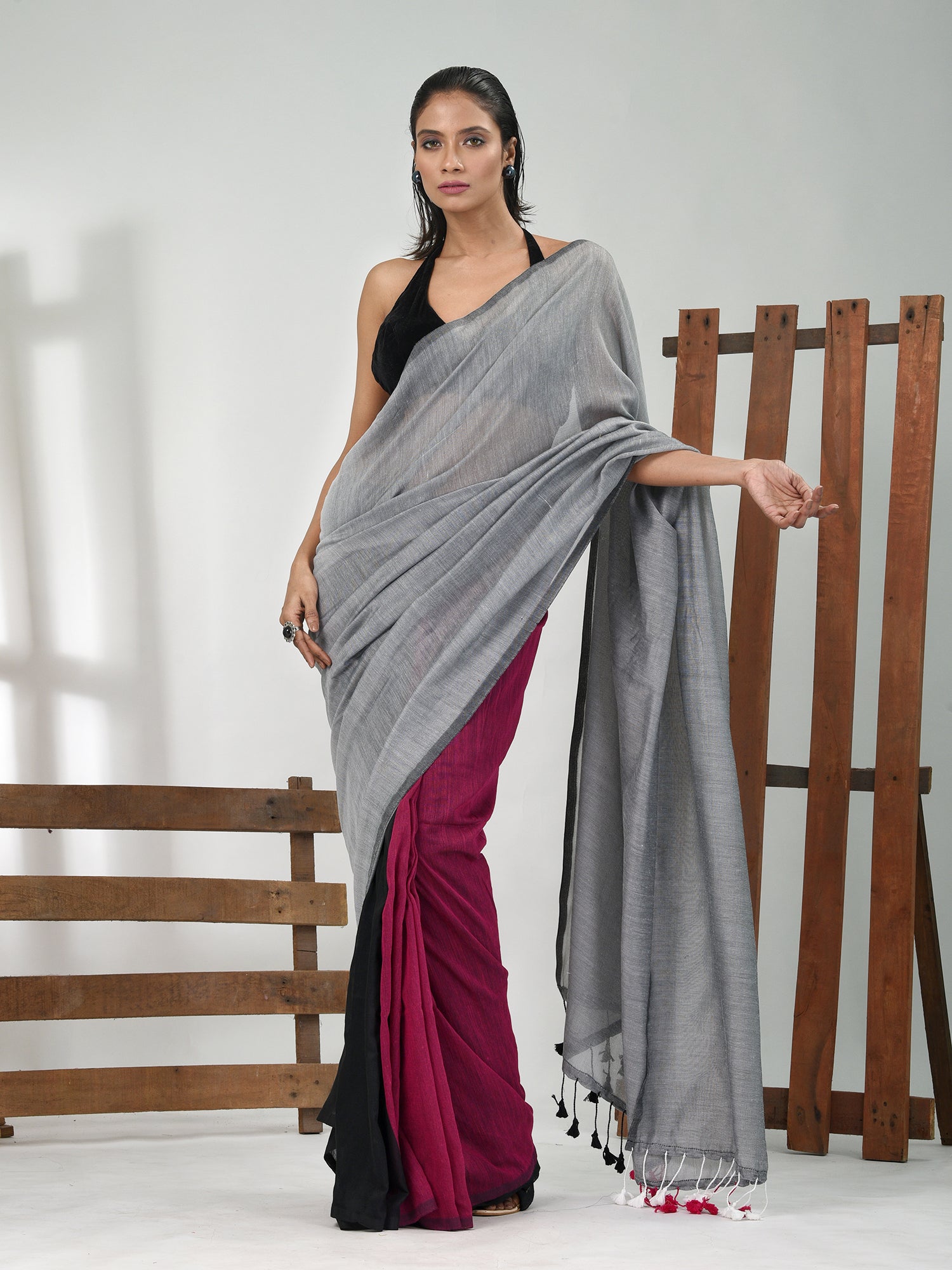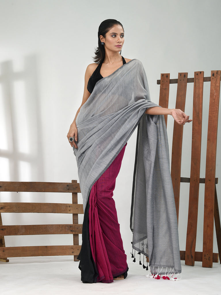 Grey, Magenta And Black Cotton Soft Saree With Pompom