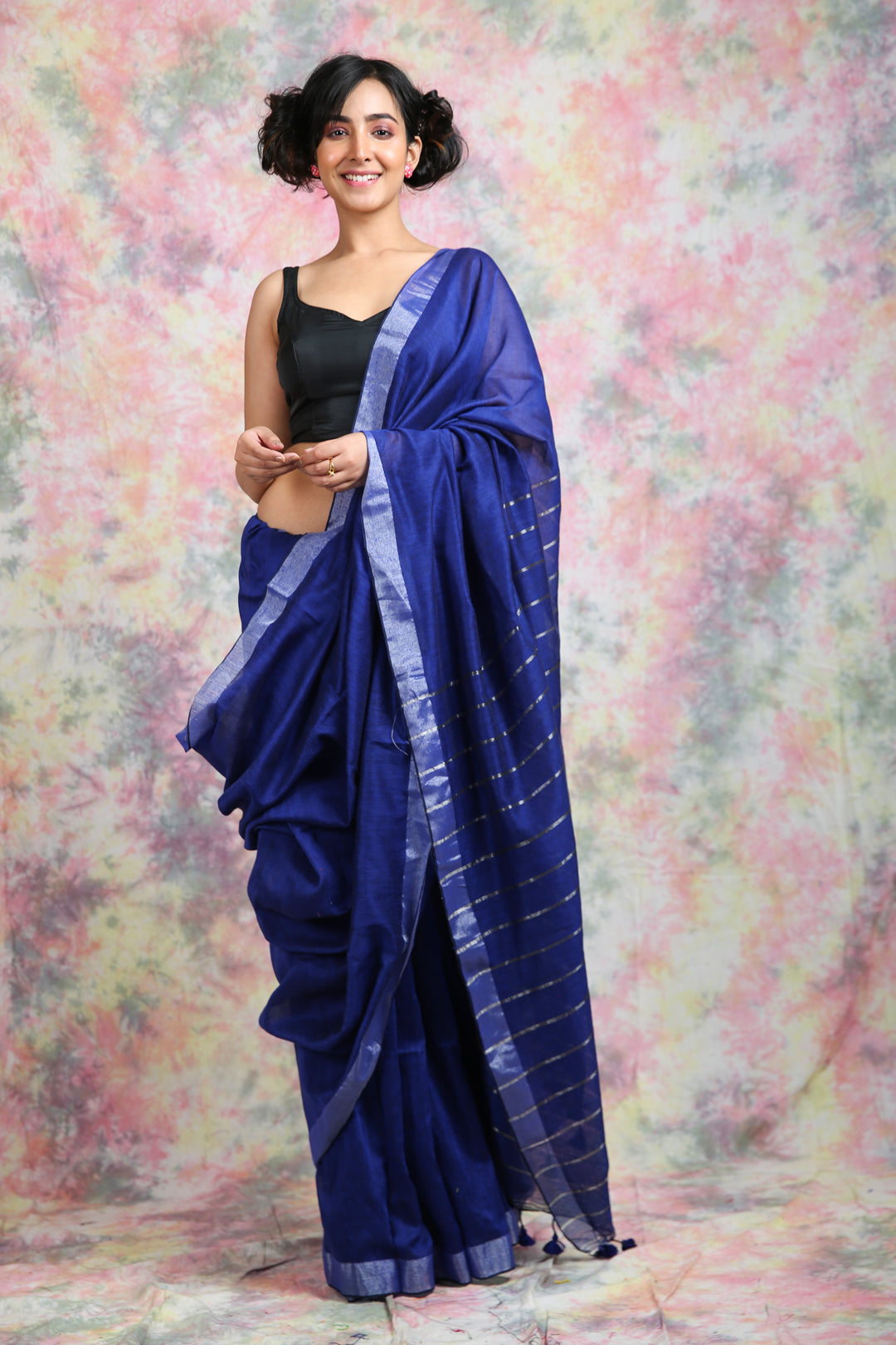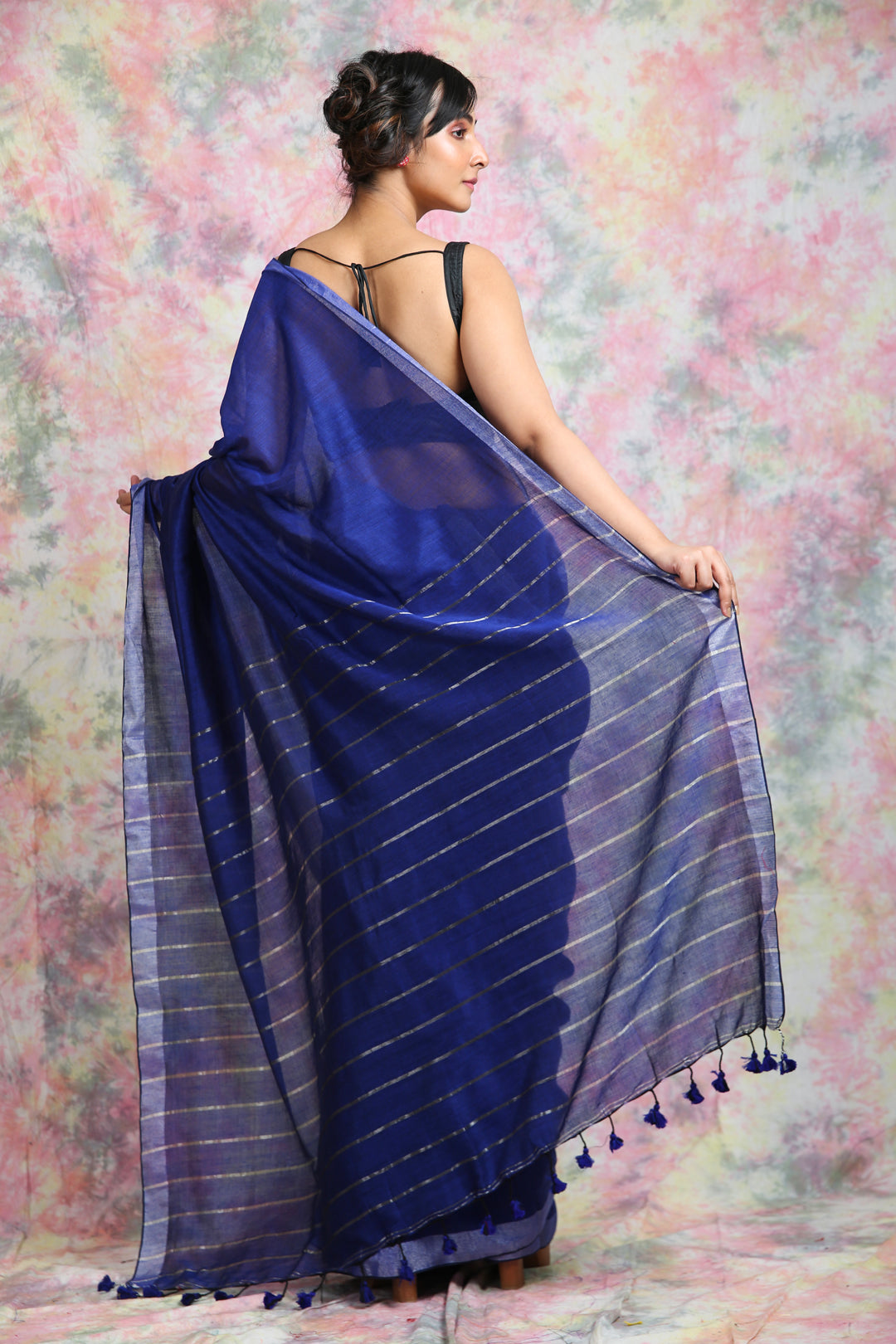 Royal Blue Cotton Handloom Saree With Stripes Pallu