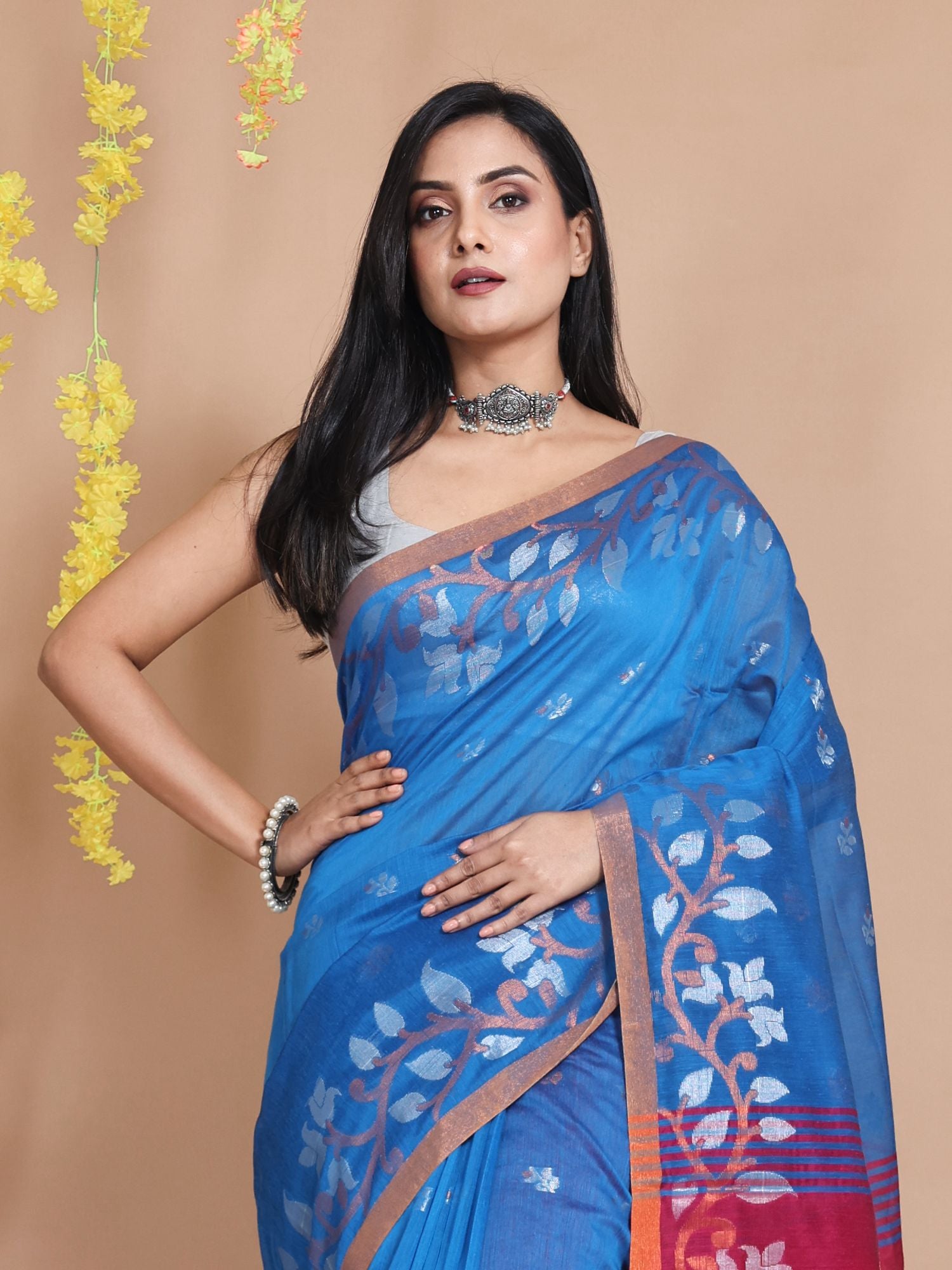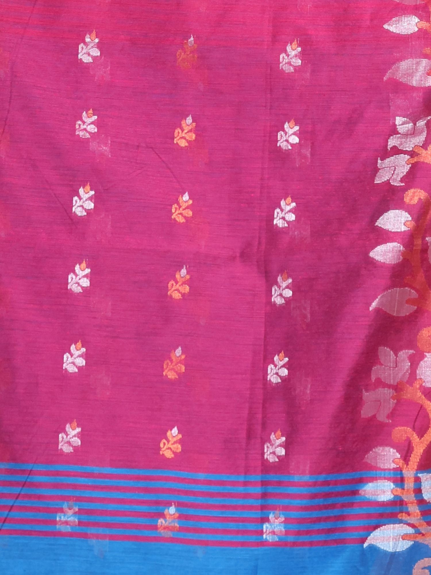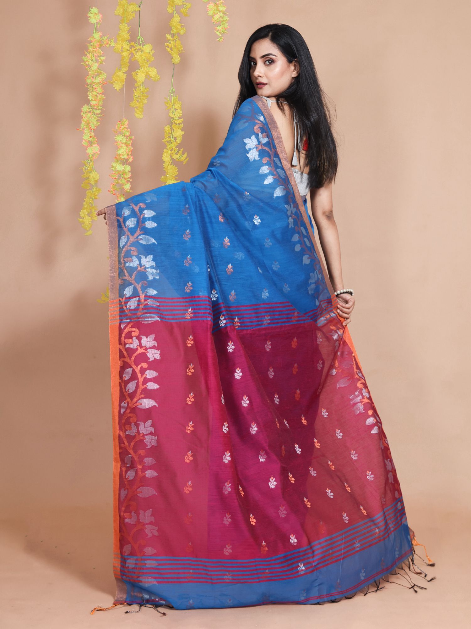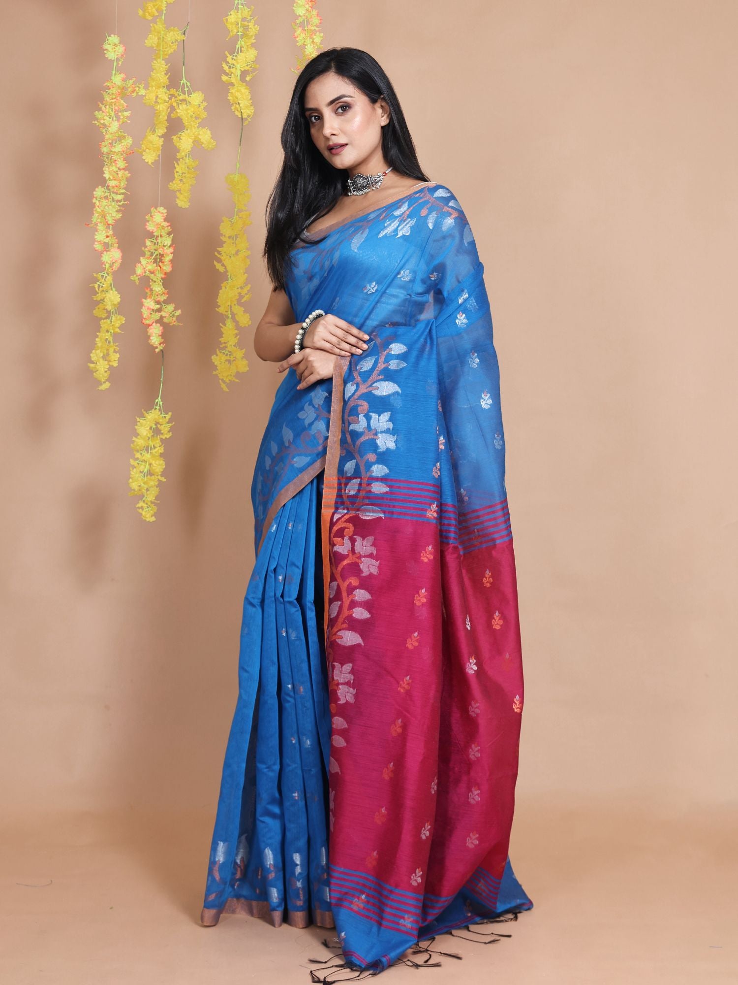 Charming and bright is what you will look in this sapphire blue blended cotton handwoven saree. It has ethnic motifs woven all over with zari and the borders have floral and foliage borders. The pallu is highlighted in magenta for a beautiful look.