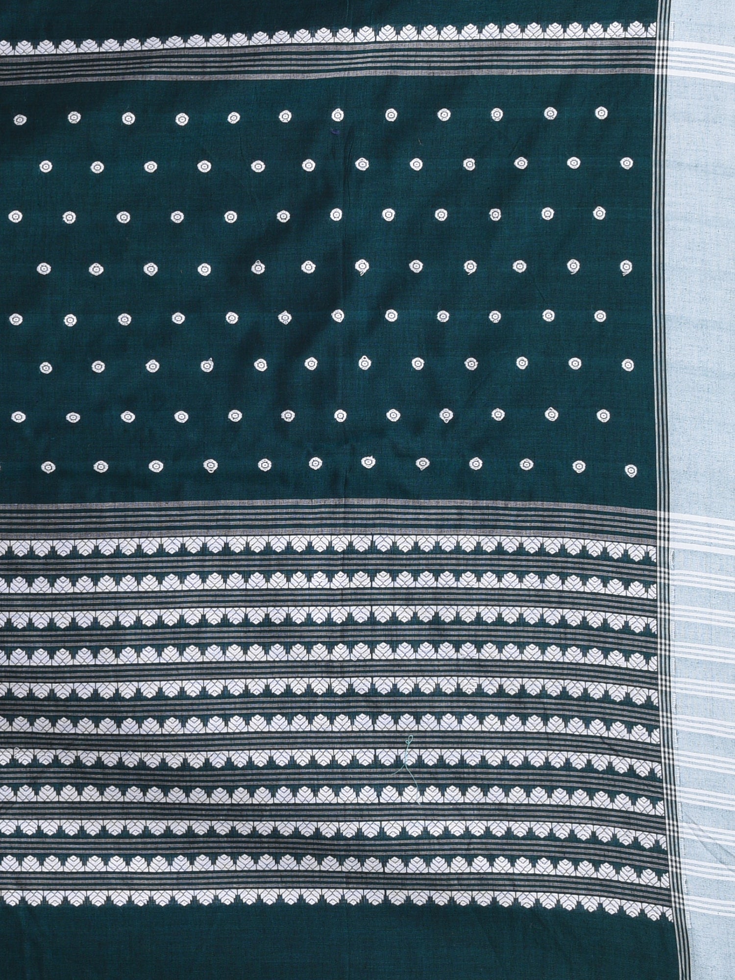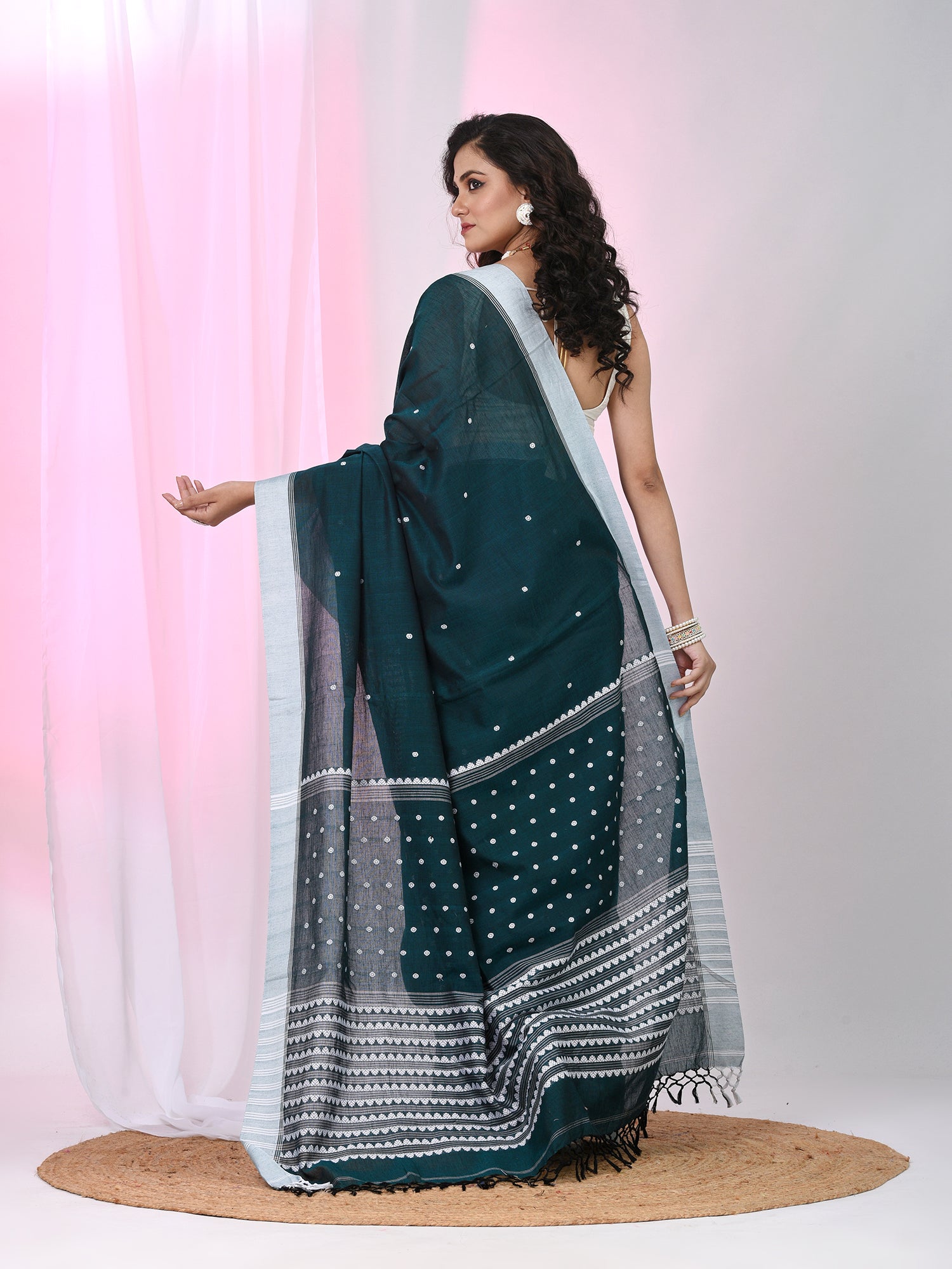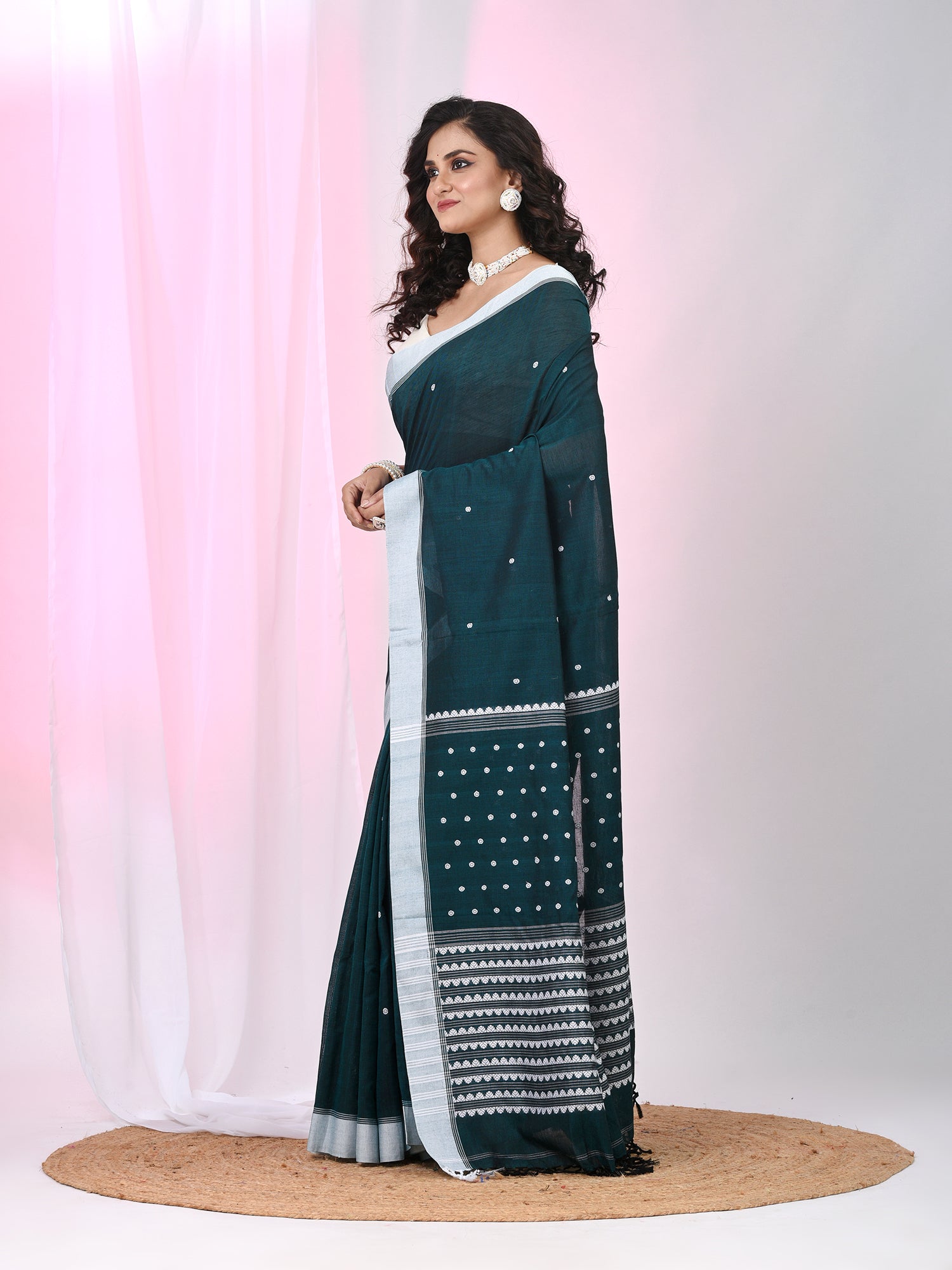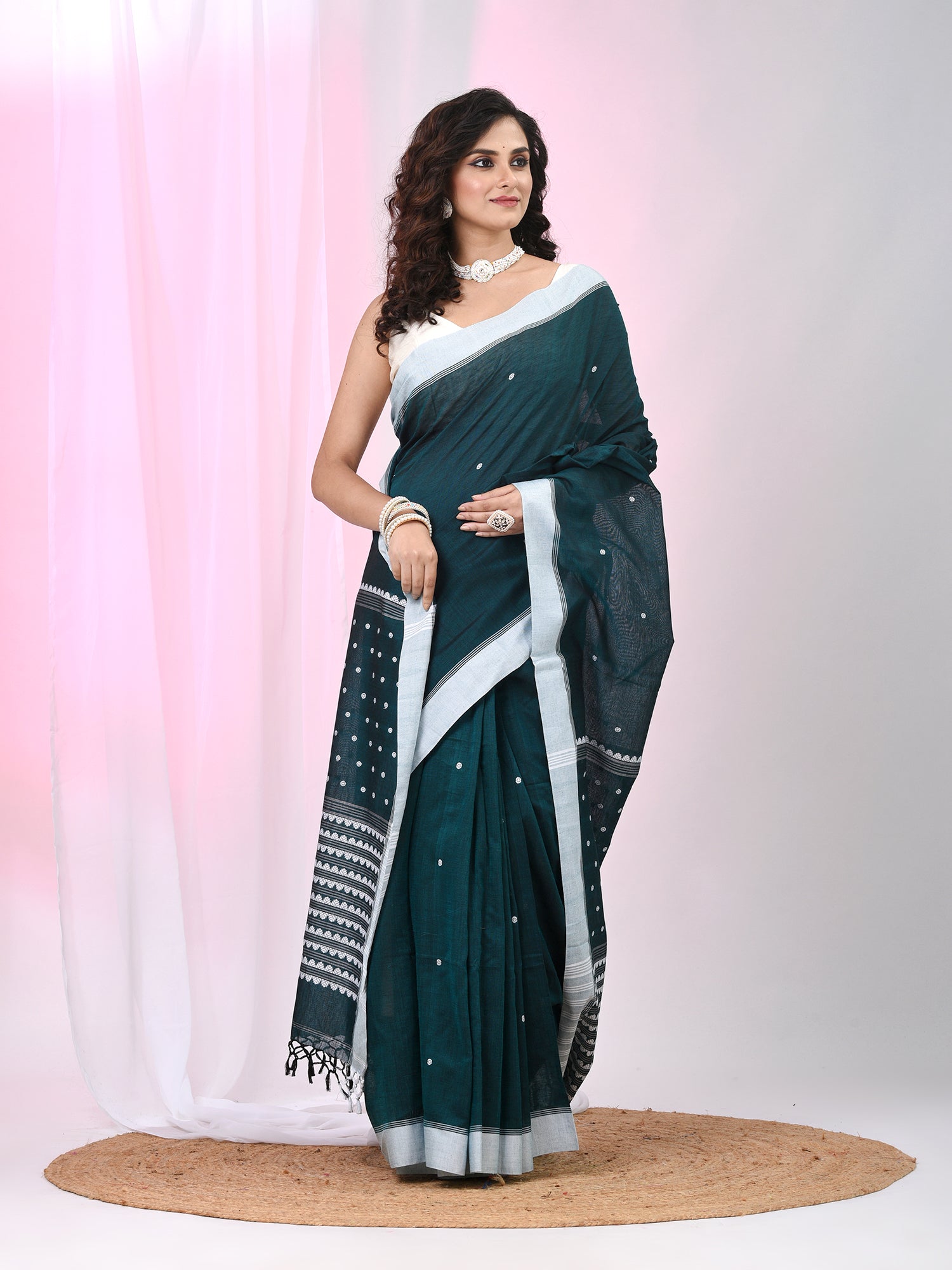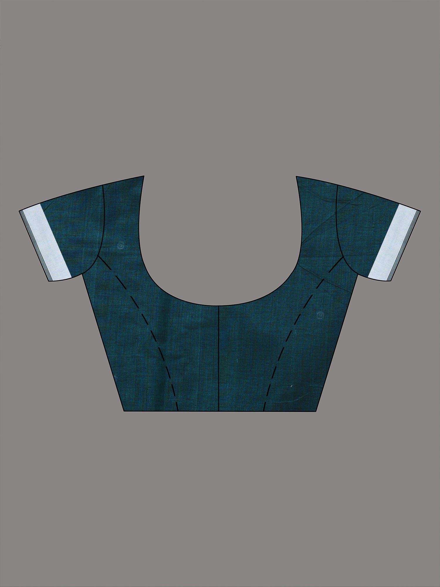 This elegant teal cotton saree is the perfect addition to any wardrobe, offering a stylish yet traditional appeal. The saree is adorned with delicate white woven patterns that enhance its sophisticated charm, complemented by a crisp white border that adds contrast and visual interest. The lightweight, breathable cotton fabric ensures comfort throughout the day, making it ideal for long wear. The tassel accents at the border add a modern touch, making it suitable for both casual and semi-formal occasions. Pair it with traditional or contemporary accessories for a timeless and graceful look.