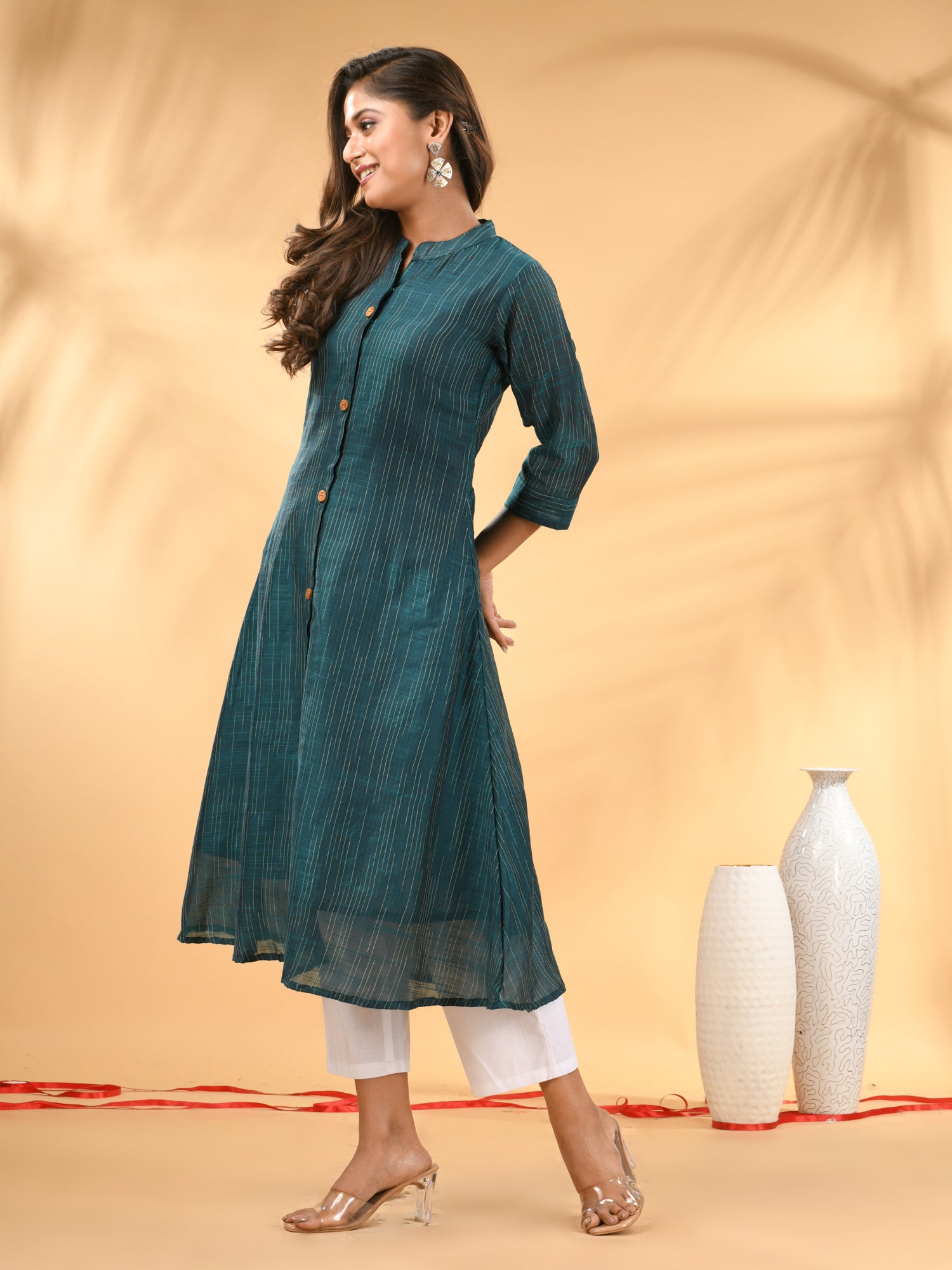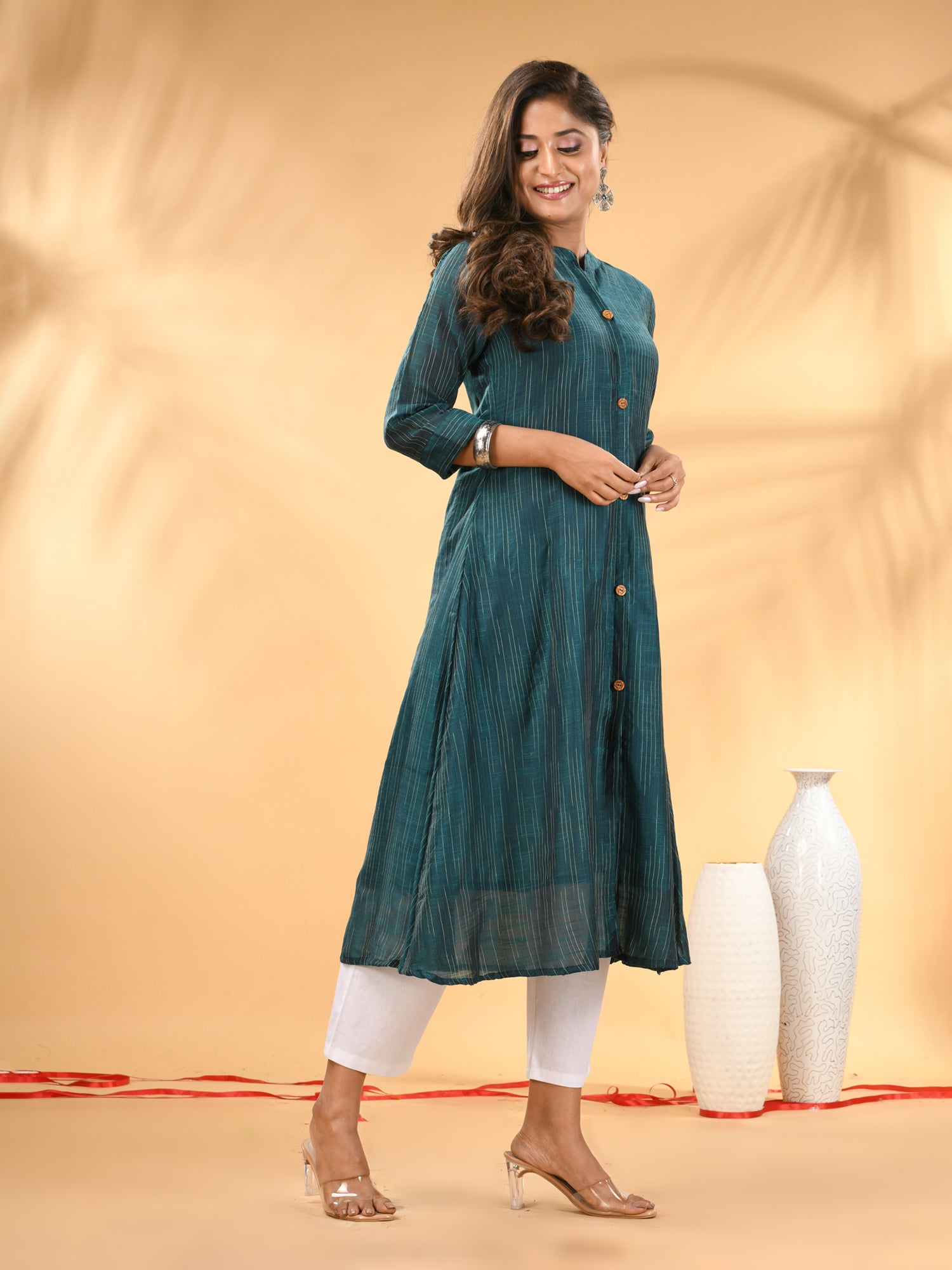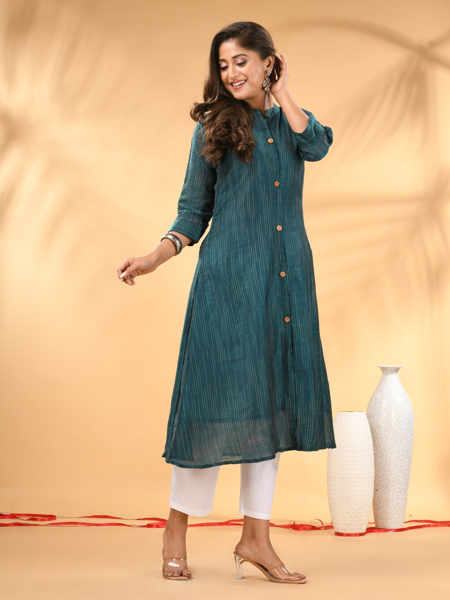 Introducing the sophisticated teal A-line kurta set, a meticulously crafted set ideal for both formal and festive occasions. This set's kurta features a mandarin neckline and three quarter sleeves for a polished look, with an A-line silhouette adding a touch of elegance. The button placket enhances the overall sleek design, while the trouser pant ensures a comfortable and tailored fit. Designed from a luxurious cotton, this set featured solid pattern that offers refinement and style.