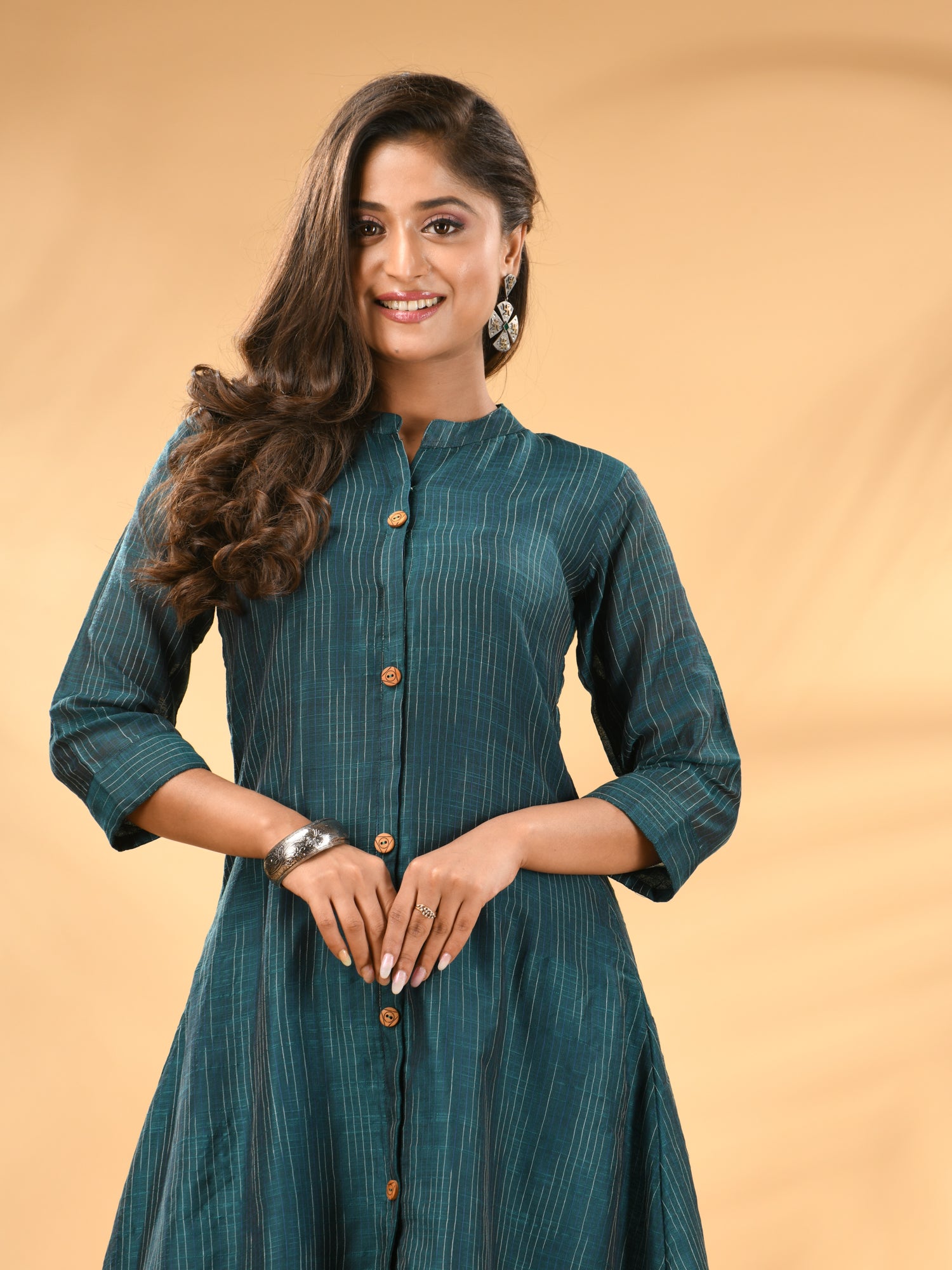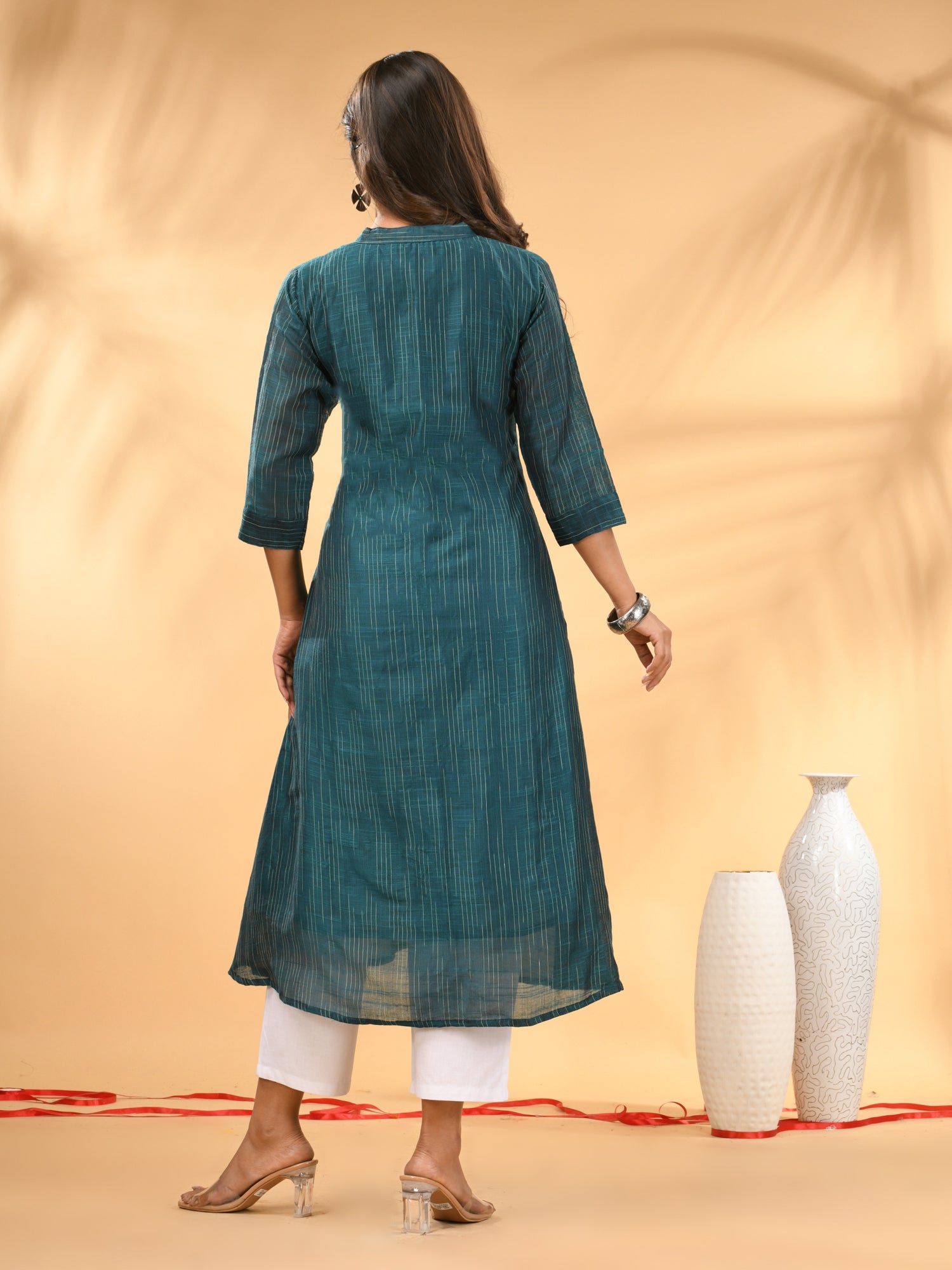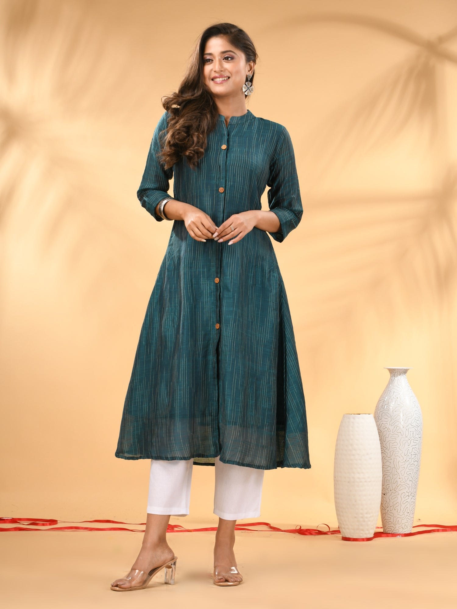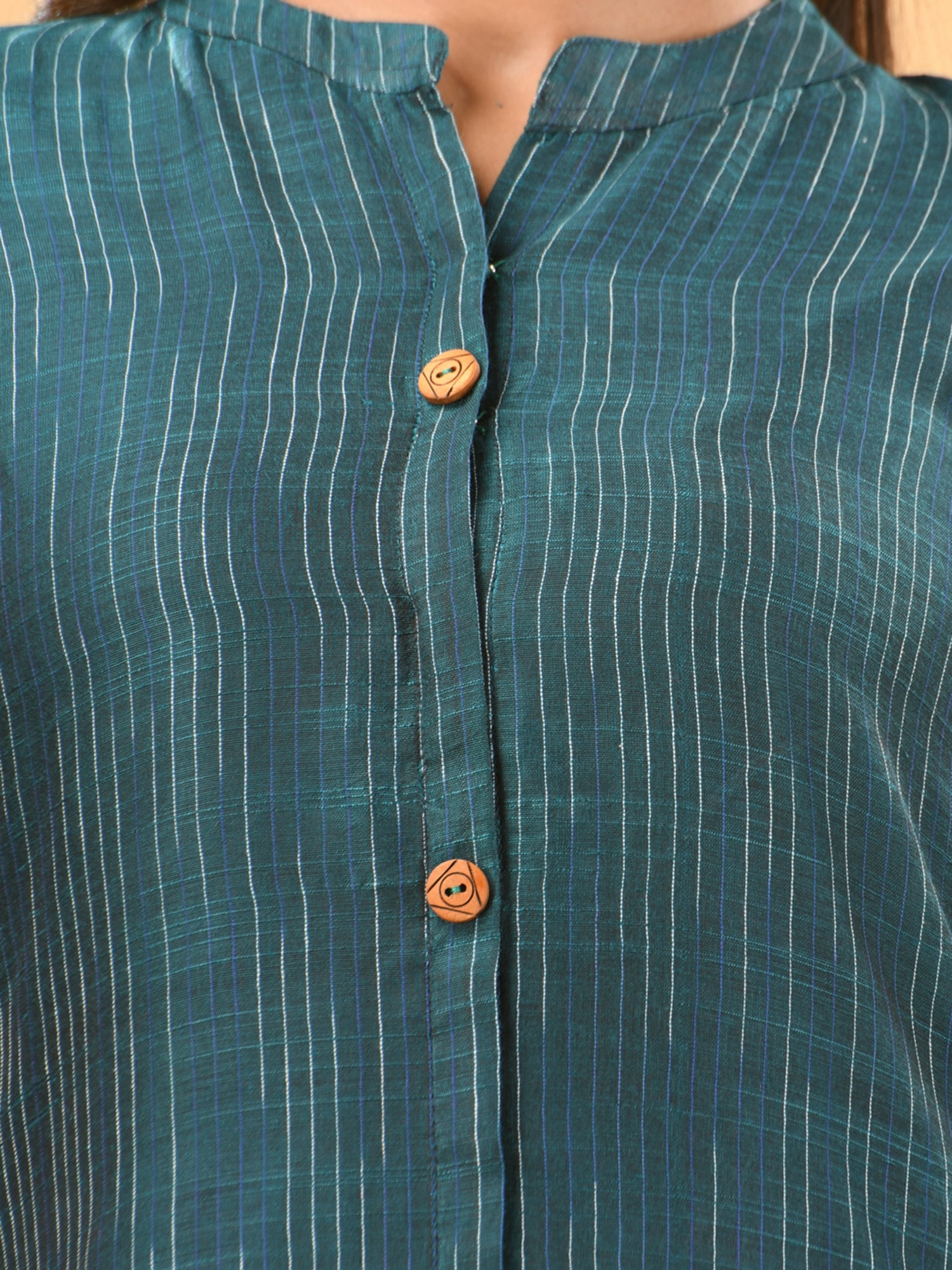 Introducing the sophisticated teal A-line kurta set, a meticulously crafted set ideal for both formal and festive occasions. This set's kurta features a mandarin neckline and three quarter sleeves for a polished look, with an A-line silhouette adding a touch of elegance. The button placket enhances the overall sleek design, while the trouser pant ensures a comfortable and tailored fit. Designed from a luxurious cotton, this set featured solid pattern that offers refinement and style.