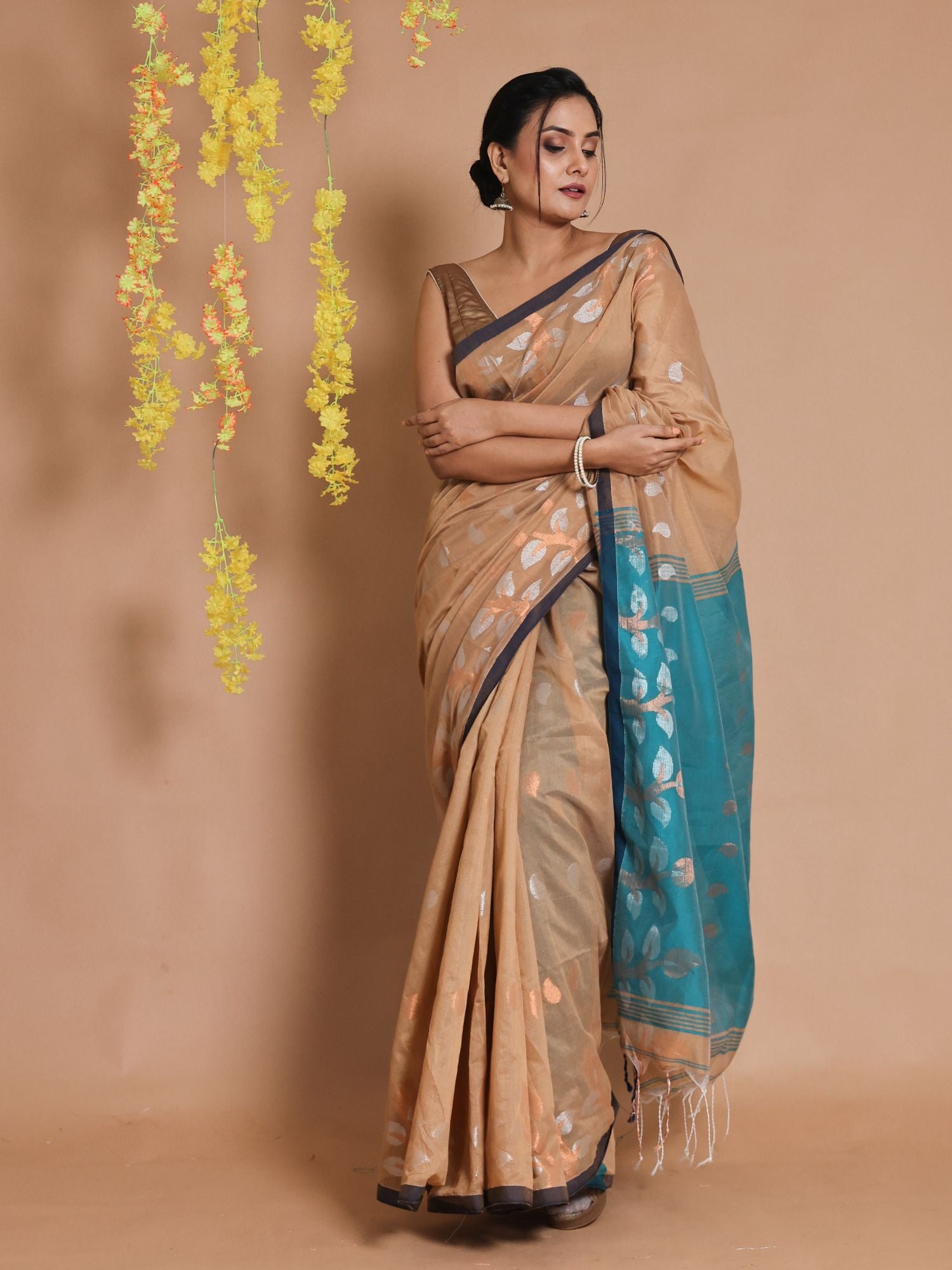 Be ready to look lovingly unique in this tortilla brown cotton handspun saree. It has paisley motifs woven all over with zari and the borders in blue have foliage patterns. The pallu is highlighted in blue for a beautiful look.
