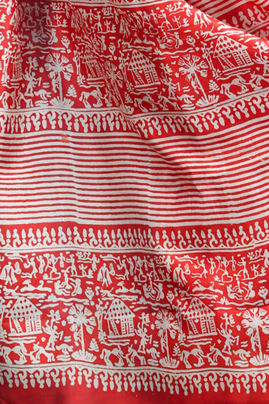 Traditional Red & Cream Warli Print Pure Silk Saree
