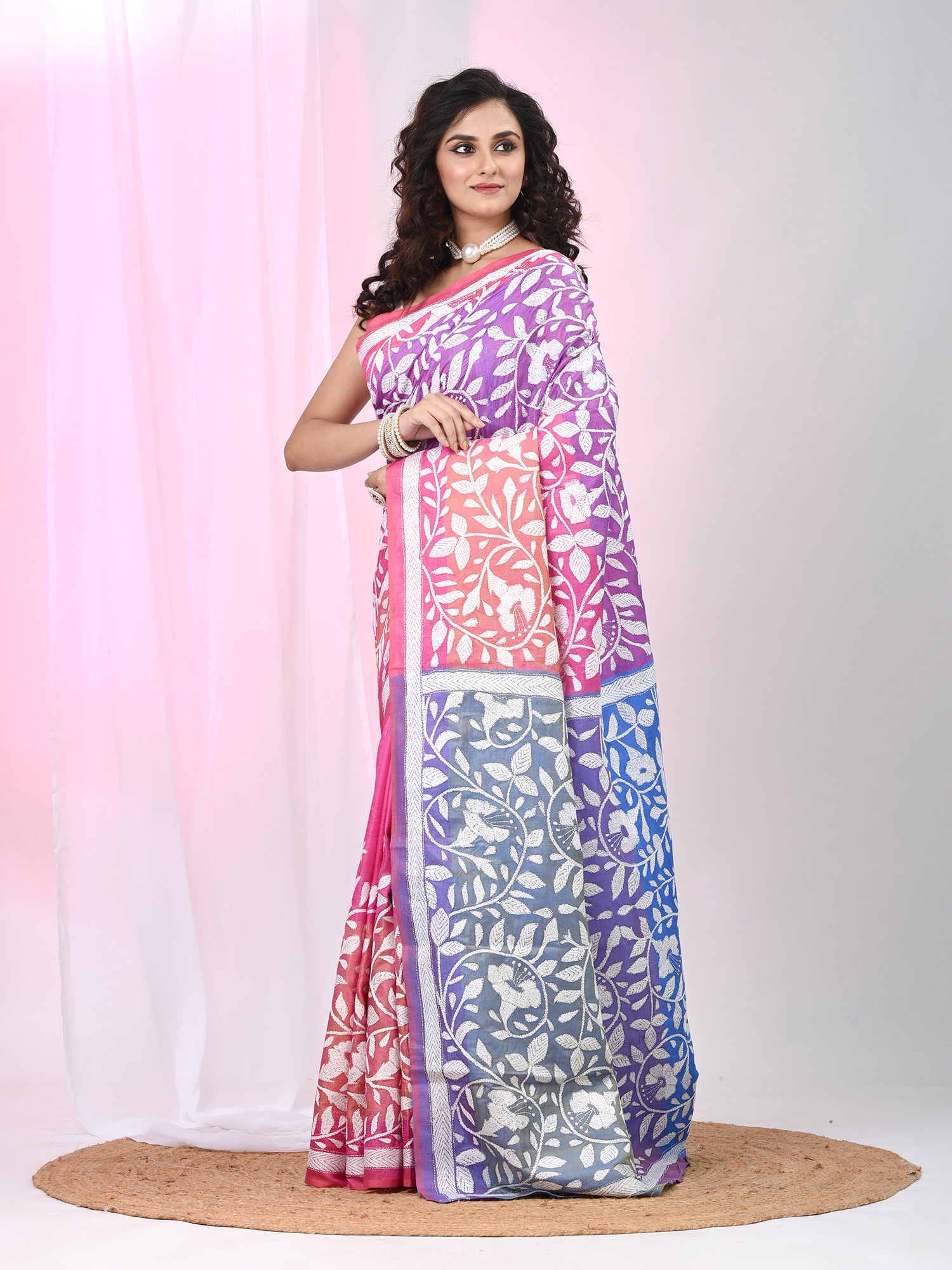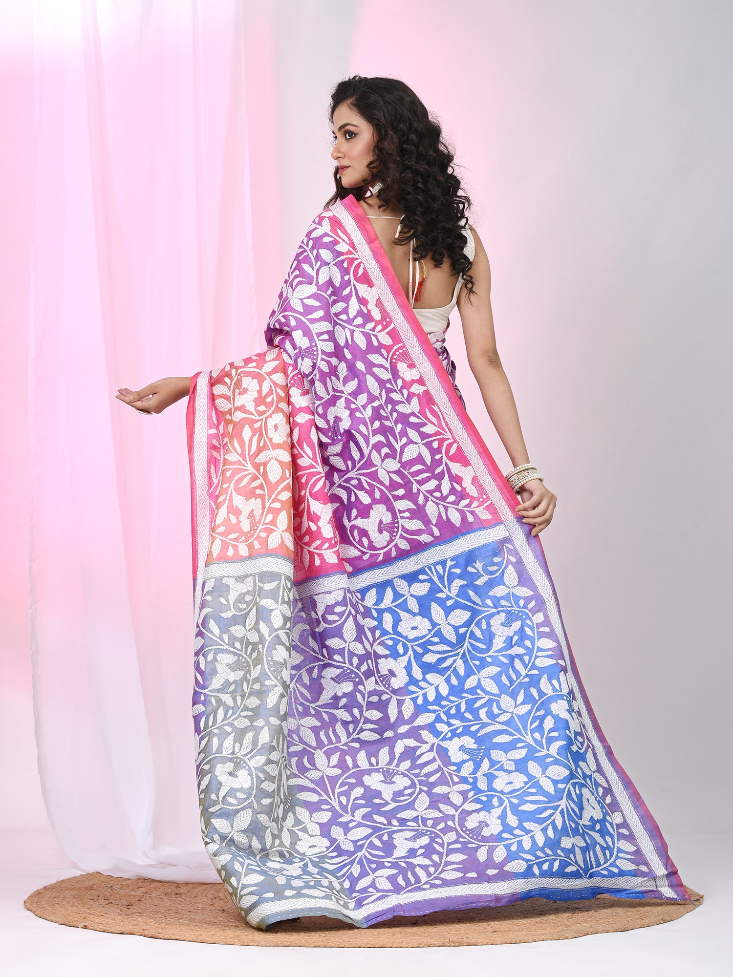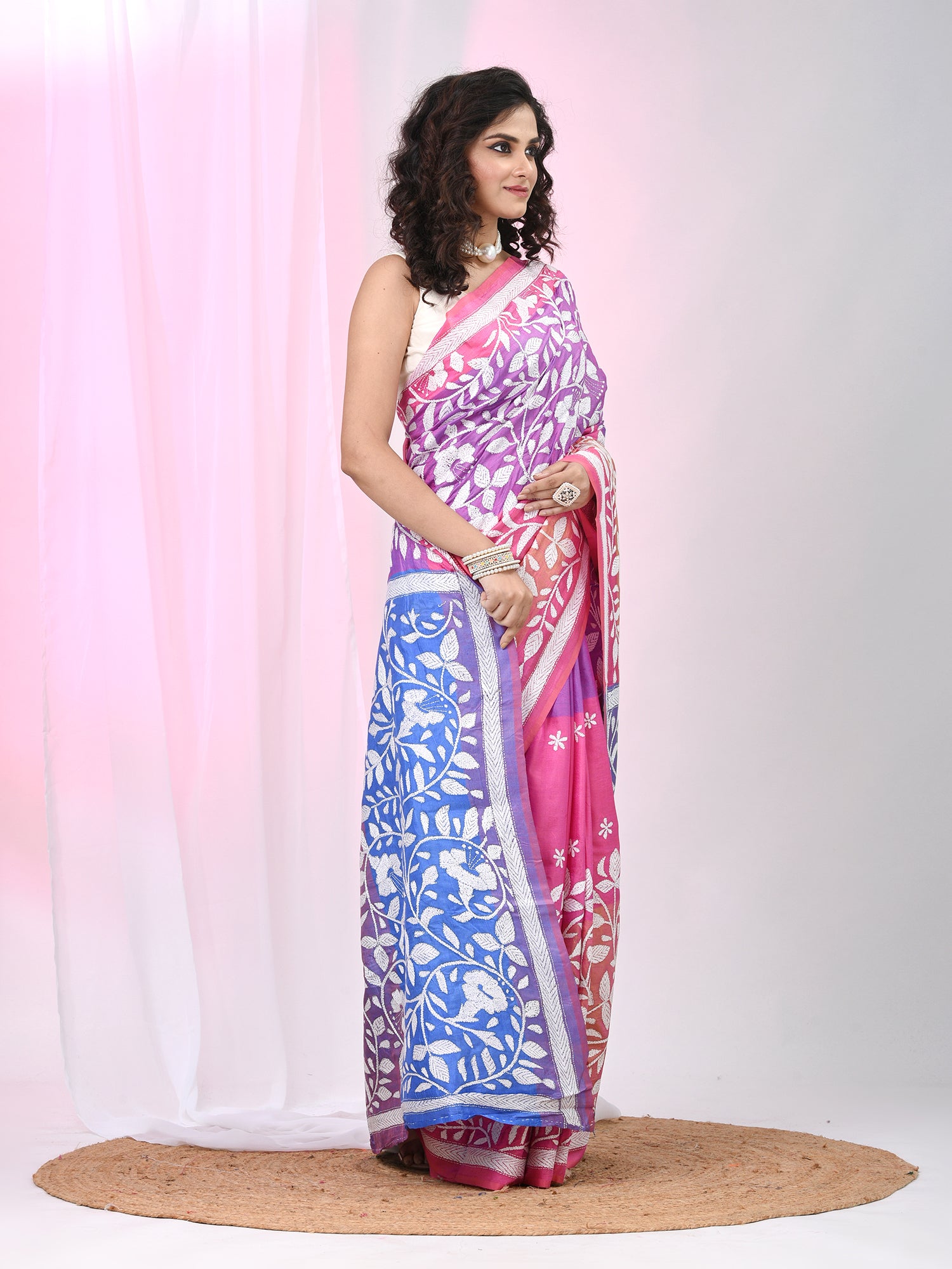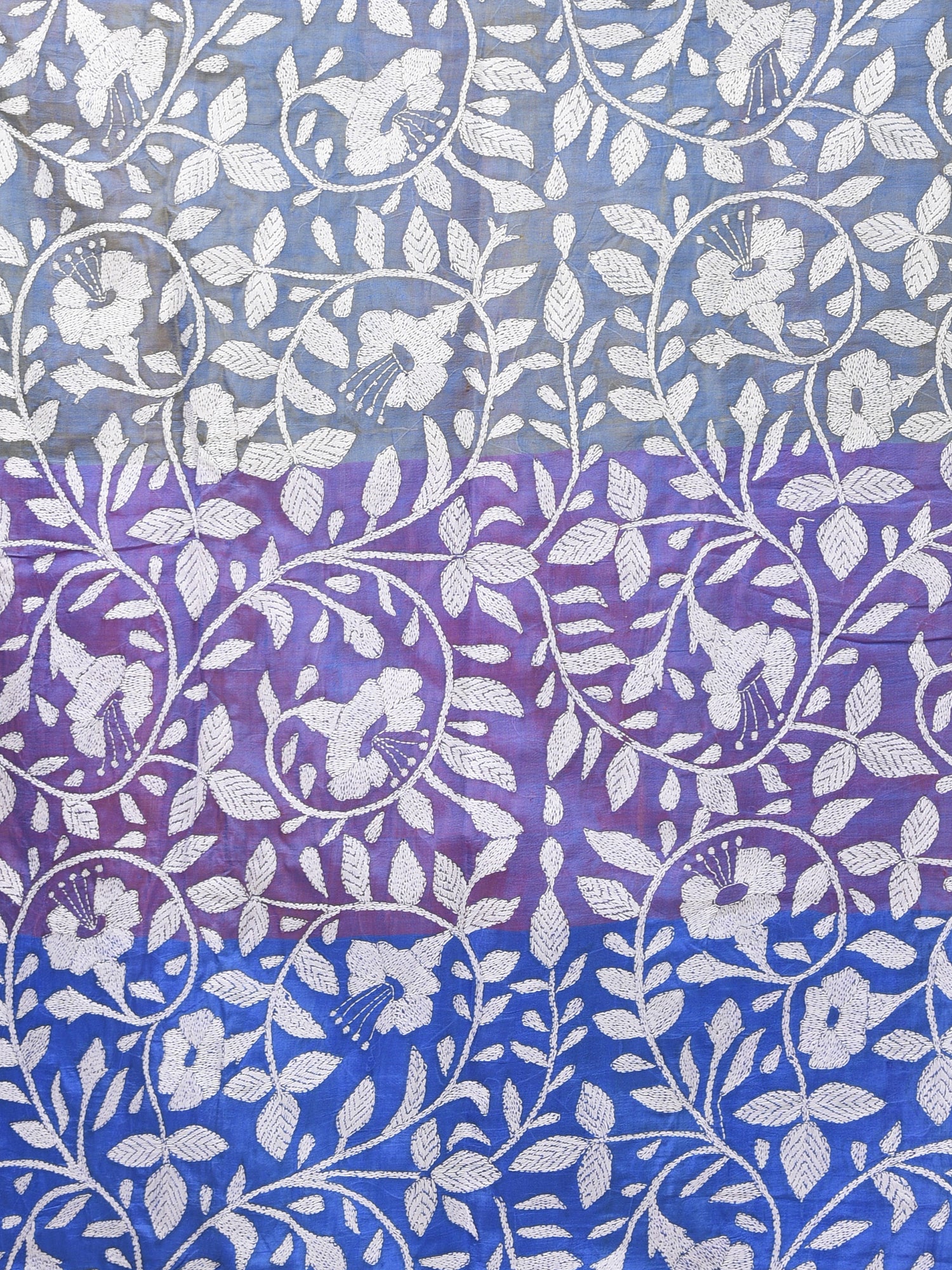 Embrace the elegance of tradition with this stunning Tussar Silk Kantha saree. The rich color gradient, transitioning from deep purple to soft pink and blue, is beautifully complemented by intricate hand-thread work floral patterns. The Kantha stitching, a hallmark of Bengali craftsmanship, adds a unique texture and timeless charm to the saree. Crafted from premium Tussar silk, this saree offers a luxurious drape and feel, perfect for festive occasions, weddings, or cultural celebrations. Style it with traditional jewelry for an exquisite ensemble.