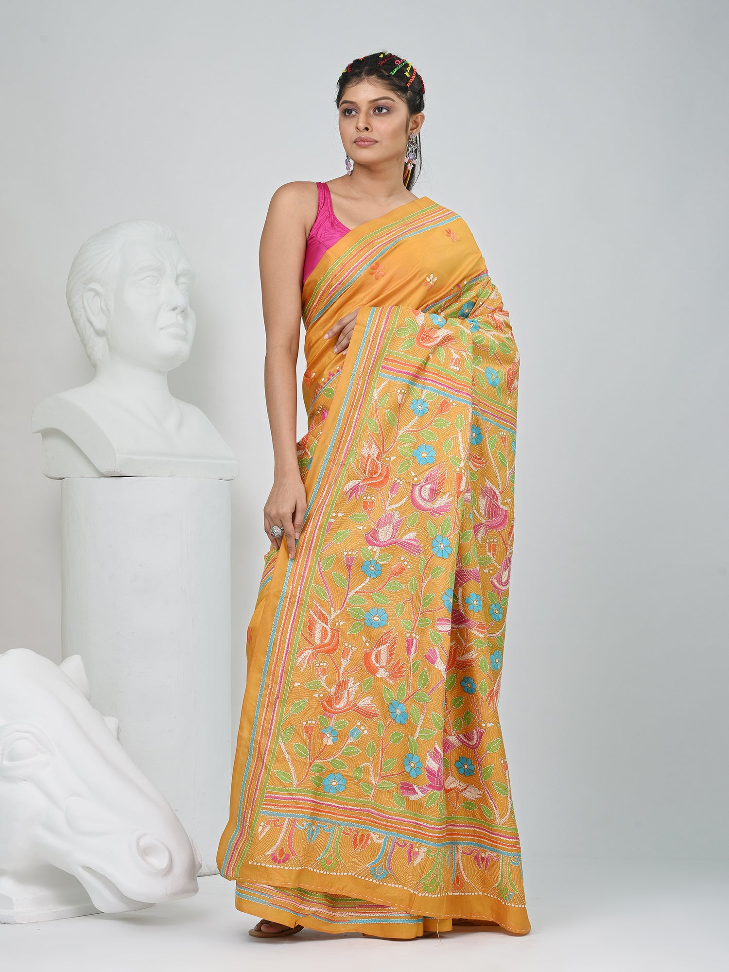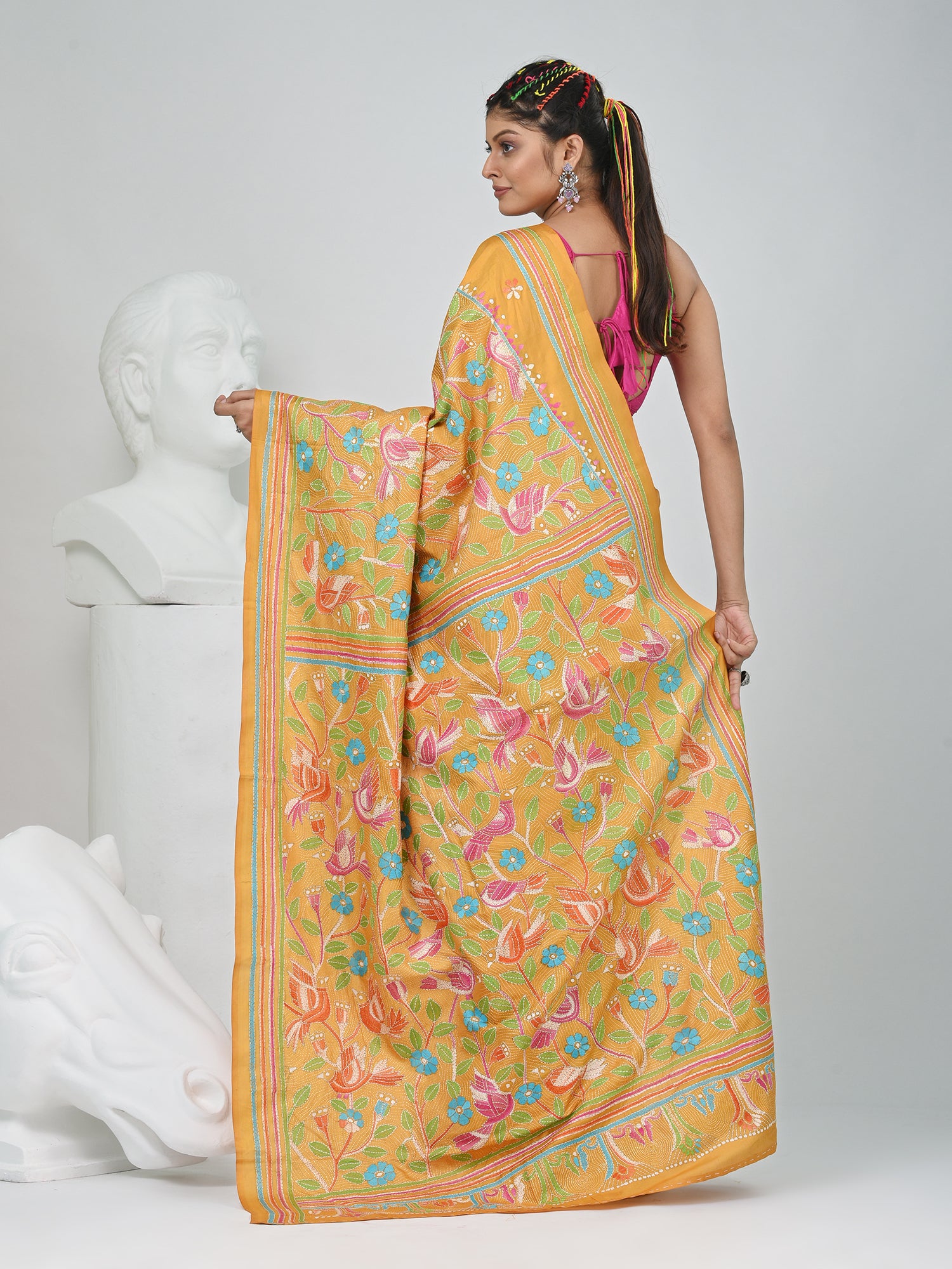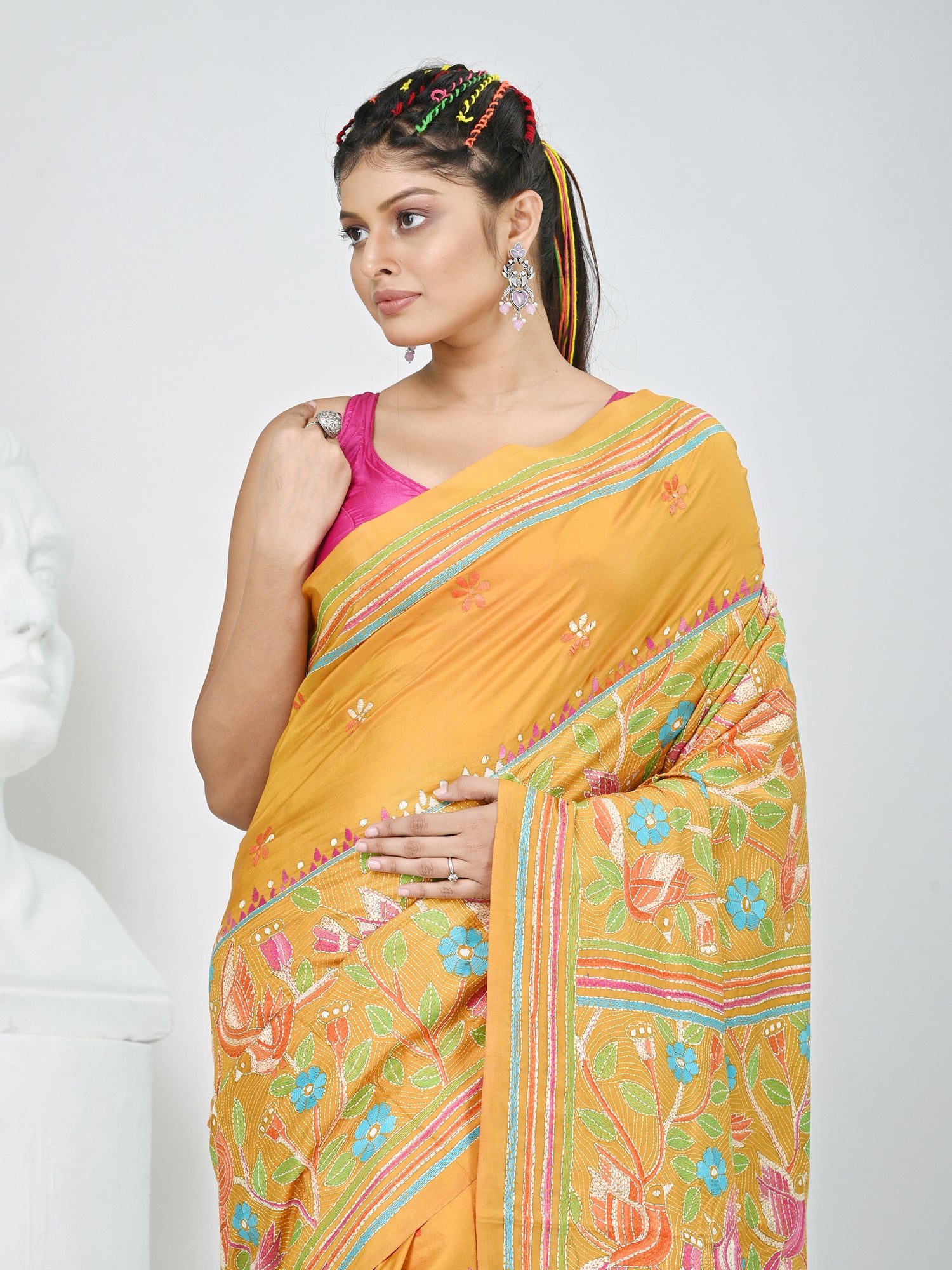 Vibrant Mustard Bangalore Silk Nakshi Kantha Saree with Floral Thread Work