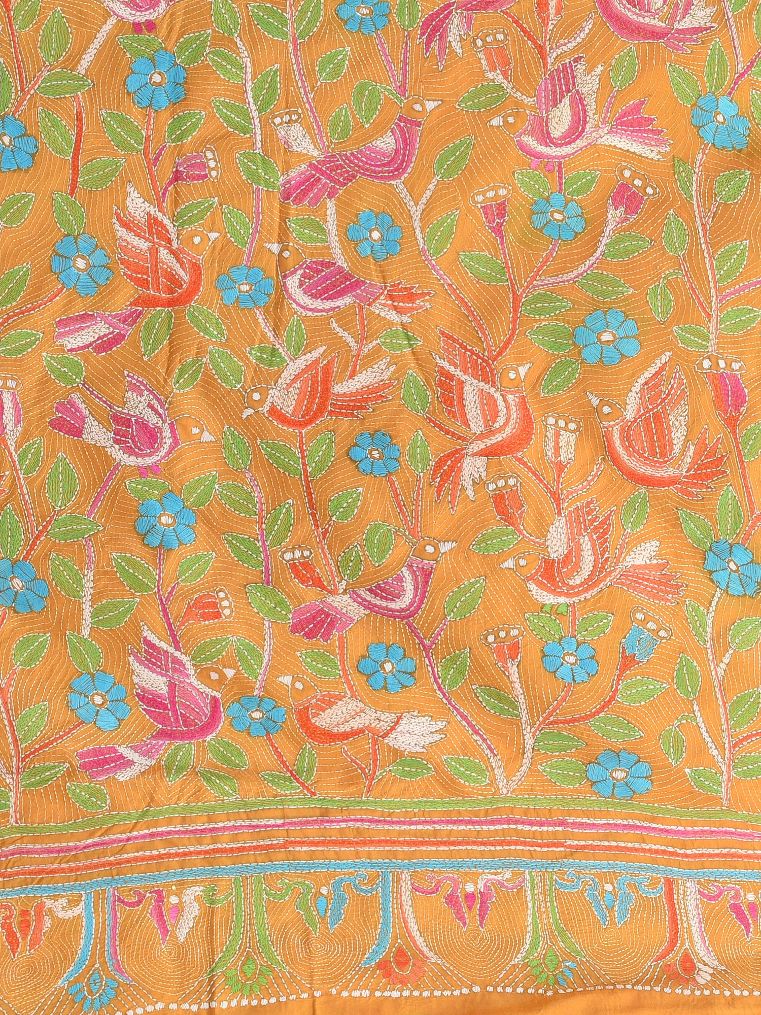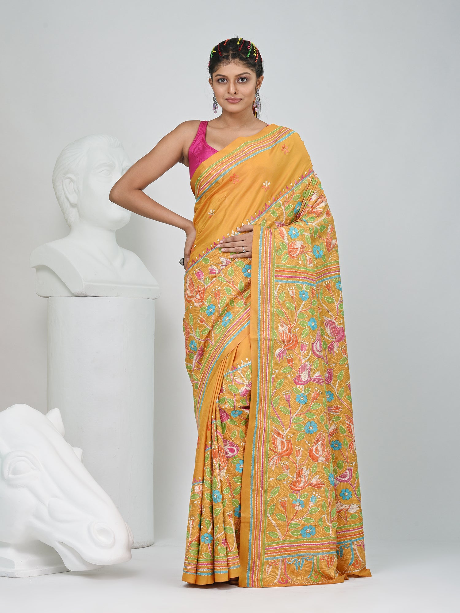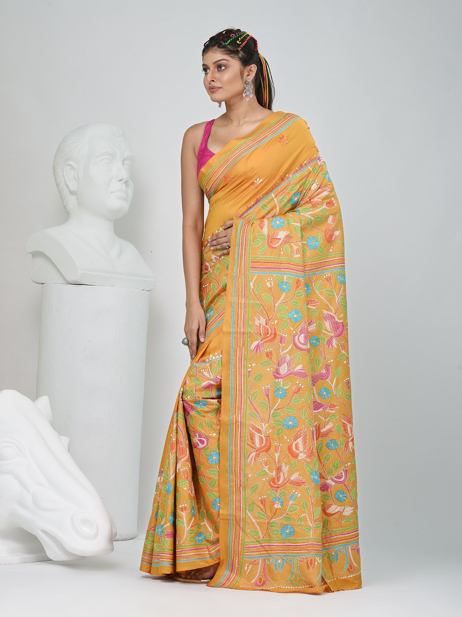 Vibrant Mustard Bangalore Silk Nakshi Kantha Saree with Floral Thread Work