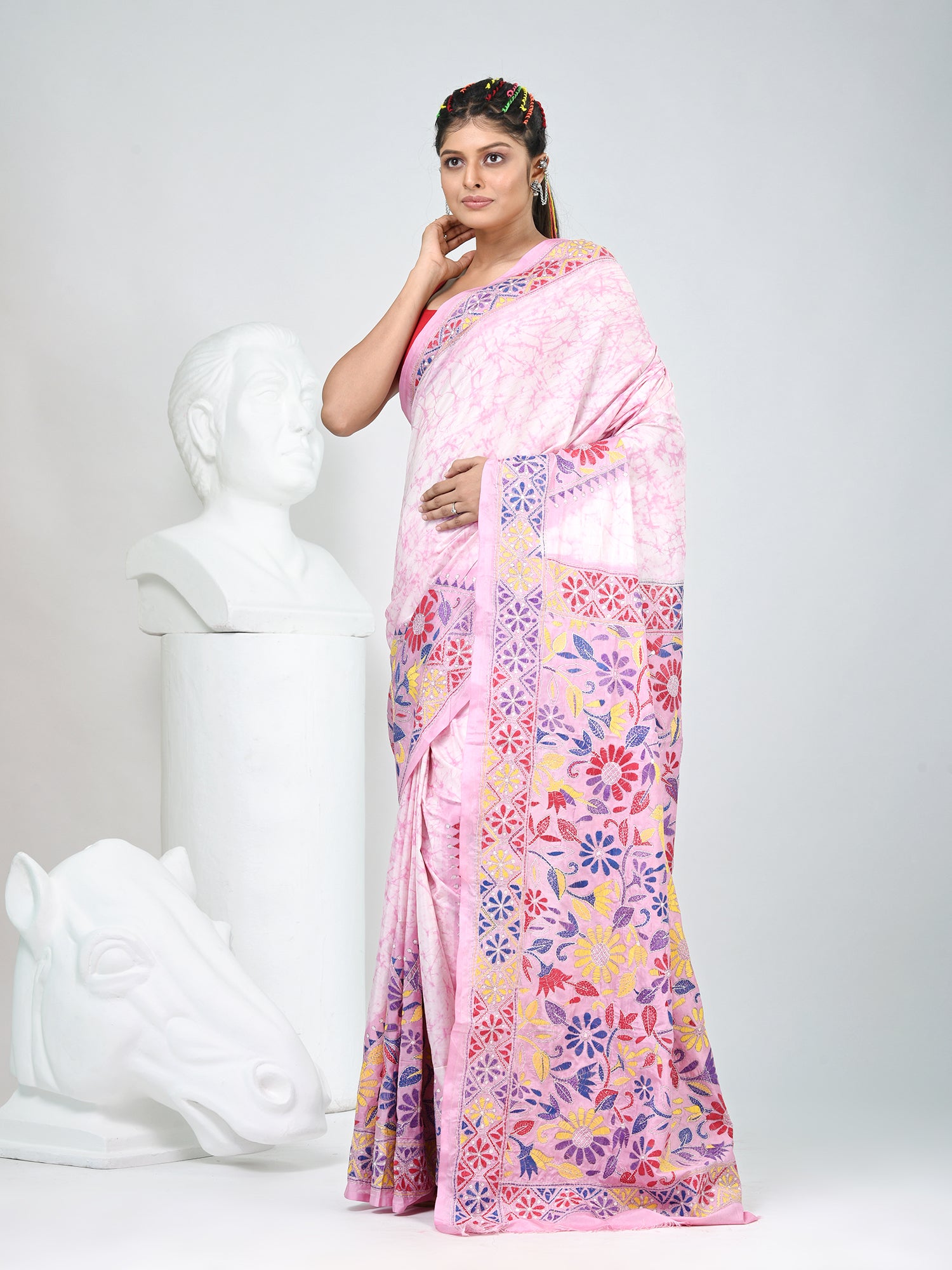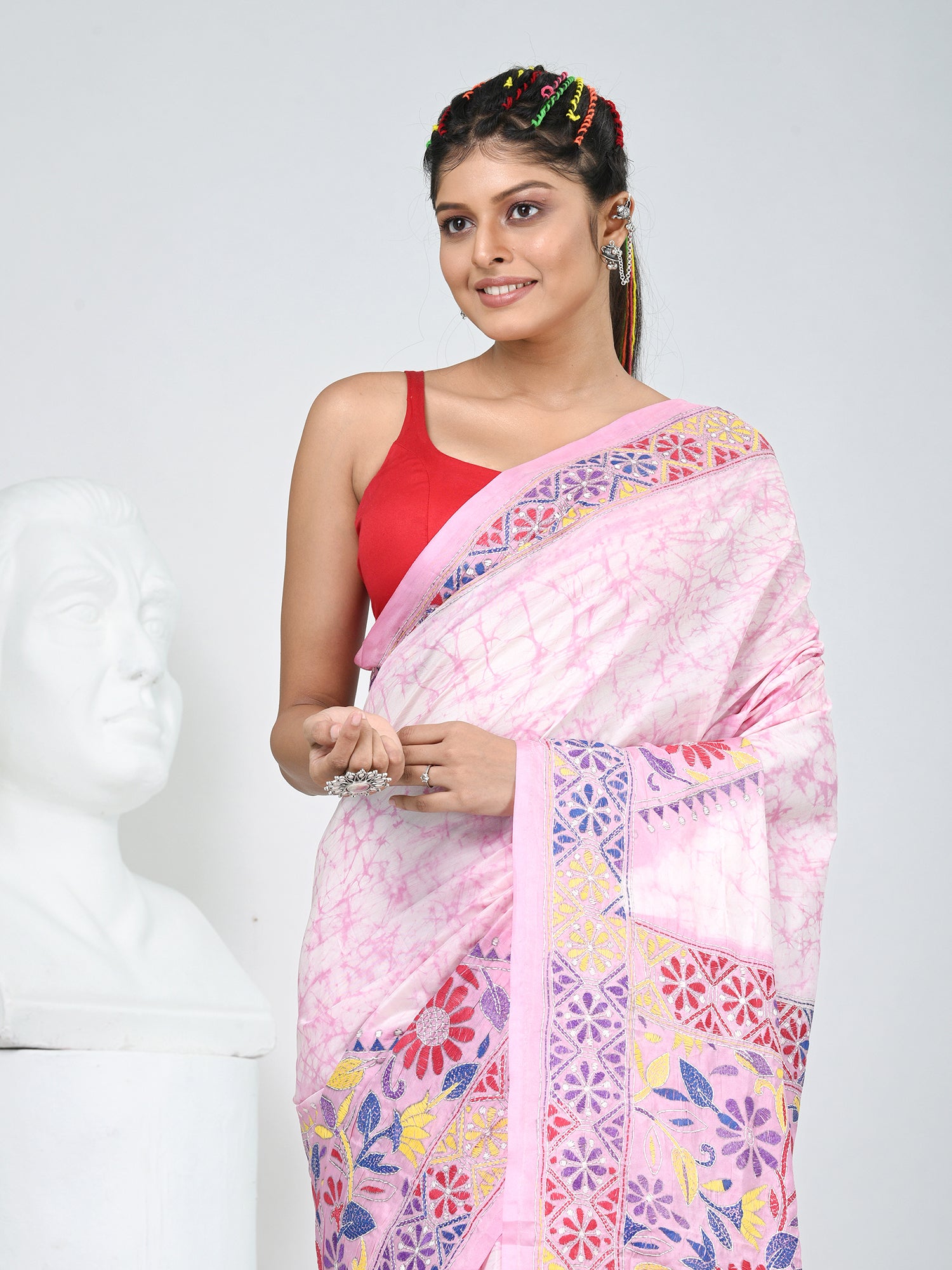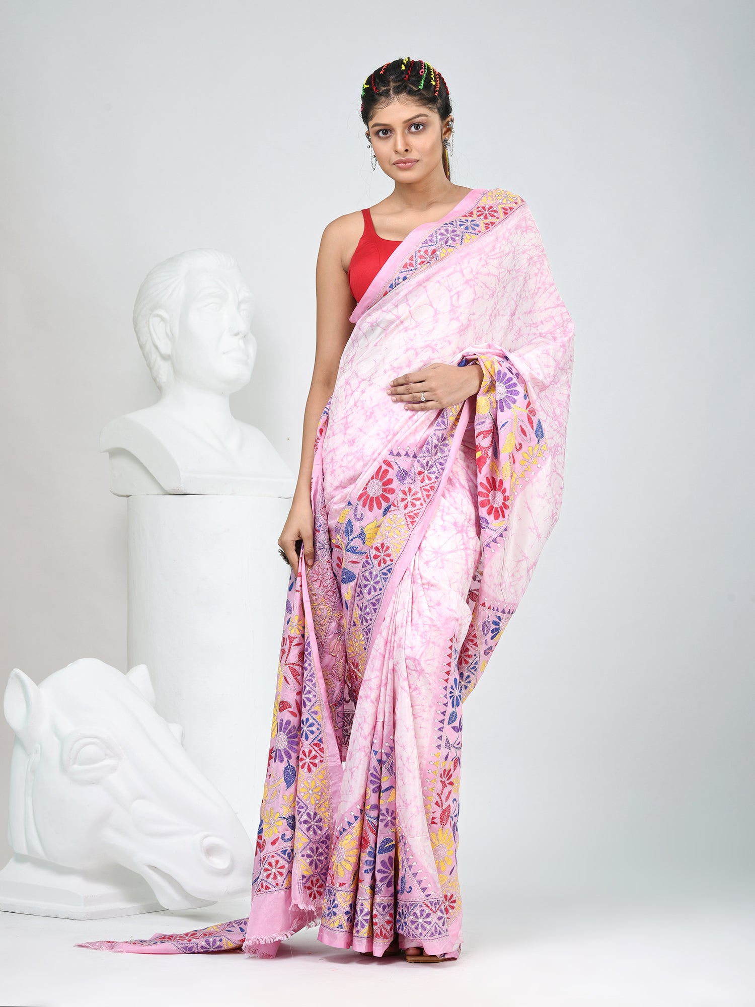 White And Pink Silk Batik Print Kantha Work Saree with Floral Motifs