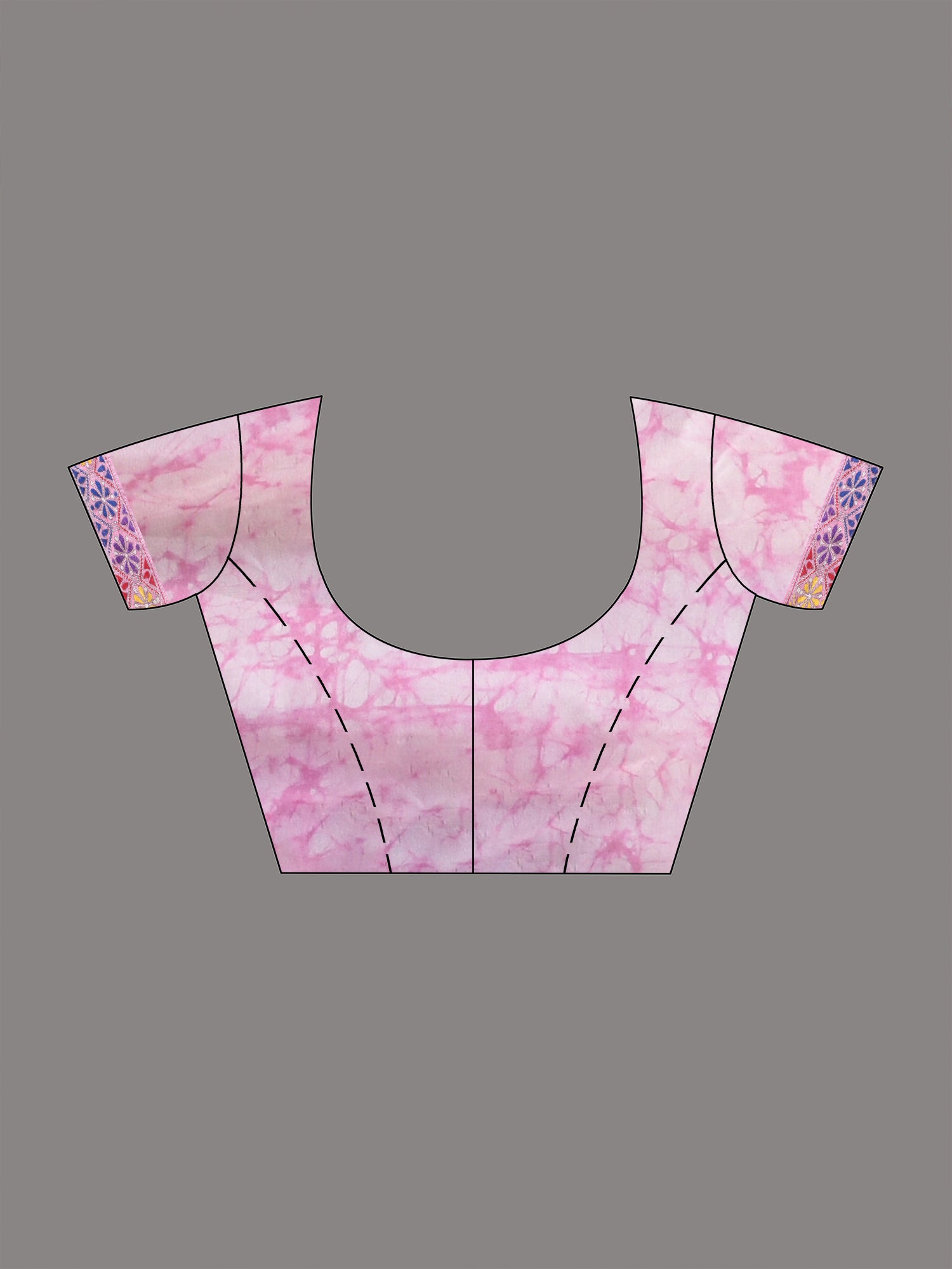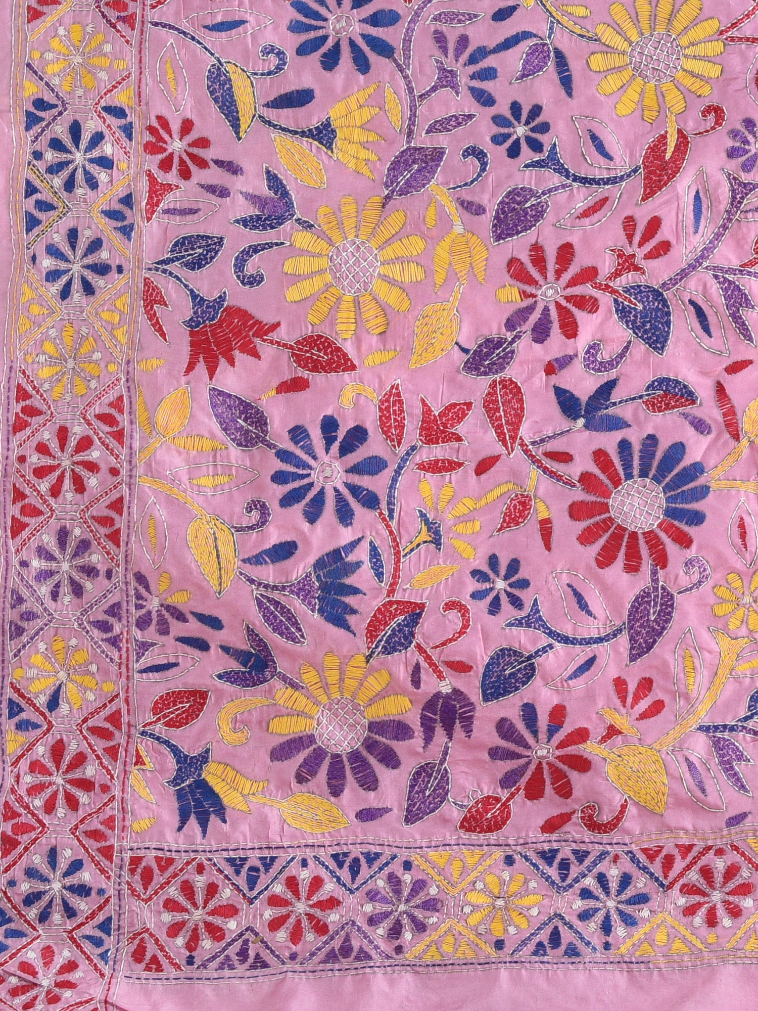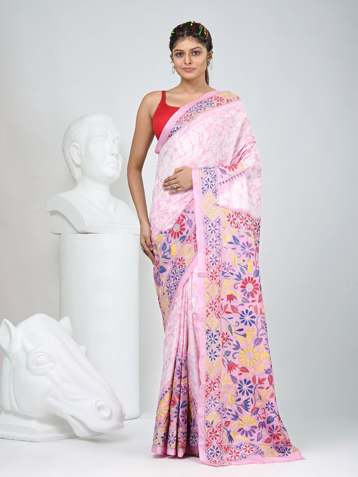White And Pink Silk Batik Print Kantha Work Saree with Floral Motifs