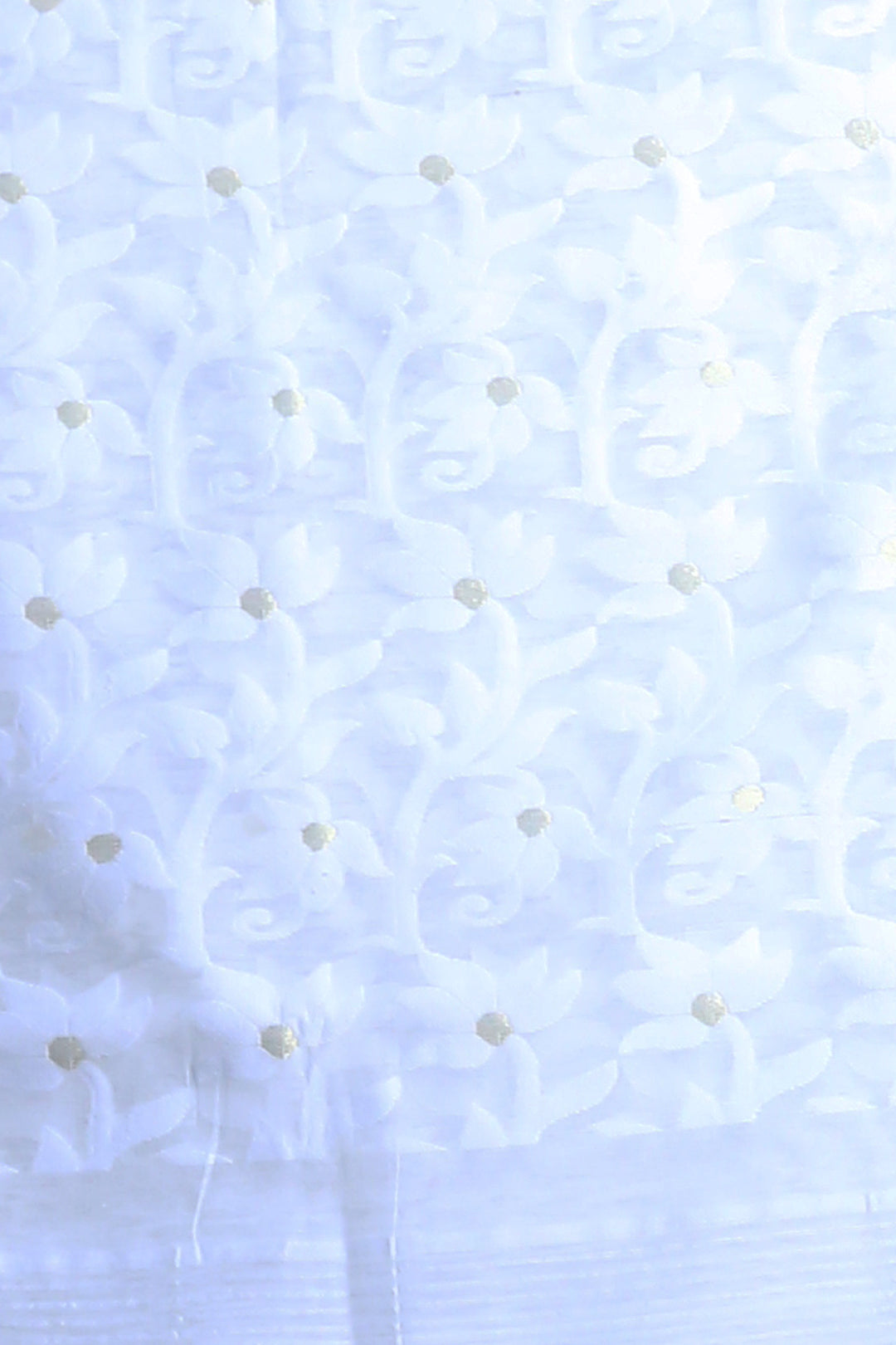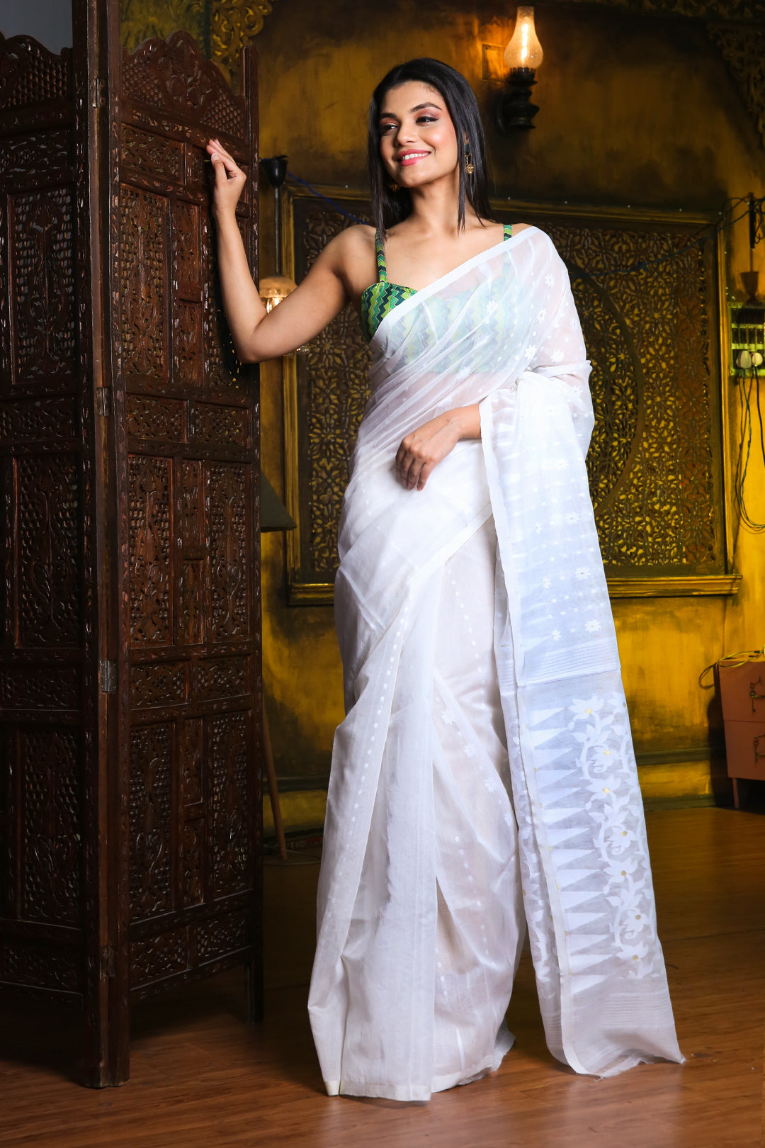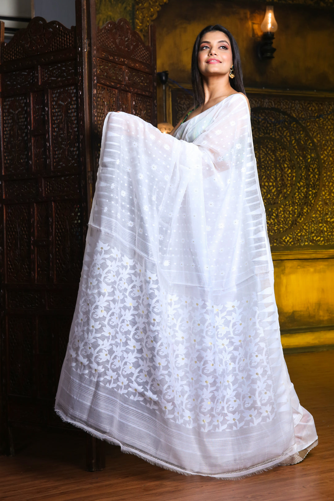 Suit your elegant self in this white silk cotton jamdani saree. Woven motifs decorate the whole body of the saree. The pallu has woven floral designs to complete the look.