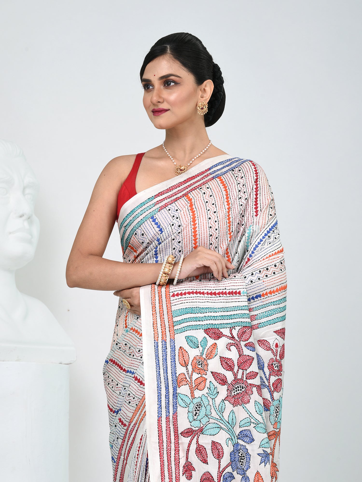 White Silk Kantha Stitch Saree with Multicolor Thread Work