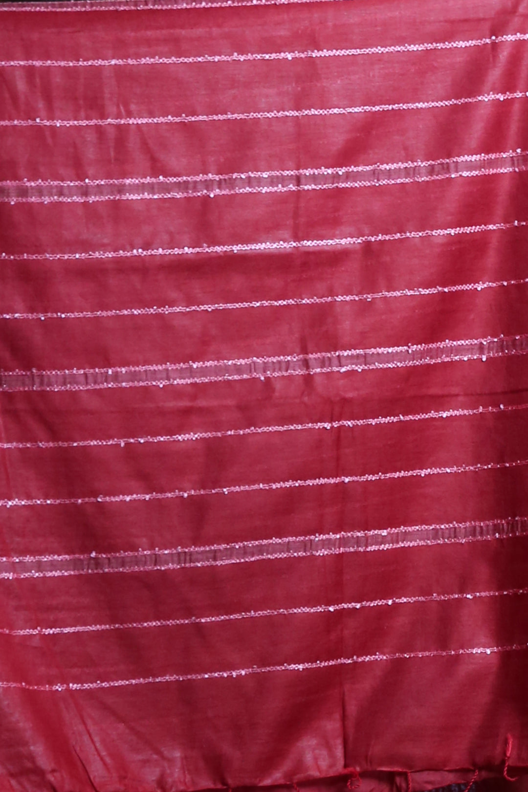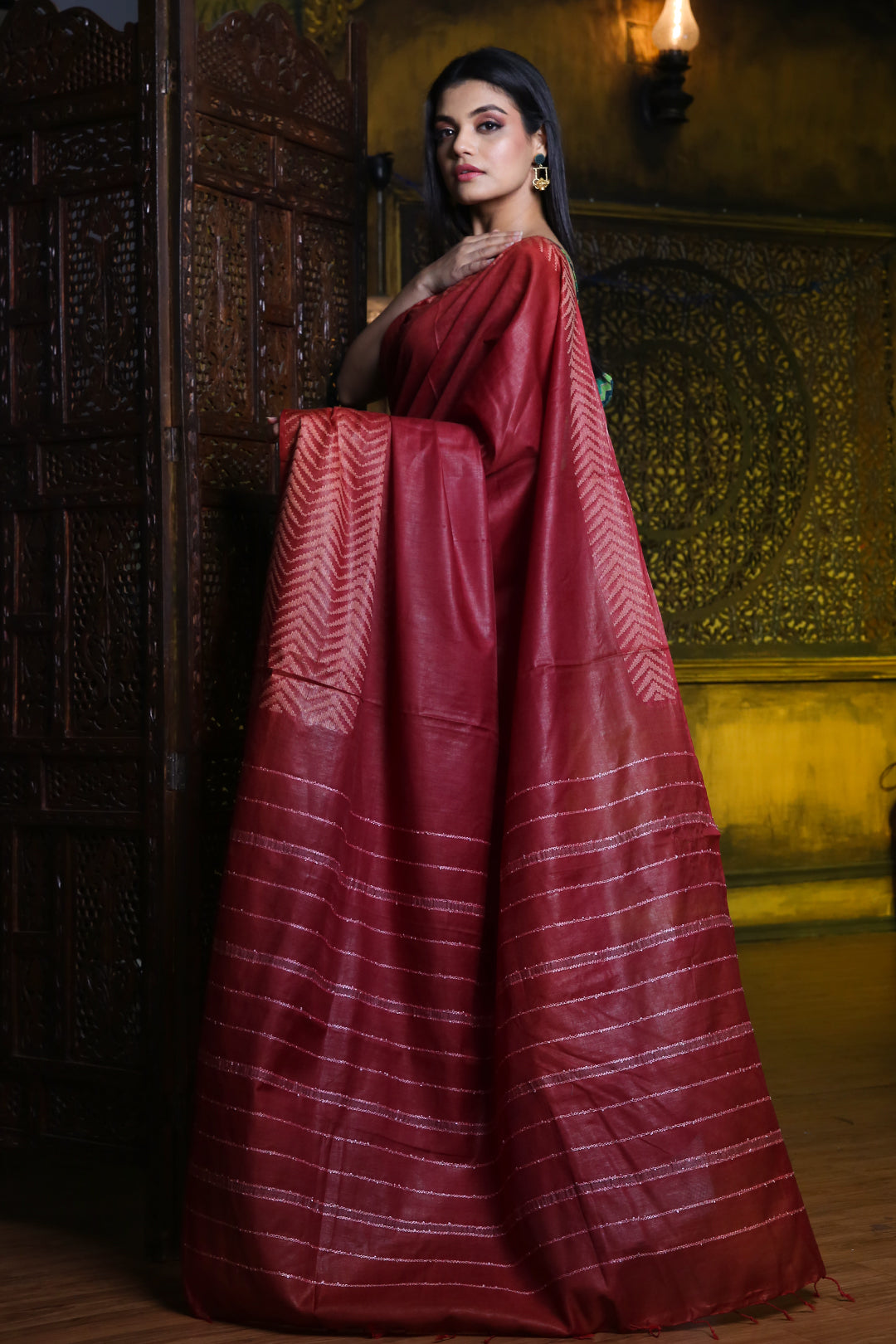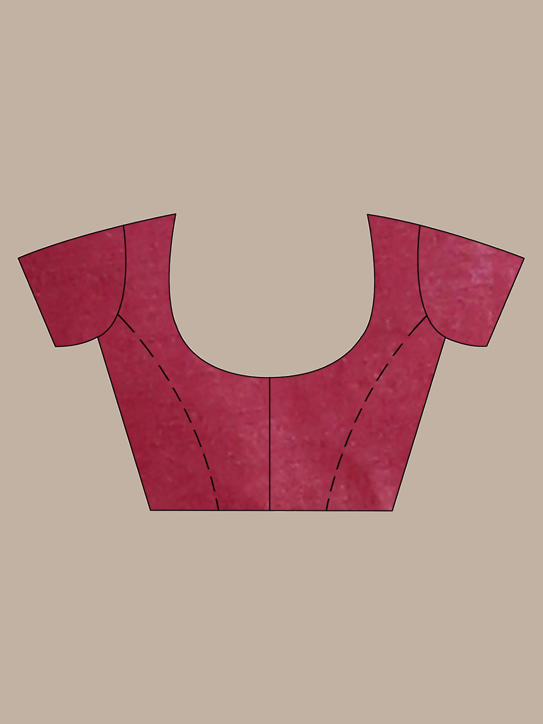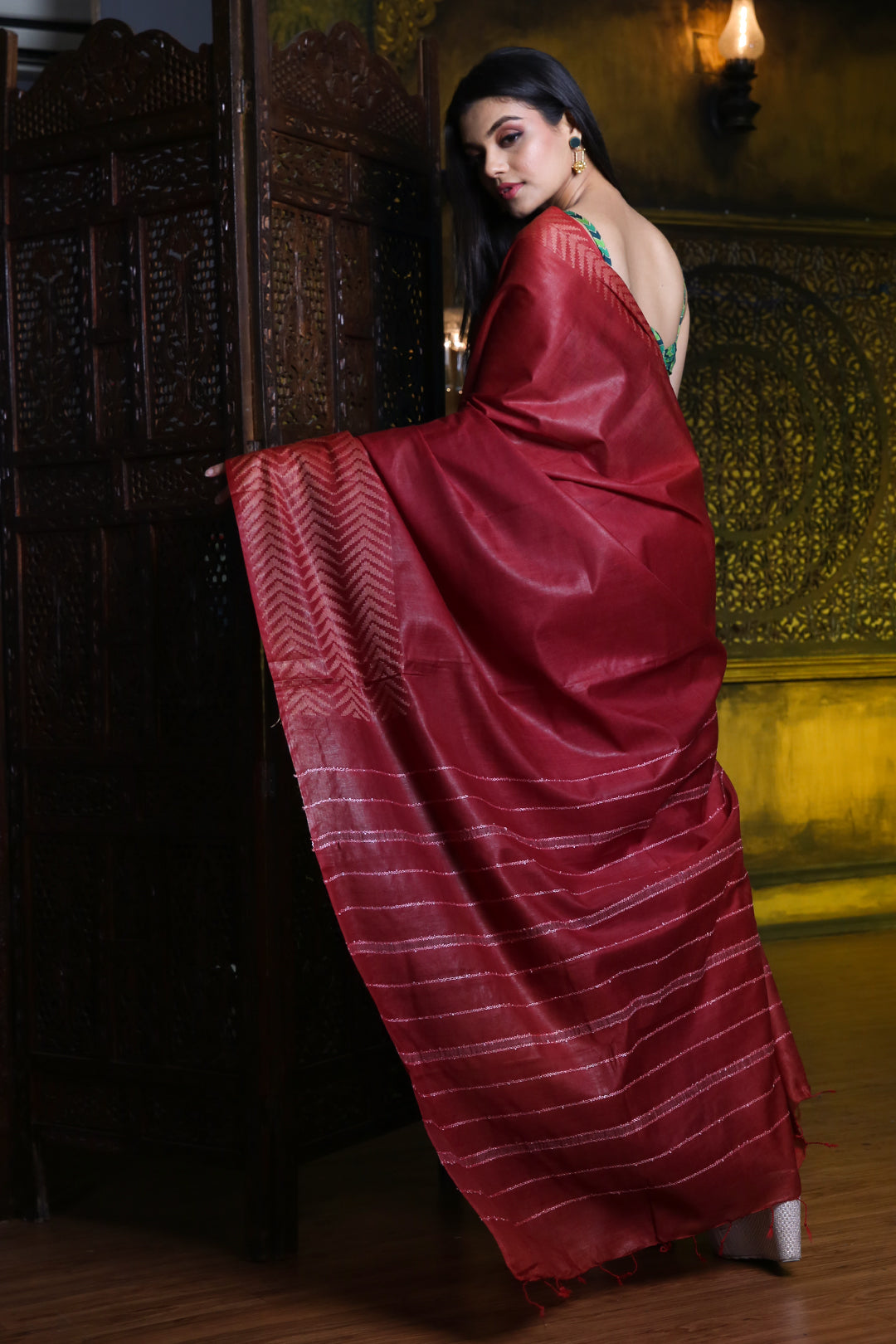 Enticing and charismatic is what you will look in this wine silk blend saree. The borders have woven geometric patterns. The pallu has woven stripes to complete the look.