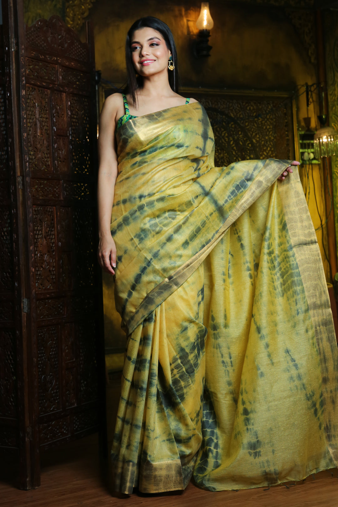 Look enticing in this yellow silk blend saree. It has tie and dye designs with green all over. The borders have woven zari to complete the look.
