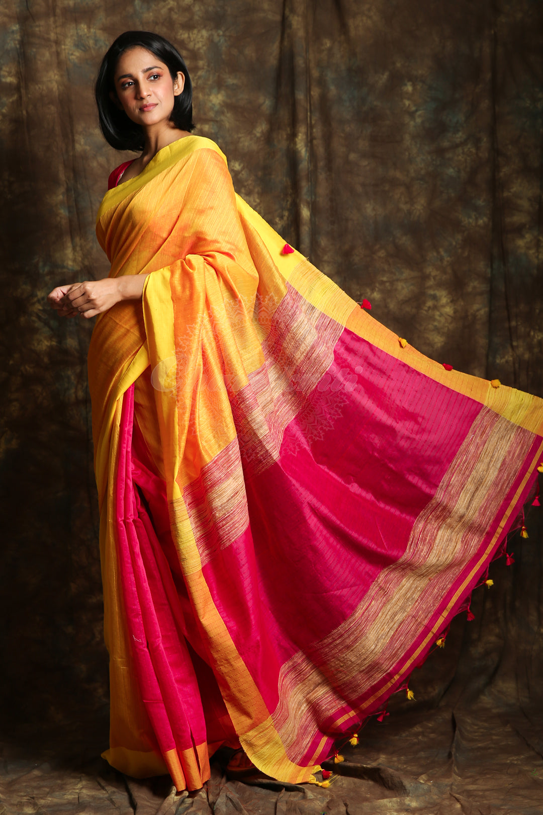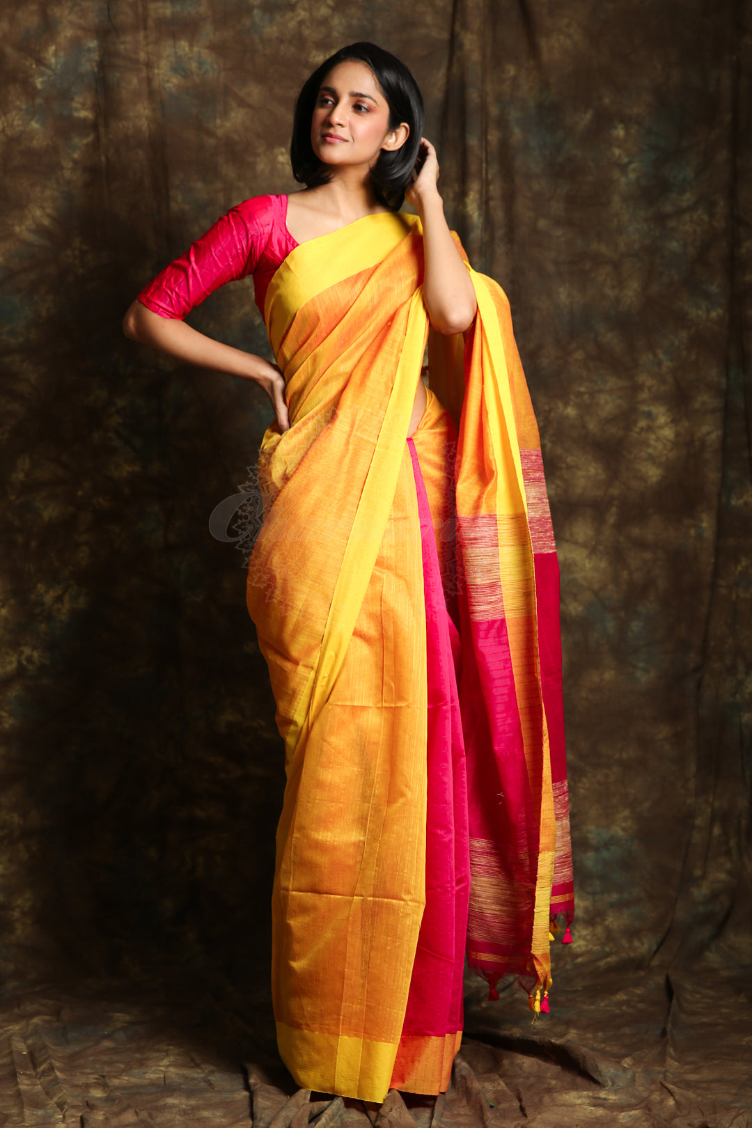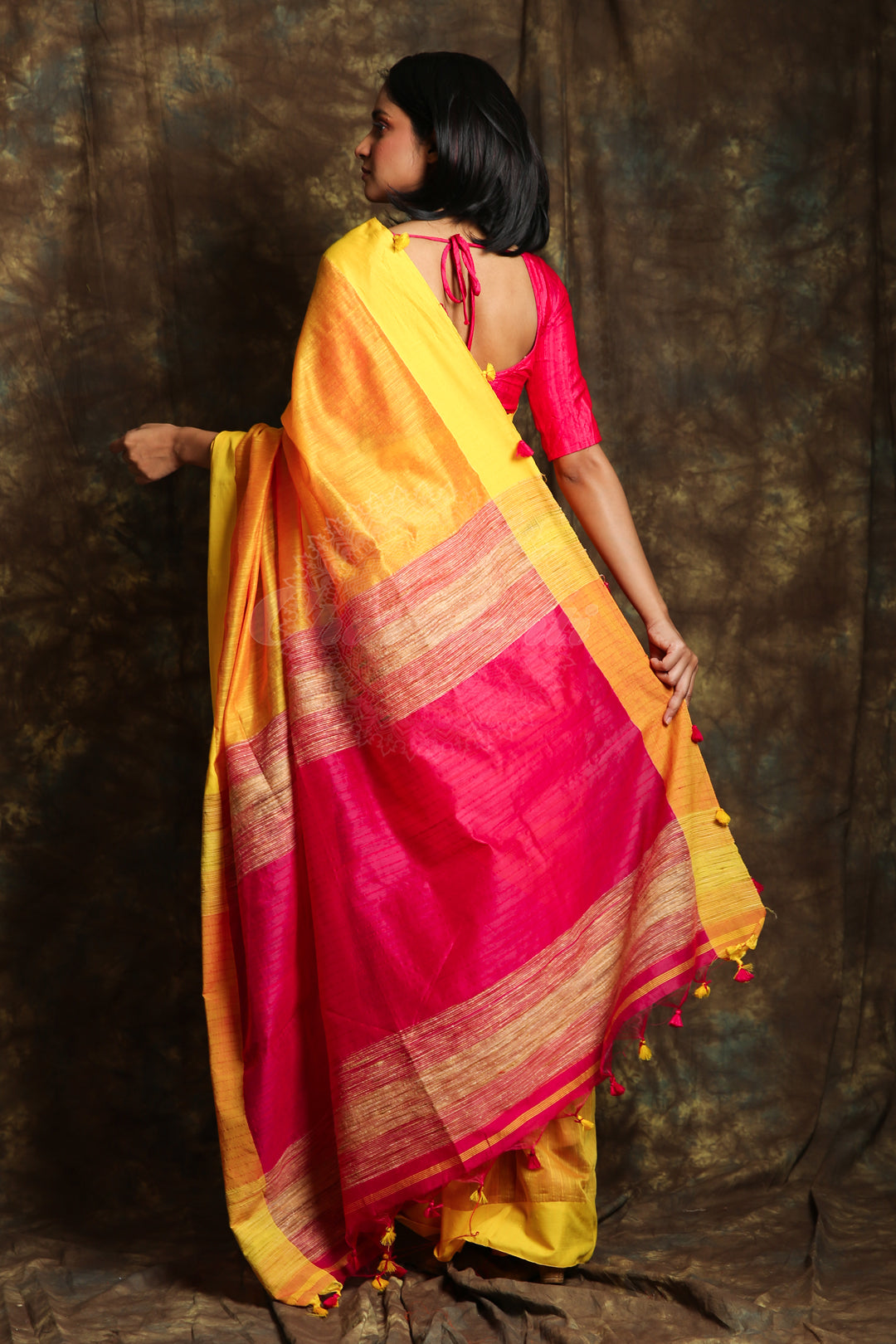 The blended cotton based yellow & pink color saree have all over stripes body. The pallu have pink color gheecha stripes work and pink border.