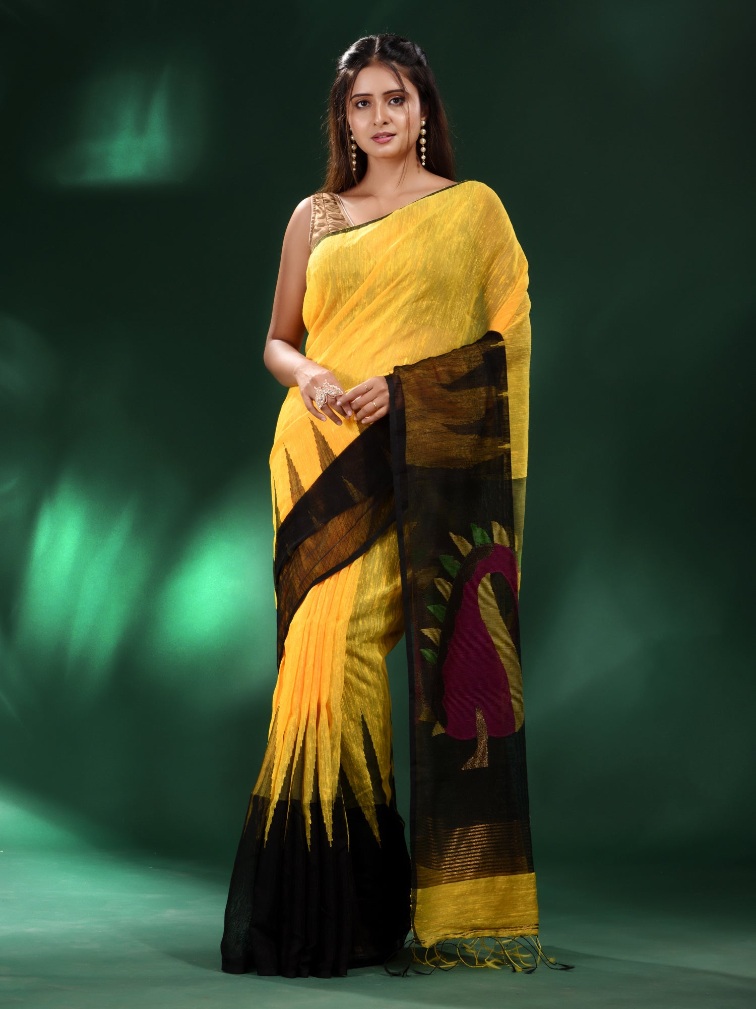 This fastive season, flaunt your curves in the freshly arrived handloom sarees. Crafted in silk matka fabric, this saree is perfect for festive wear. The yellow matka silk saree has solid body that gives this saree a classic look. The saree has black temple border and pallu has woven design with zari. The saree comes with a matching unstitched blouse piece.