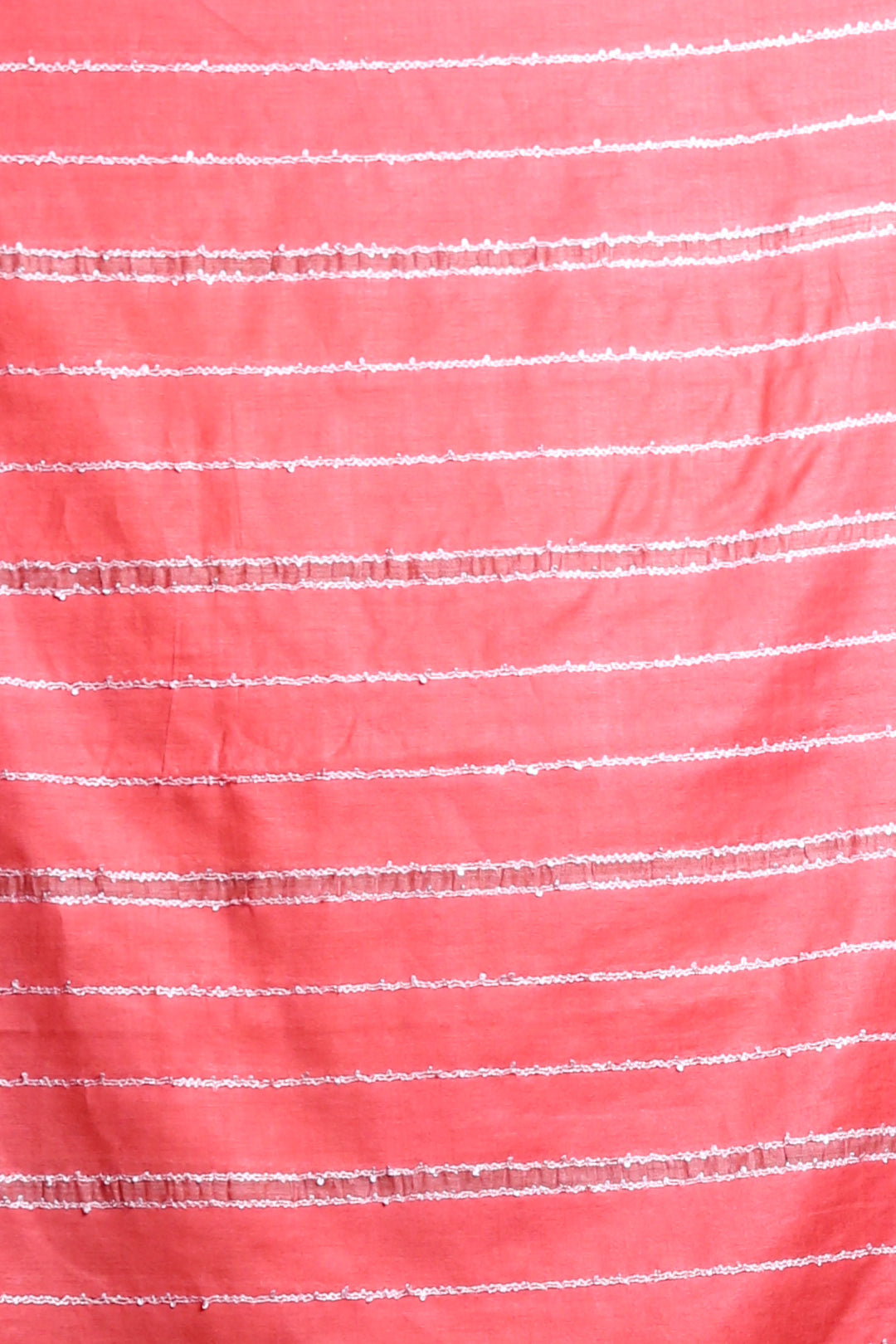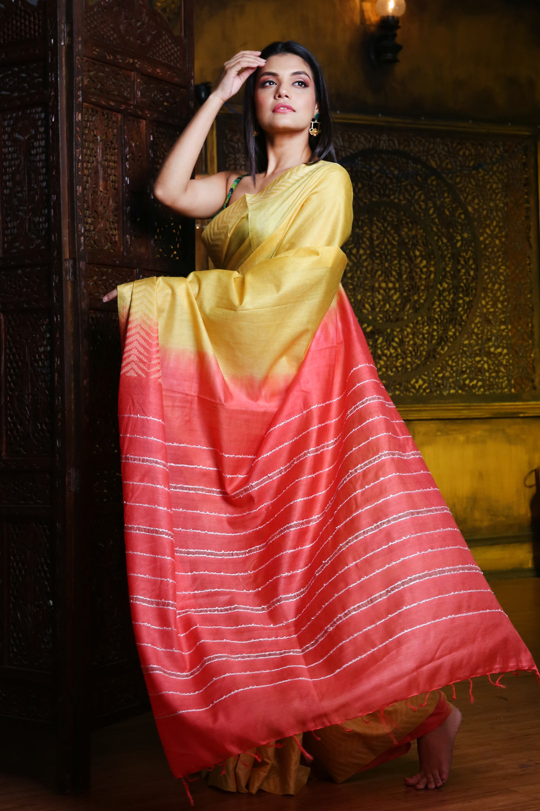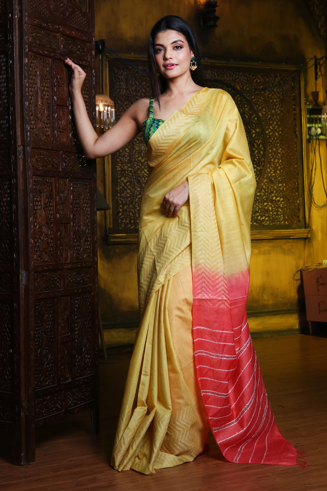 Classy and bright is what you will look in this silk blend saree. The borders have woven geometric patterns. The pallu in red has woven stripes to complete the look.
