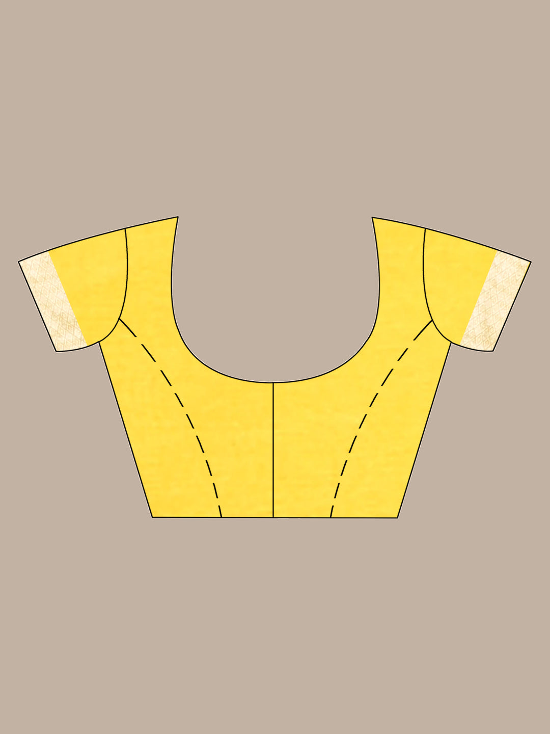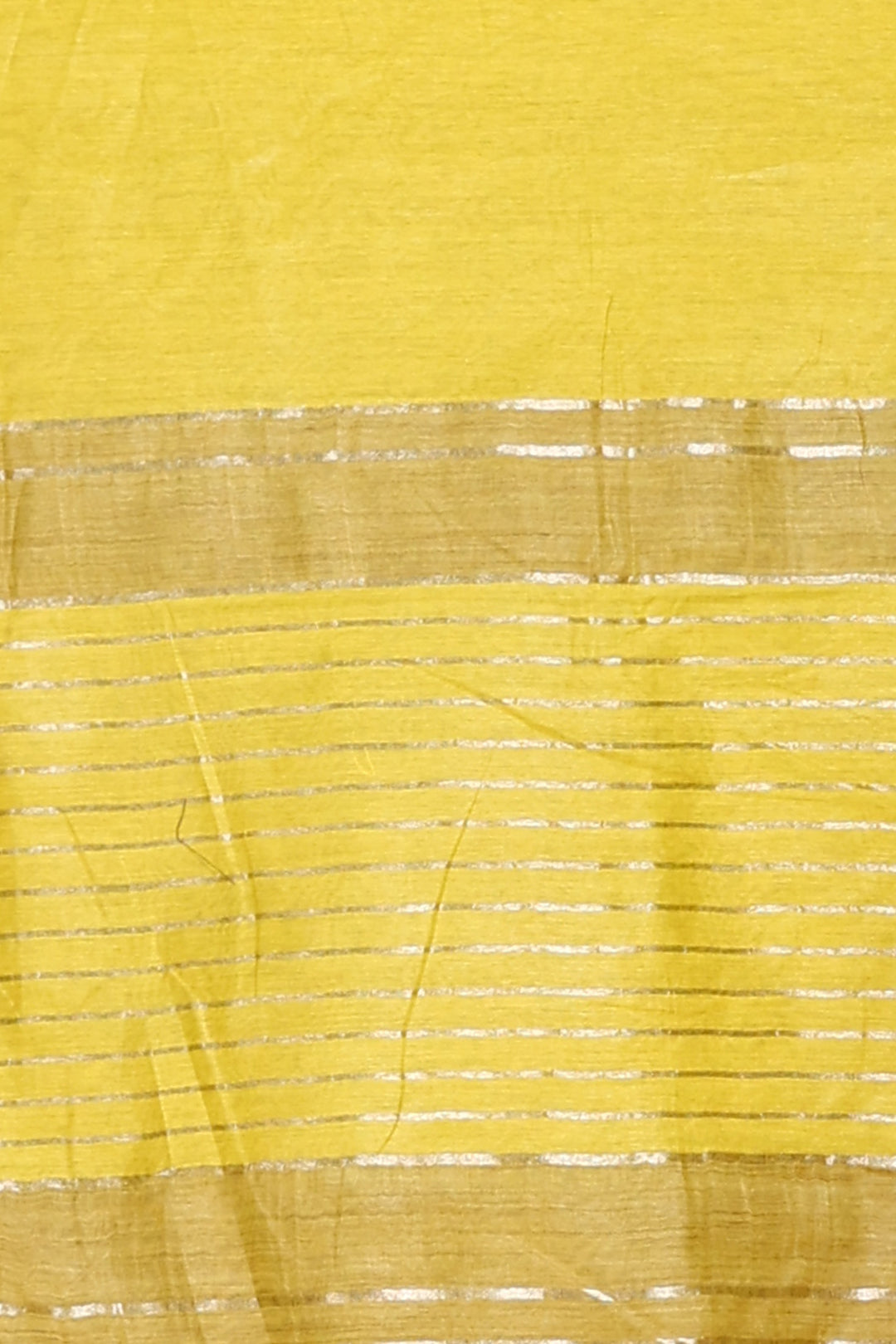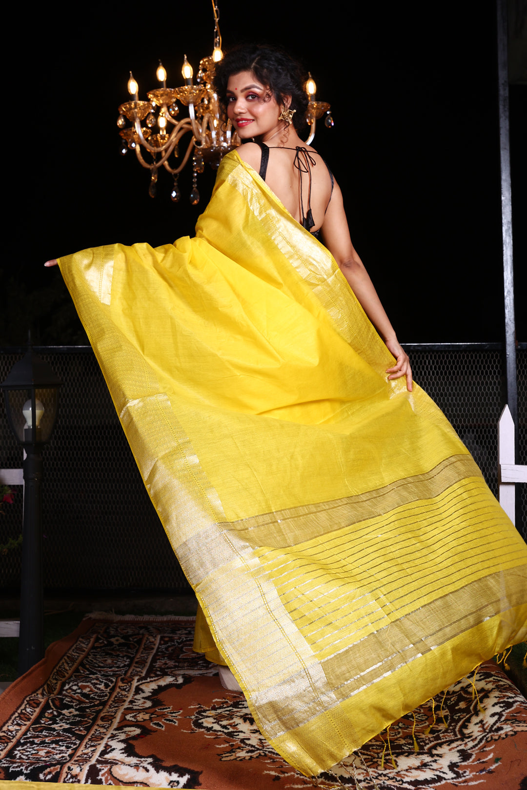 Lovingly bright is what you will look in this yellow blended silk saree. It has zari borders with striped pallu for an enticing look.