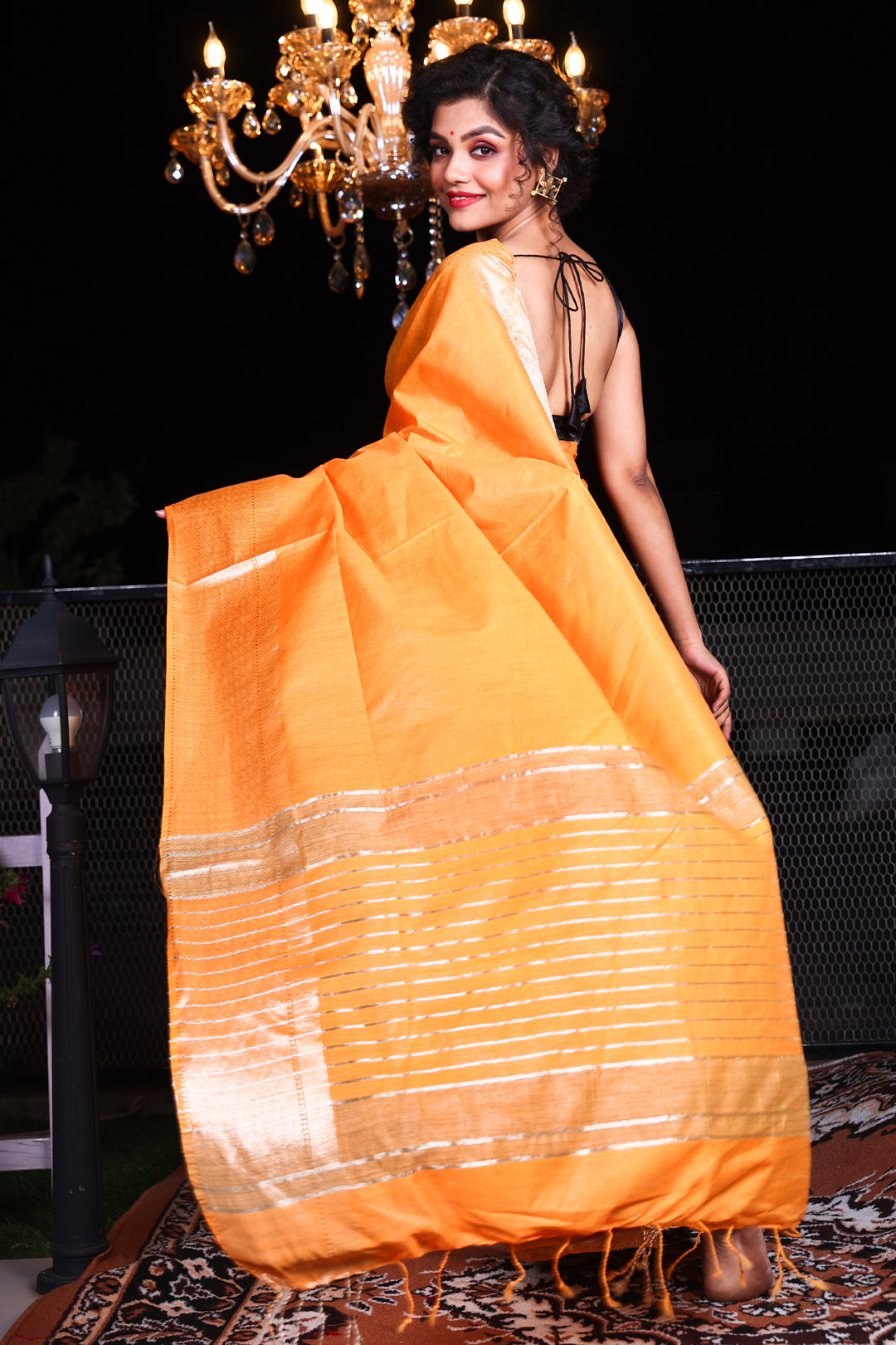 Zari Border Mustard Silk Saree With Striped Pallu