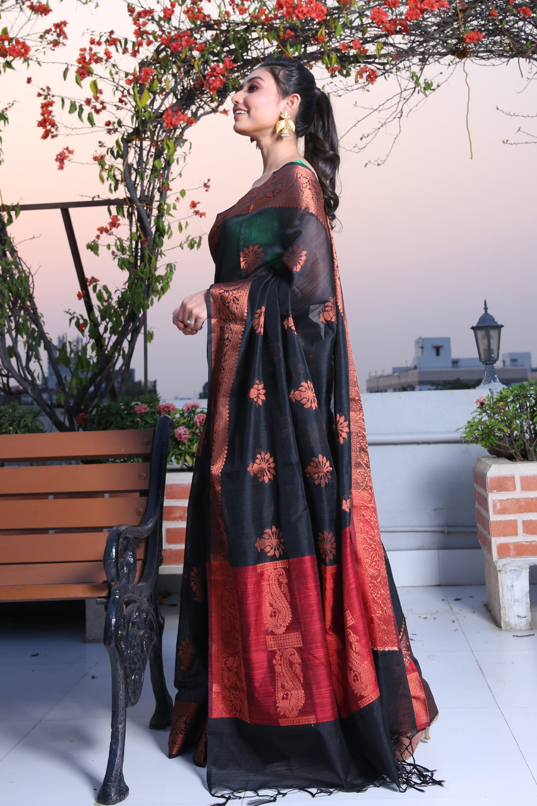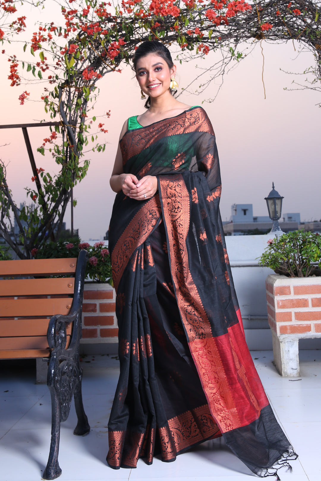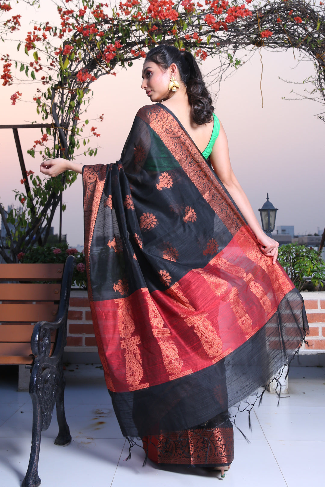 Look glamorous in this black blended silk saree. Its borders and red pallu have floral and paisley patterns to complete the look.
