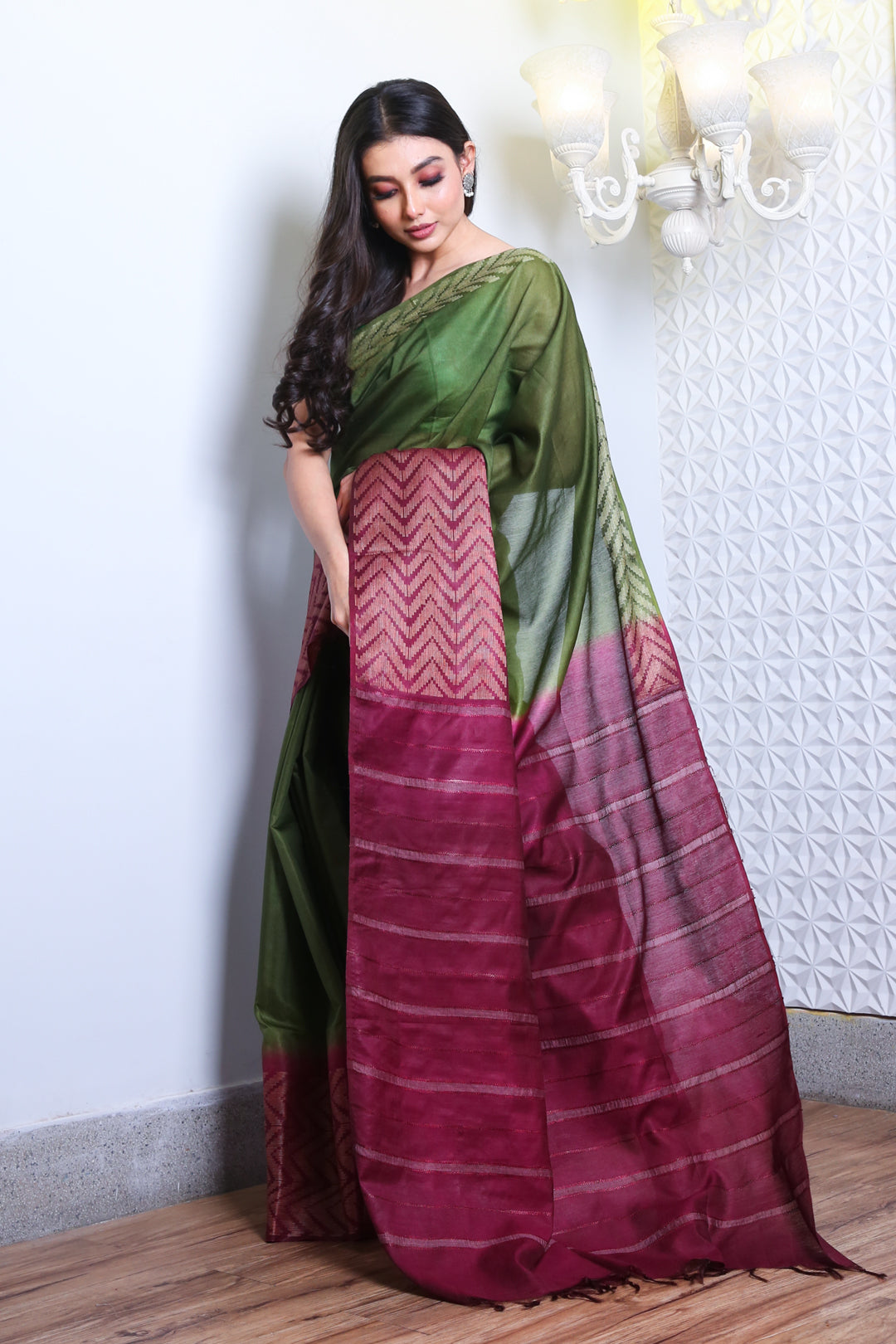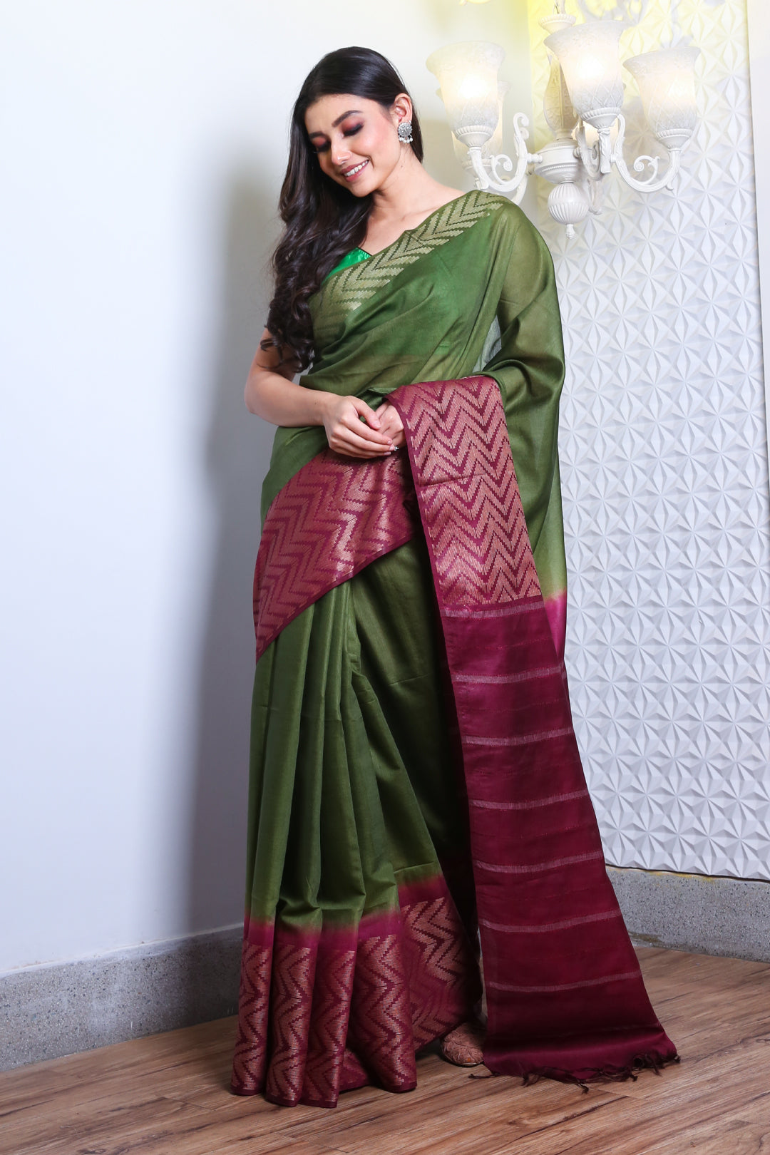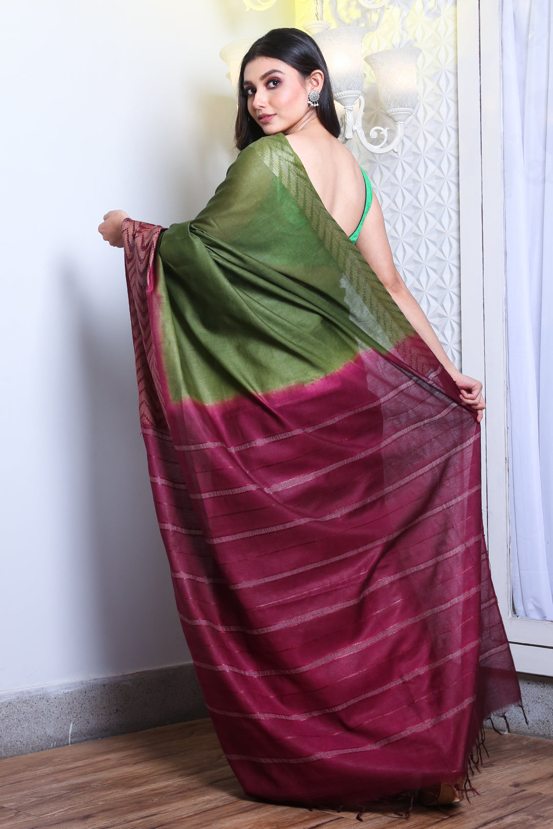 Get a lush look in this green blended silk saree. Its pallu and border in purple have woven zari patterns and stripes for an elegant appeal.