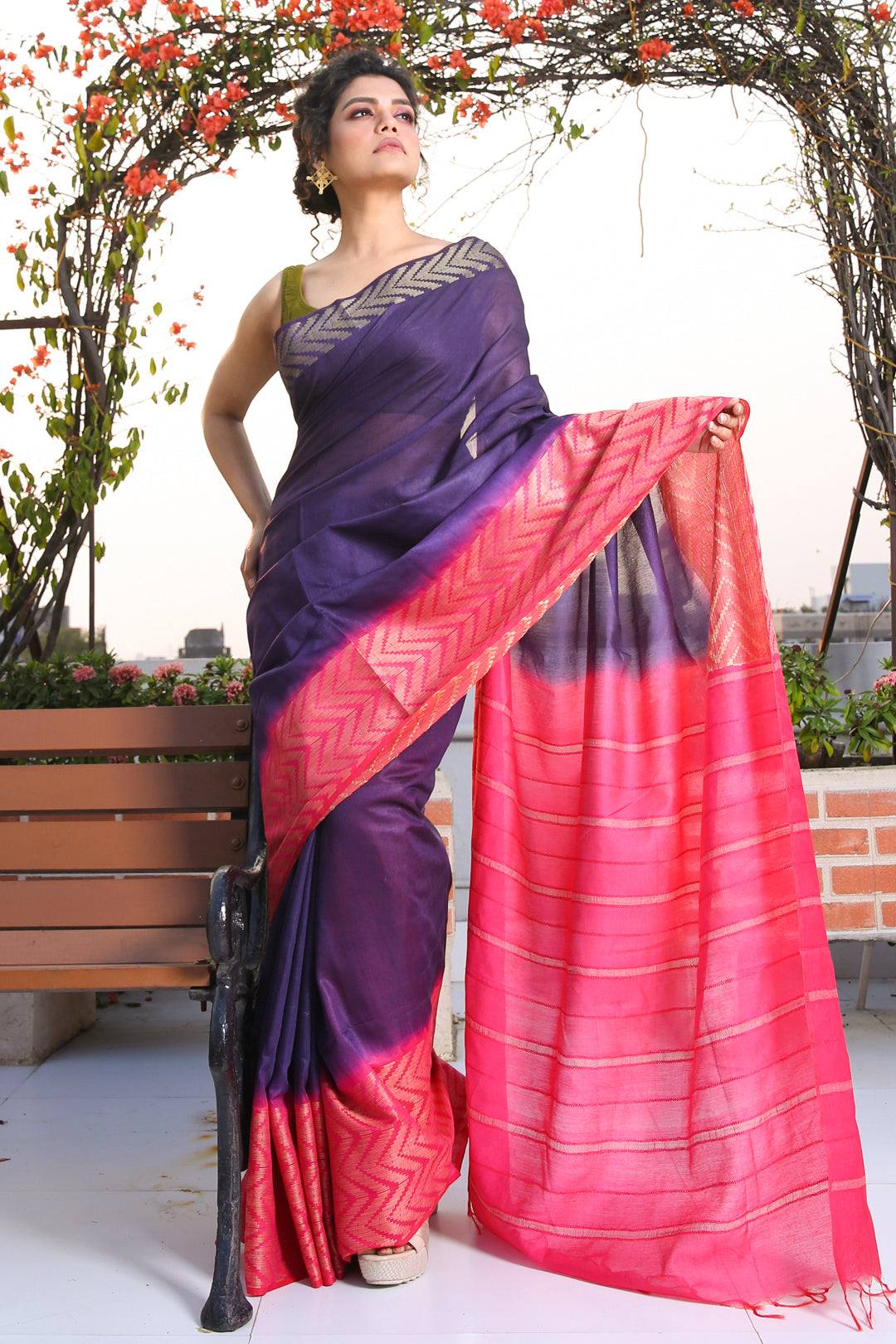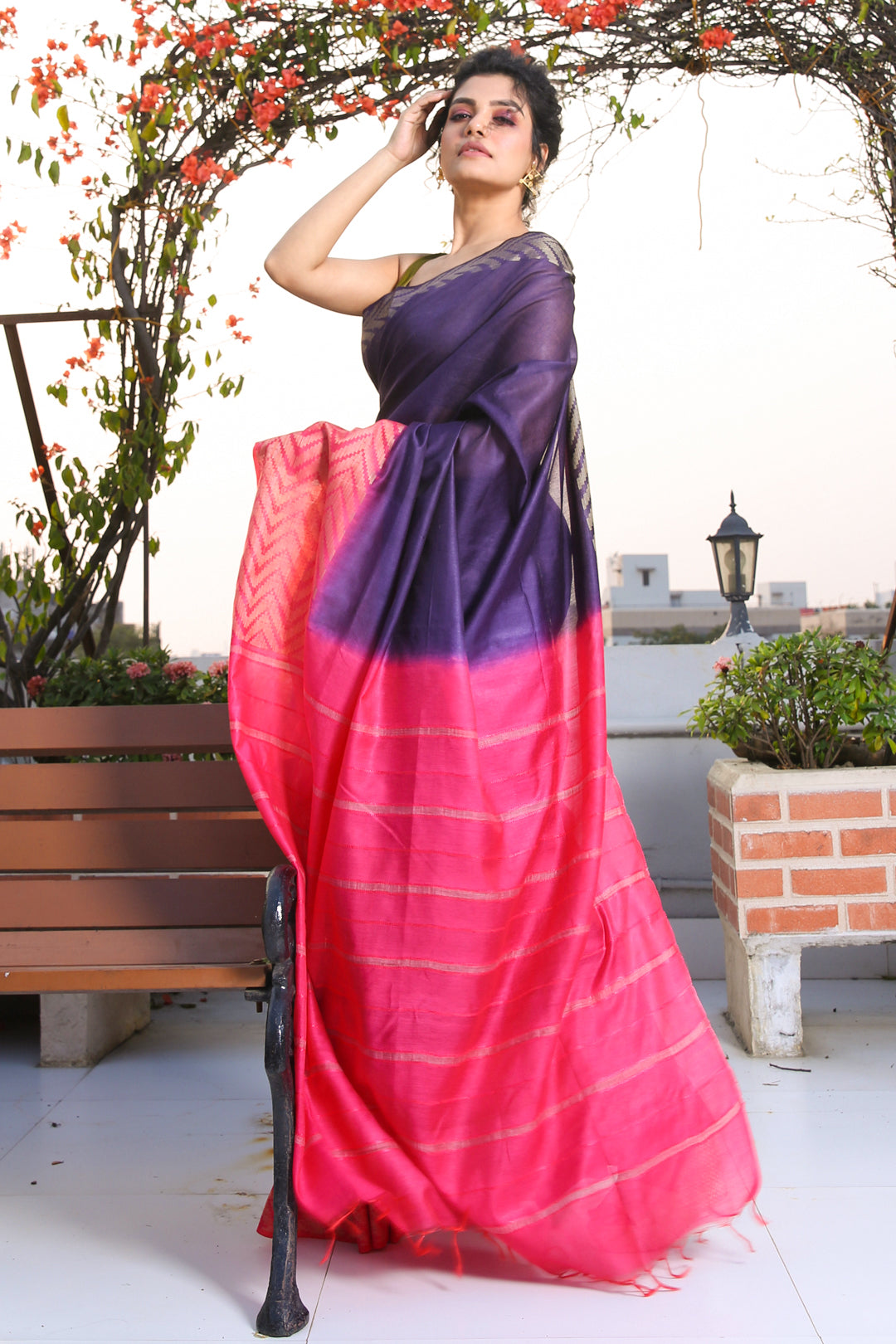 Look bright and beautiful in this purple blended silk saree. Its pallu and border in pink have woven zari patterns and stripes for an elegant appeal.
