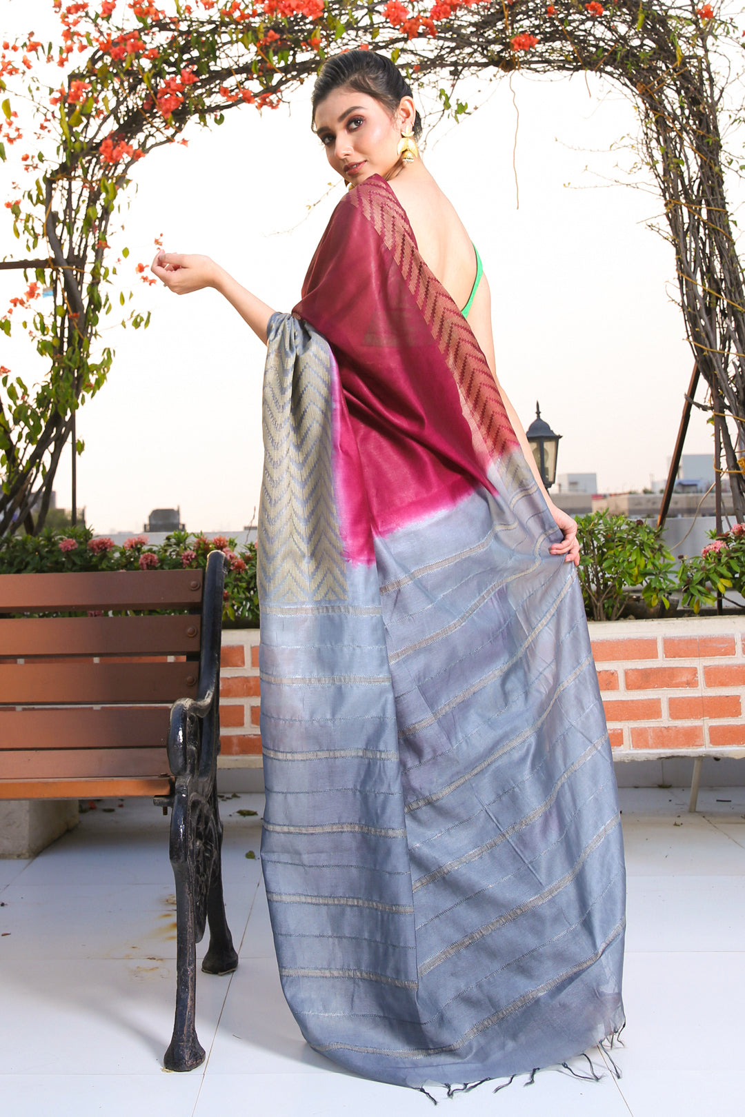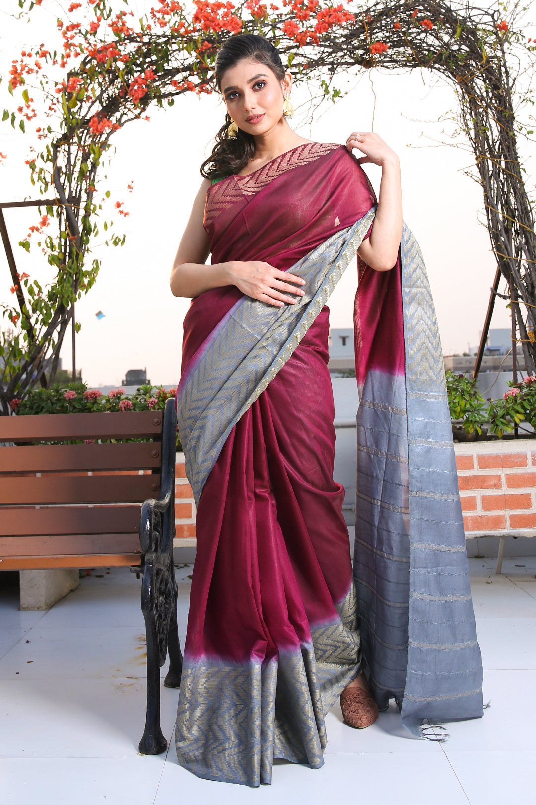 Get a bold and loving look in this wine blended silk saree. Its pallu and border in grey have woven zari patterns and stripes for an elegant appeal.