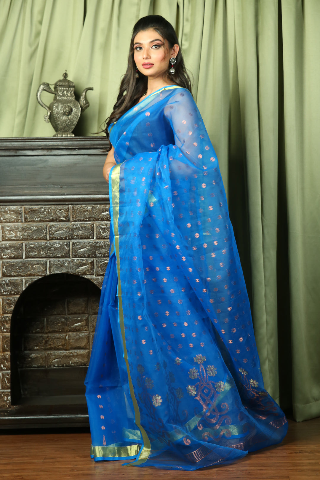 Carry yourself in poise in this blue silk blend saree. It has zari borders with temple motifs. The whole body has woven buttas. Bold floral motifs are woven in the pallu to complete the look.