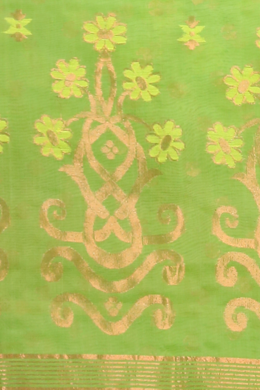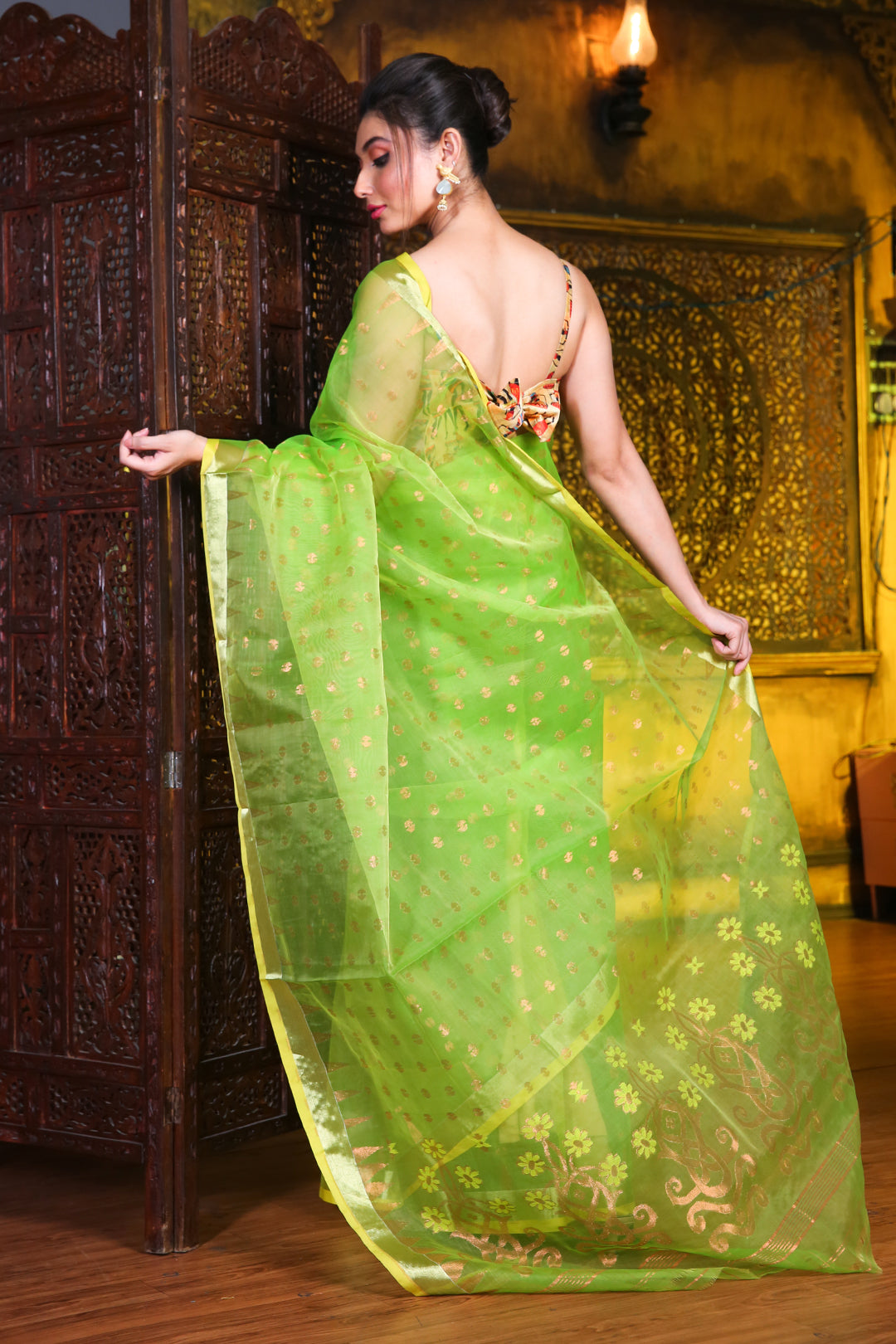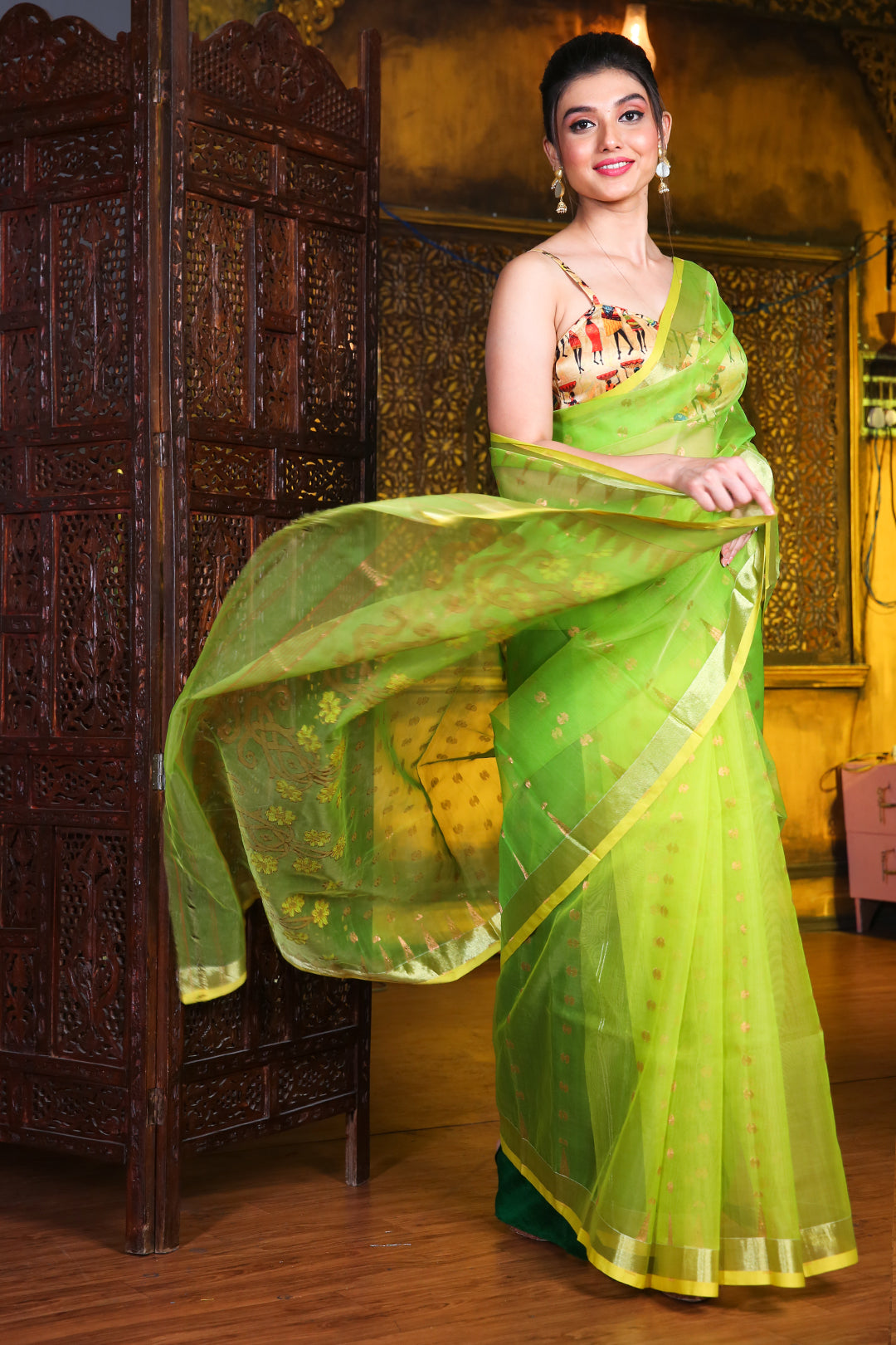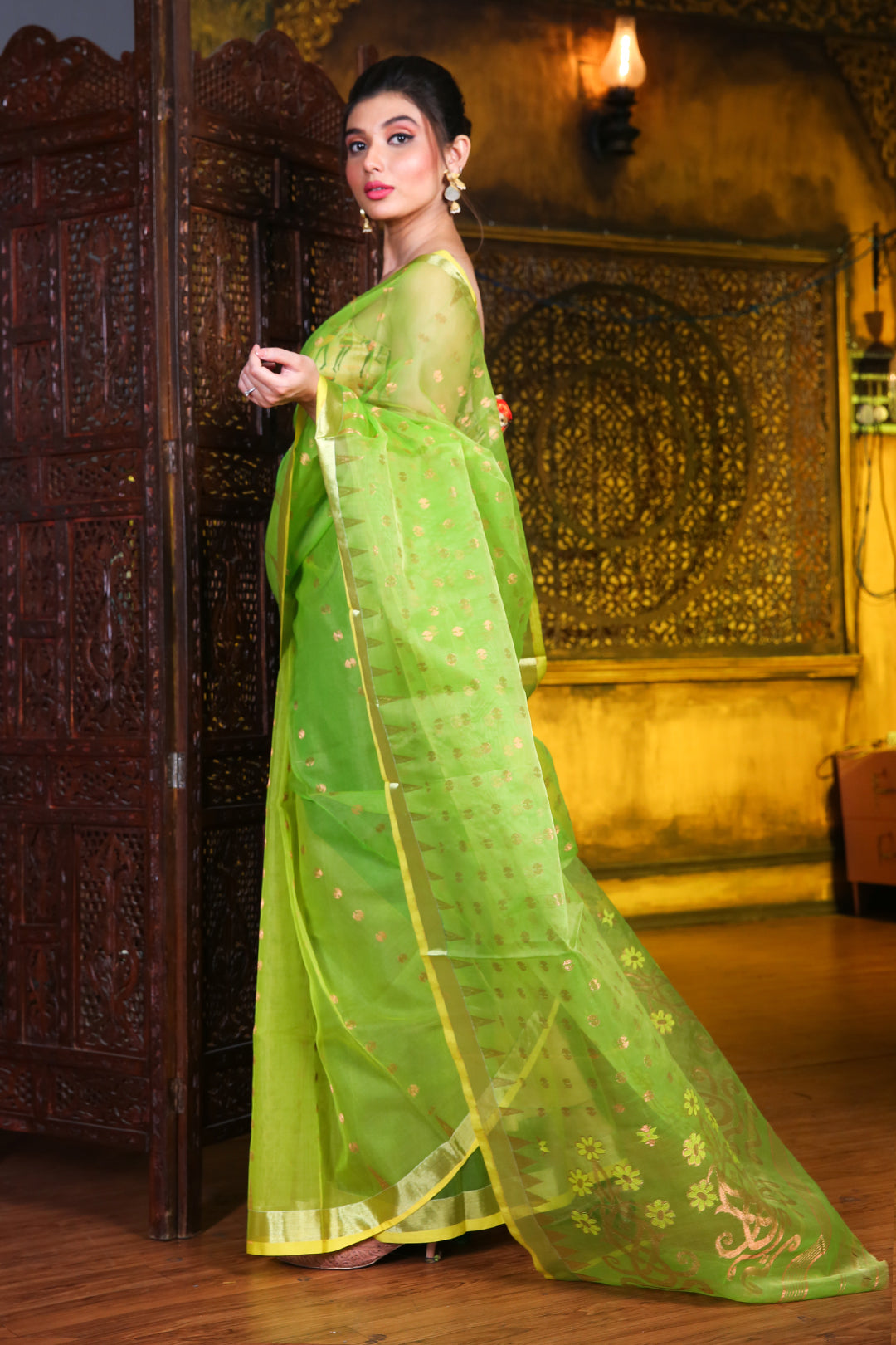 Lush and loving is what you will look in this green silk blend saree. It has zari borders with temple motifs. The whole body has woven buttas. Bold floral motifs are woven in the pallu to complete the look.