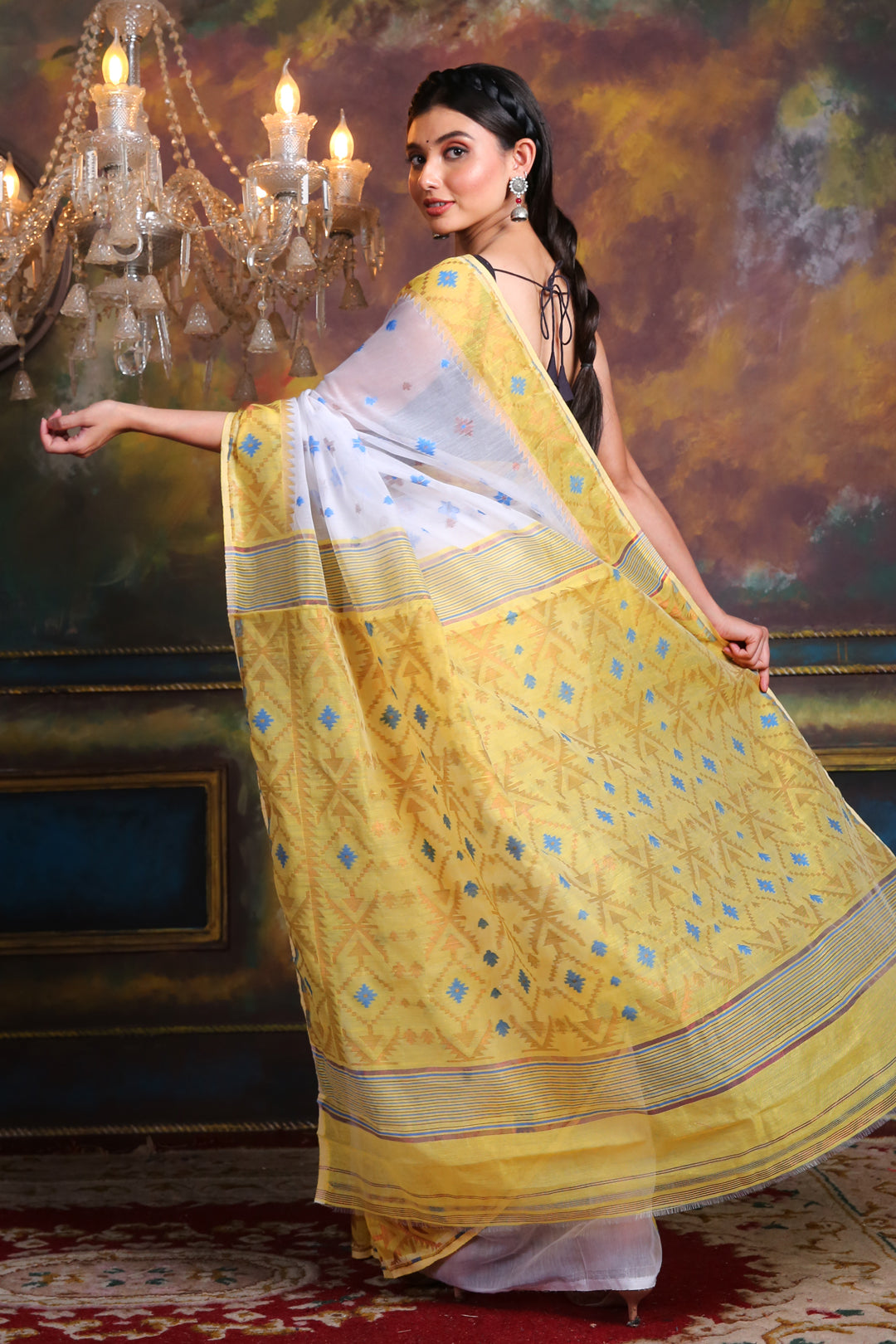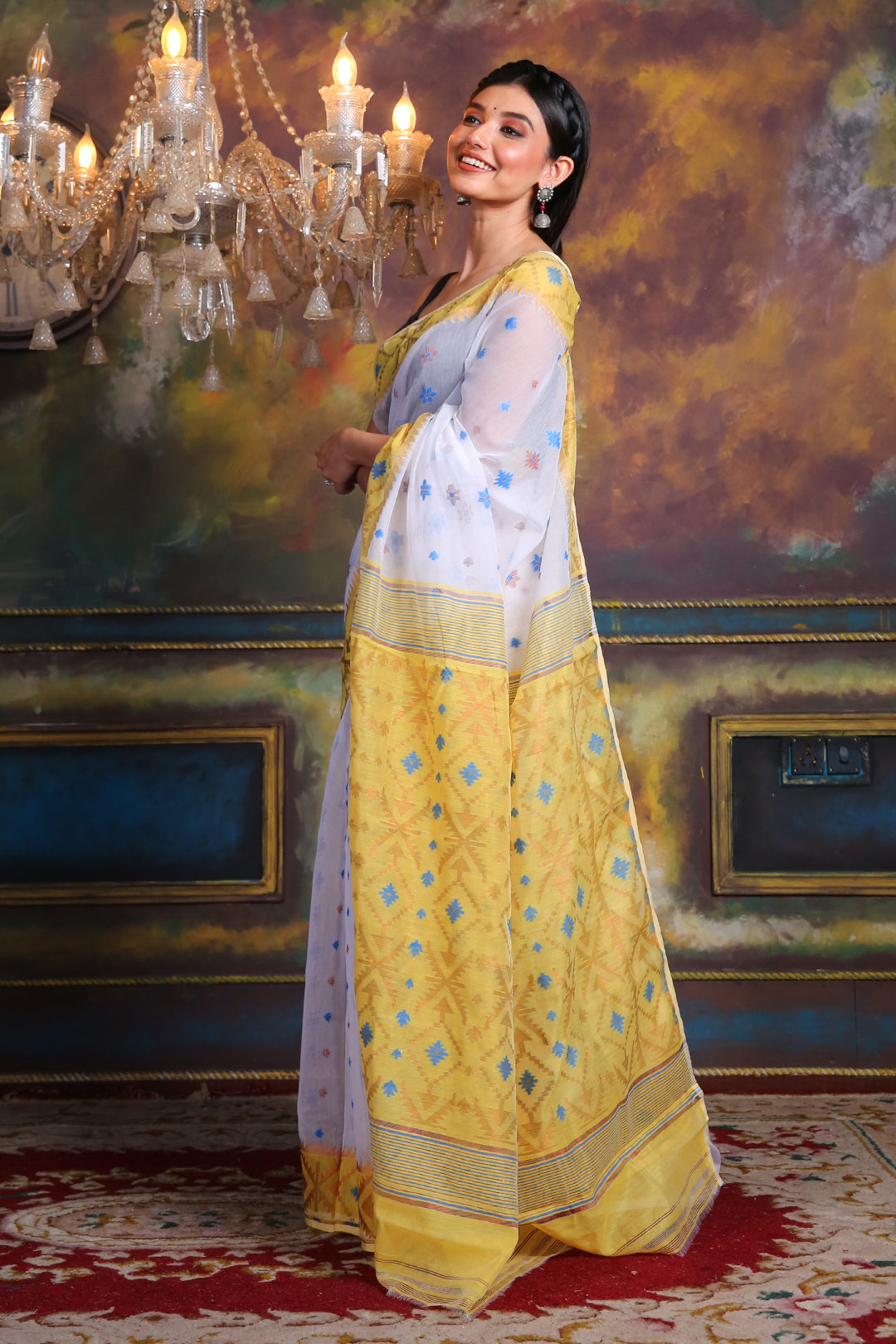 Get a polished look in this white silk cotton saree. The whole body has woven motifs. The borders and pallu in yellow have woven patterns to bring the whole look together.