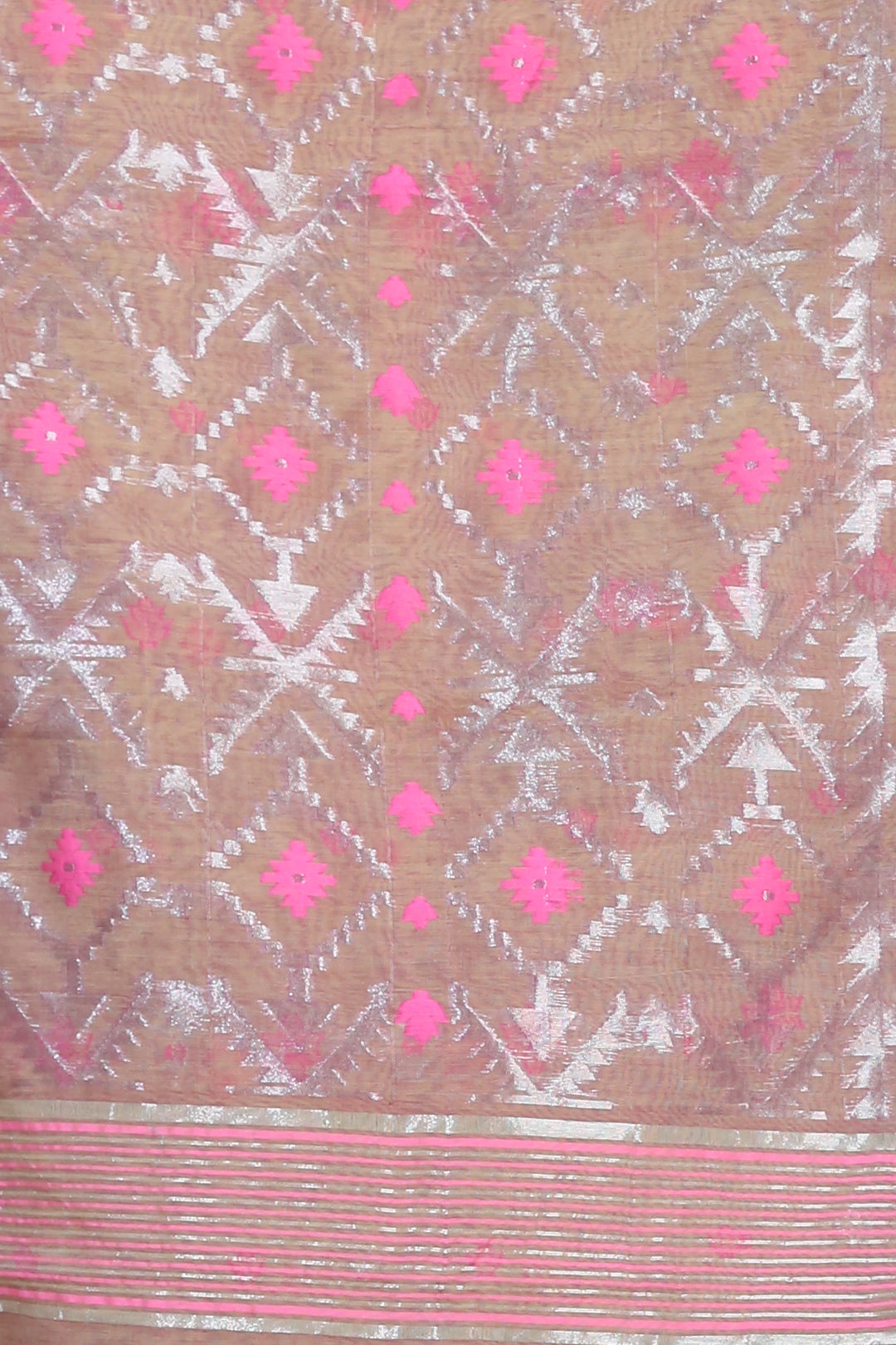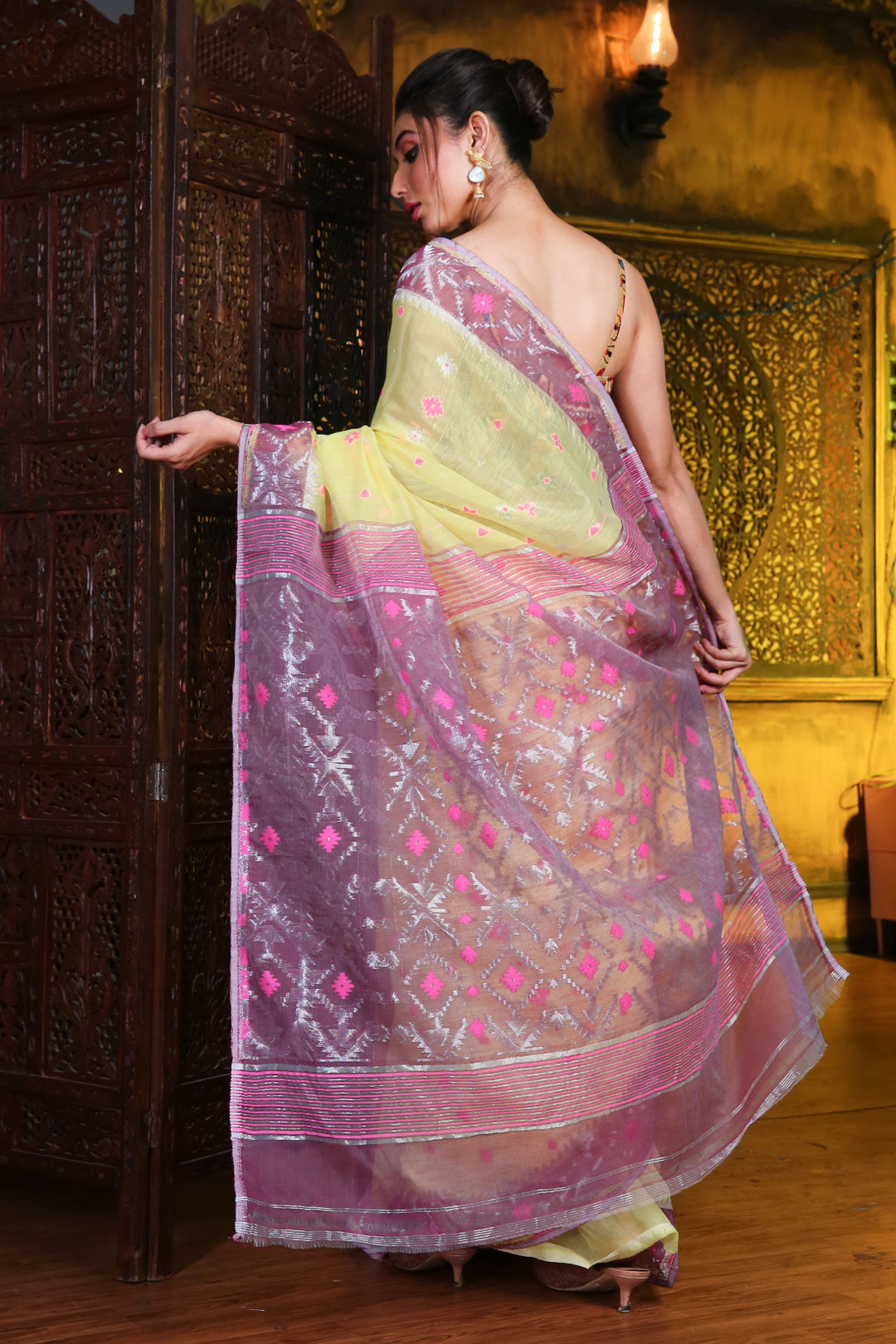 Uniqueness will ooze out of your look in this yellow silk cotton saree. It has small motifs woven all over the saree. The borders and pallu in pink have woven patterns along with zari to complete the whole look.